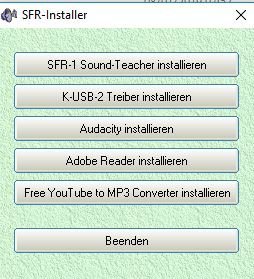 This is the SFR1 version but the others are similar. Click the SFR-1 sound teacher installieren to install the SFR1 soundteacher program. once done, if you are using the USB program cable then install the K-USB-2 driver. Audacity is the program for chopping up and exporting sounds and the last item is the you tube converter.