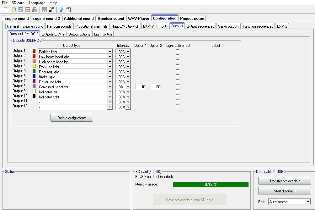 Check the engine sounds tab - its simple and probably does not need changing. Skip the random sounds and go to proportional channels. you can see that they are all allocated in some way. The outputs tab shows how the lights have been allocated.