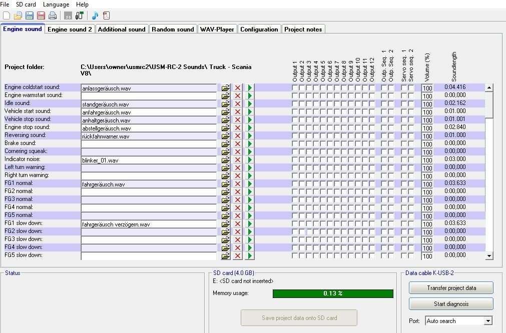 Now you are set to start on the module! I suggest that you run the appropriate teacher program and take a look around. For the USM-RC-2 I have loaded the Truck - Scania V8_1 file as this is the standard project that comes with the unit on the SD card, but any of the others will do, they are all basic and fairly simple.