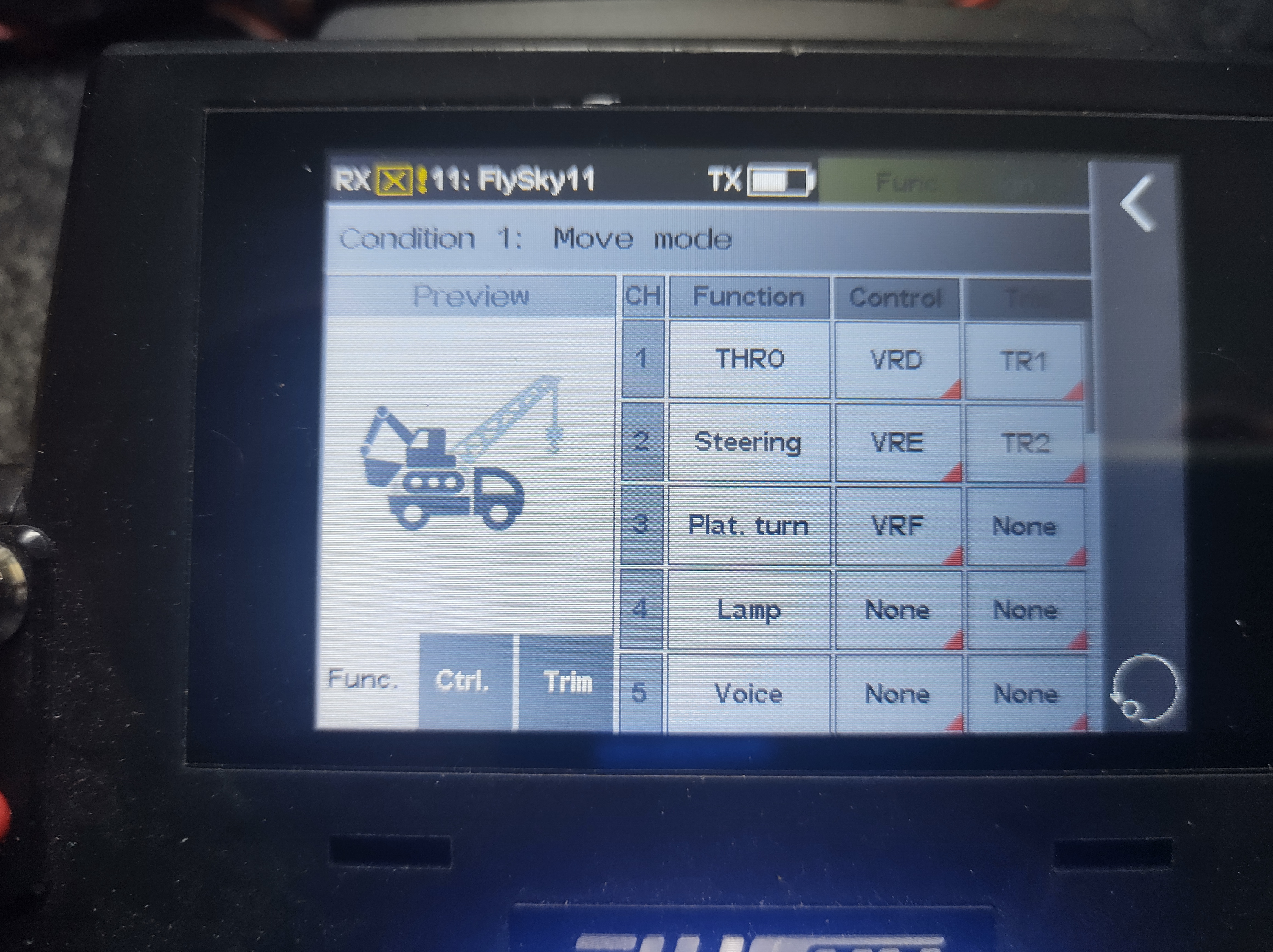 Having selected the base functions thath we need we can now assign things so use the arrow to get back then select Function Assign, here you can choose the channel for the channel for the function, its control and its trim (if any).