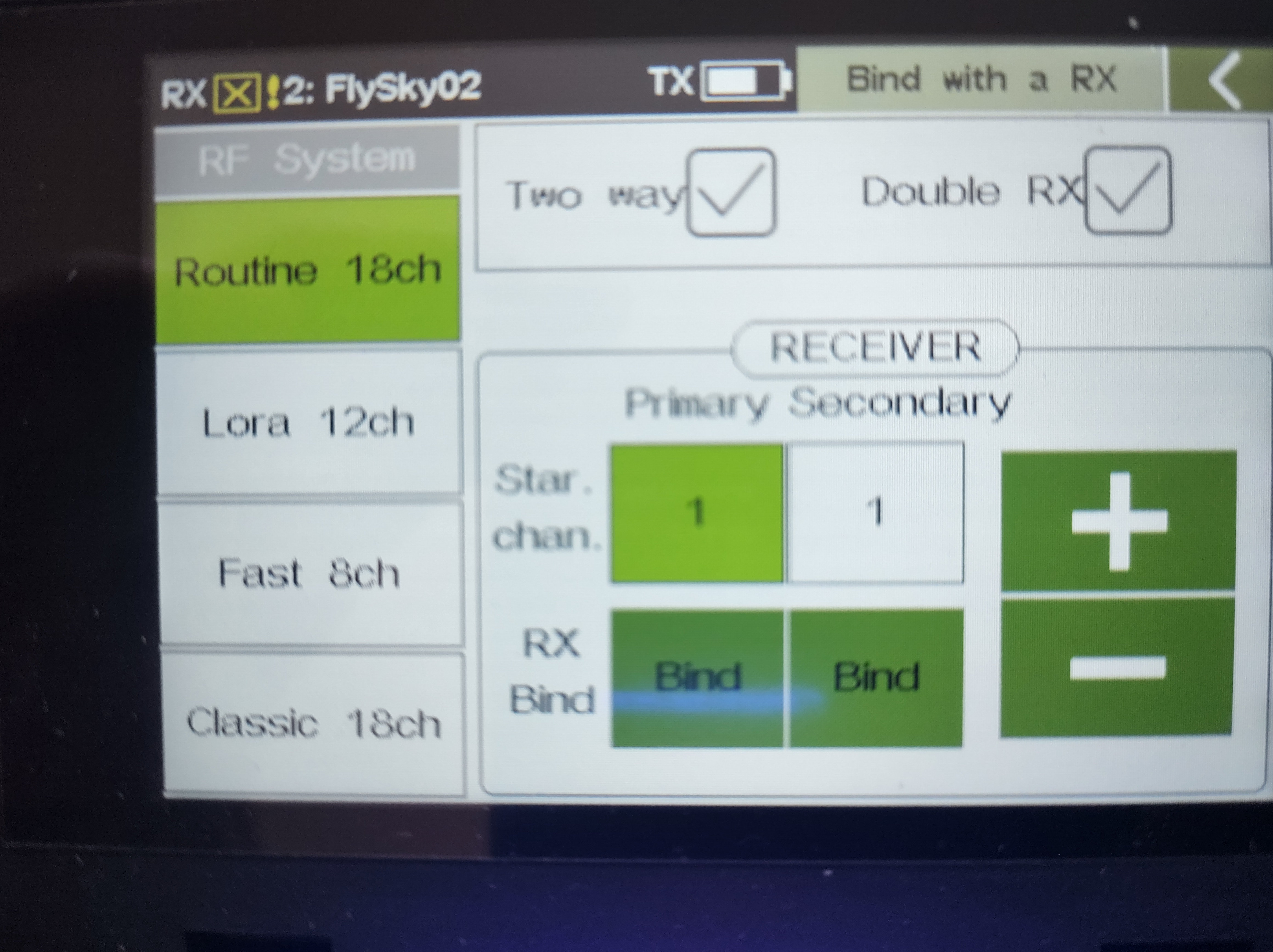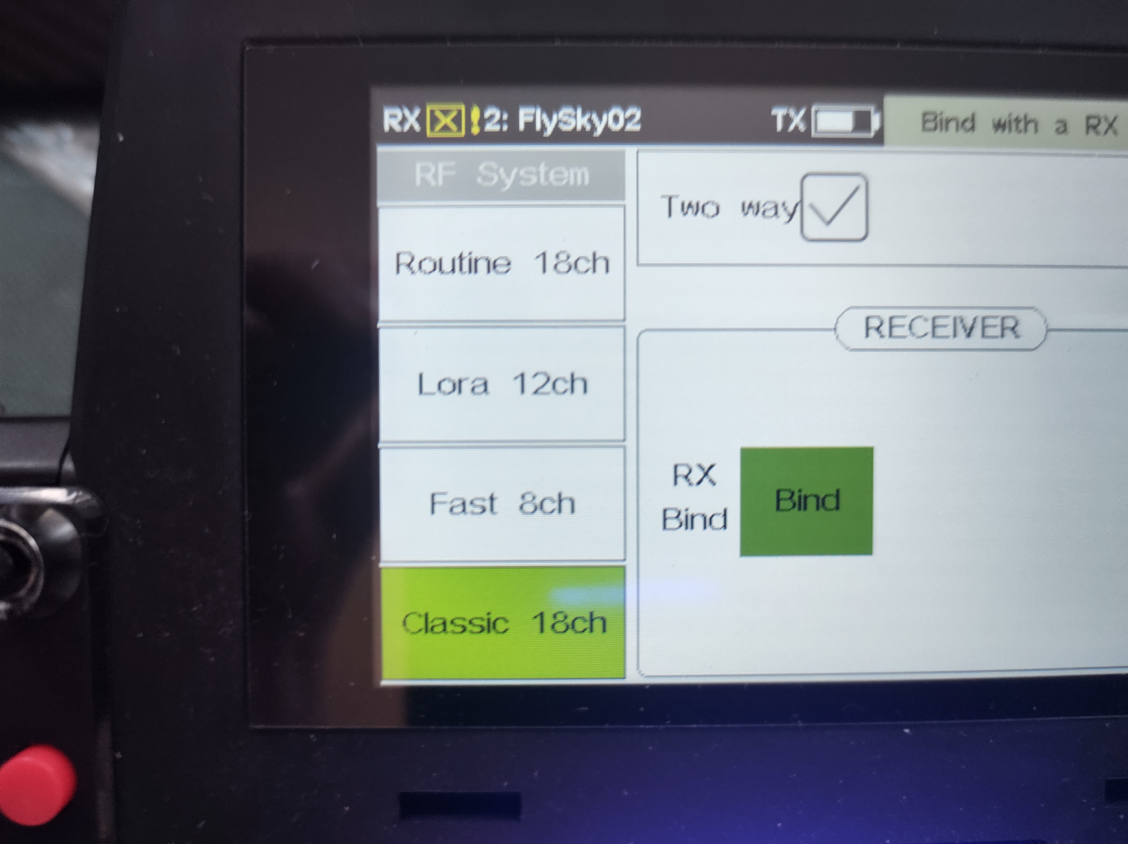 The RX set up menu has a few different menus that we will come back to including RX protocol and Failsafe. For now go into the Bind with a receiver menu , and you will now see how a simple bind is not that simple.