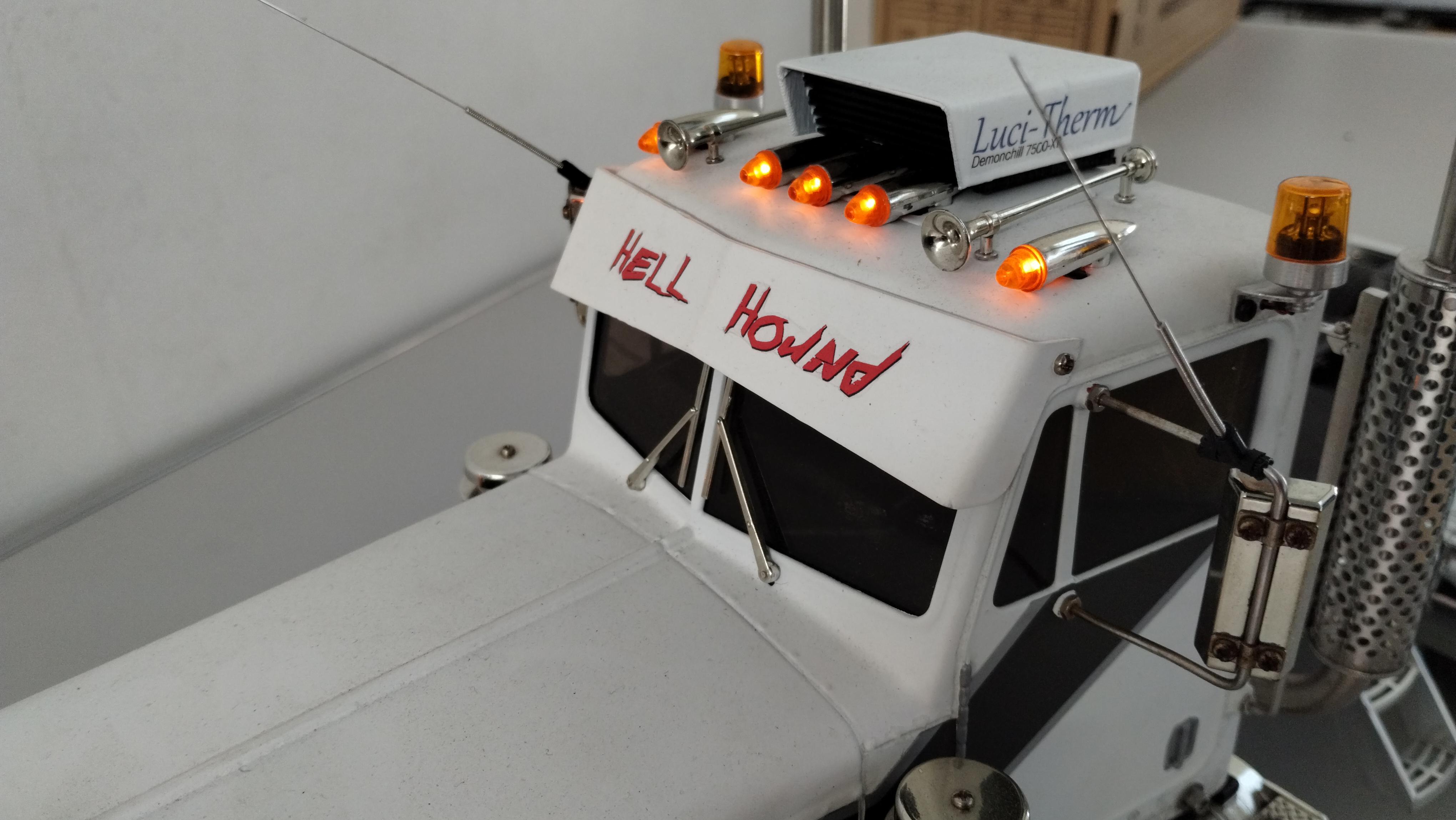 Now starting at the front There is a Texas slab bumper fully lit. Next you come to CNC Ali Trilex wheels, Up to the visor which is not obvious as its not shiny metal but it does set the cab off. Above are carson beacons. Then working rearward is a blocky US style aircon unit. Stainless stacks. pogo stick airline guid back to the rear with watermelon style lights.