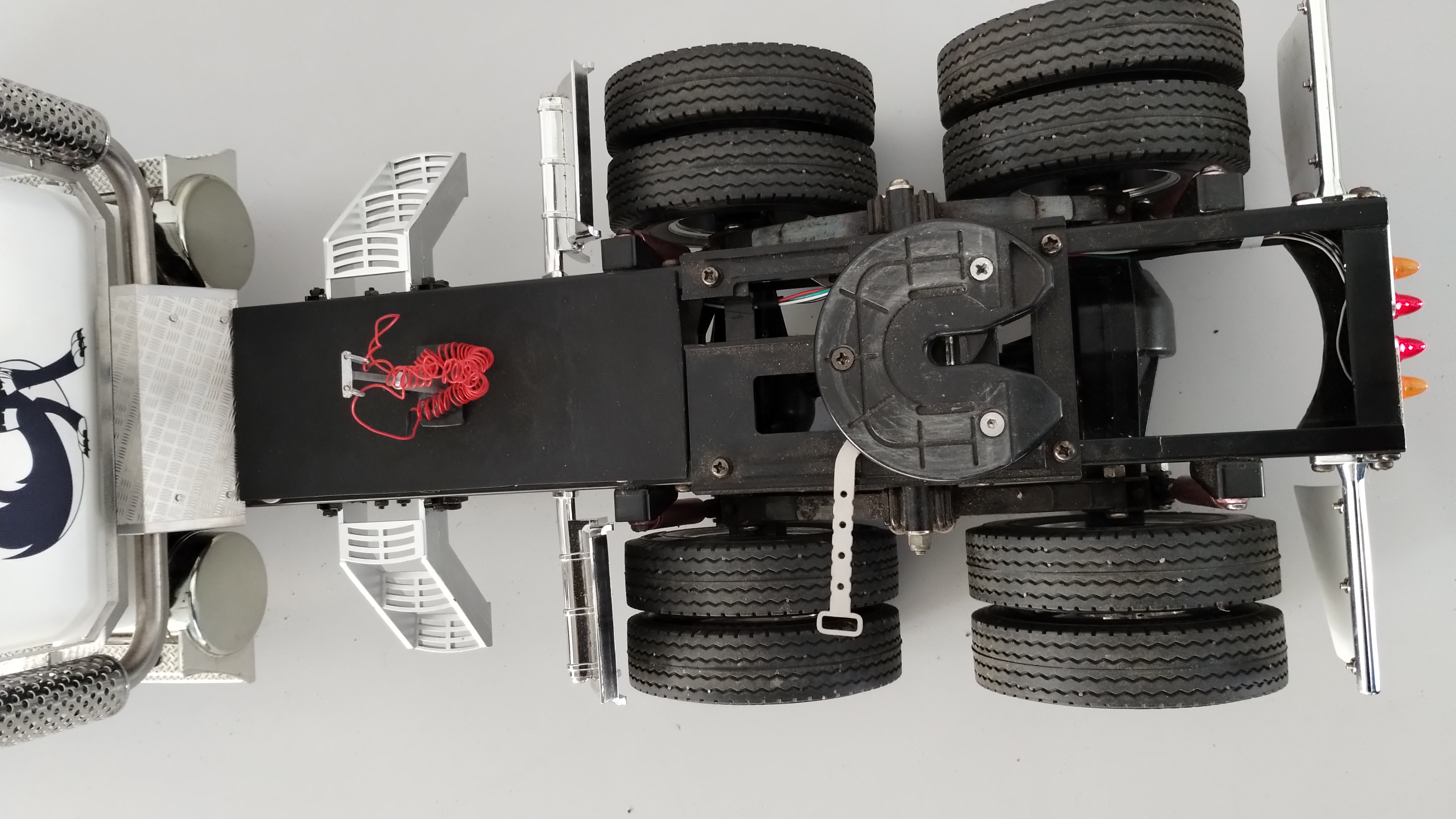 The drive train is always hidden, this has standard Tamiya gearbox with a poison motor but with an added 3:1 planetary reduction box. That gives it a bit of pulling power.