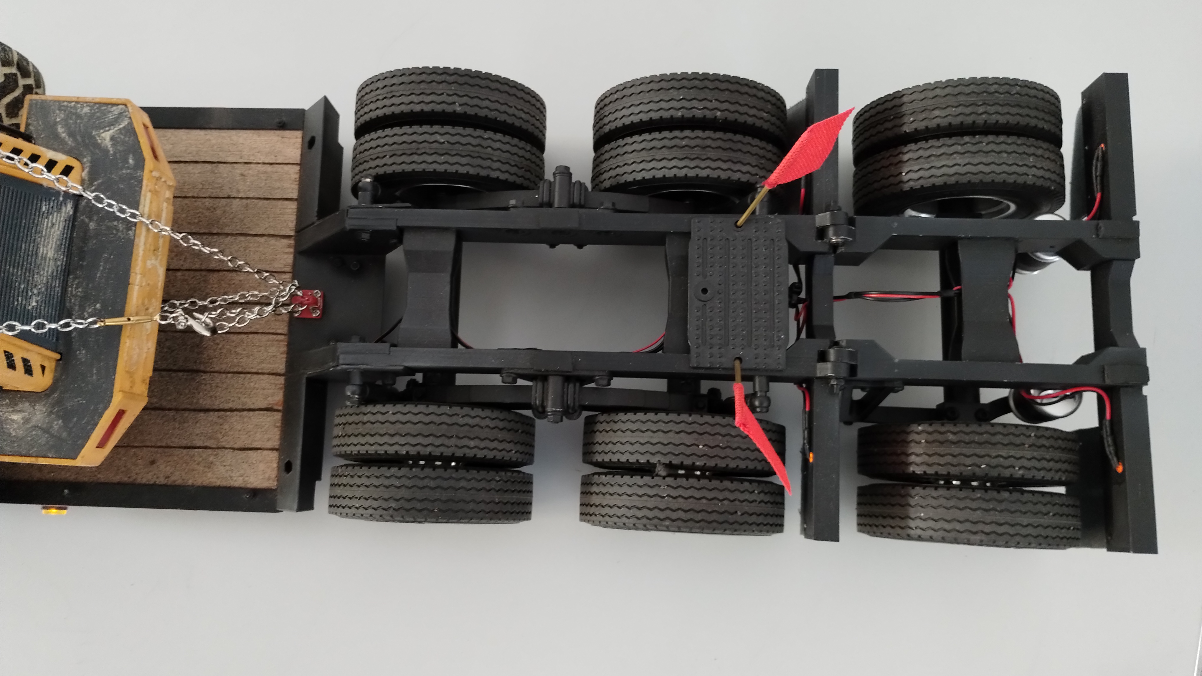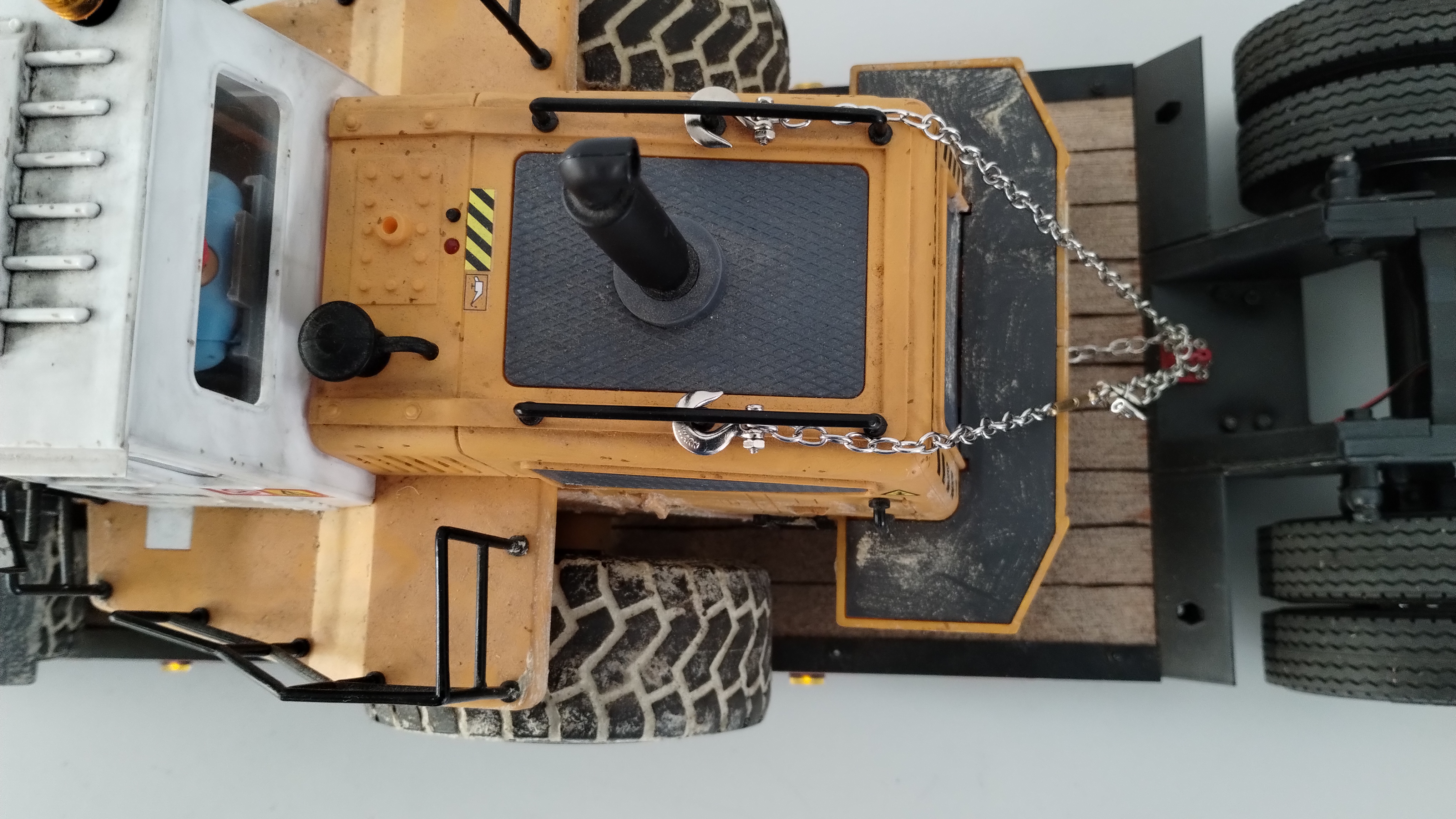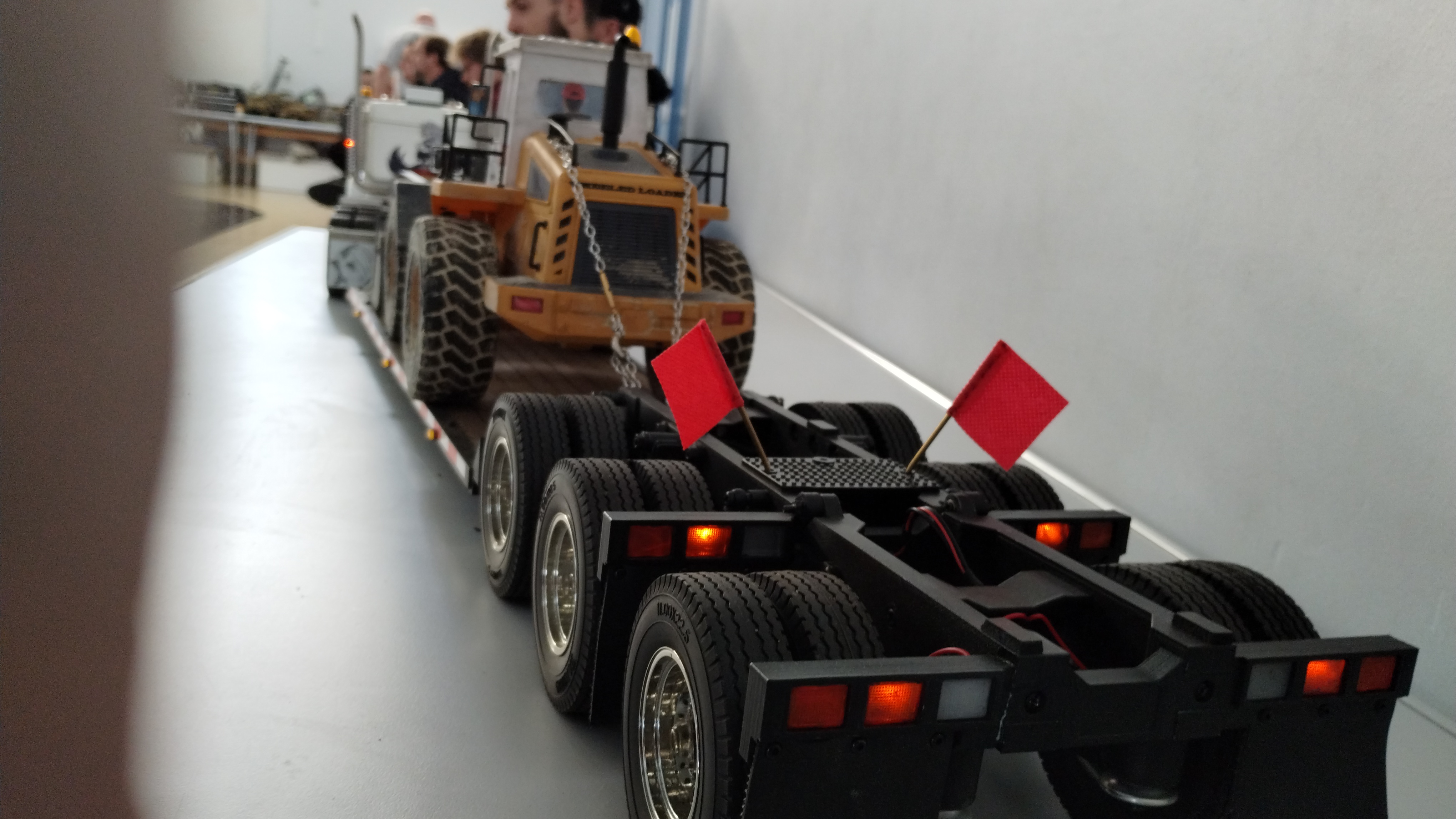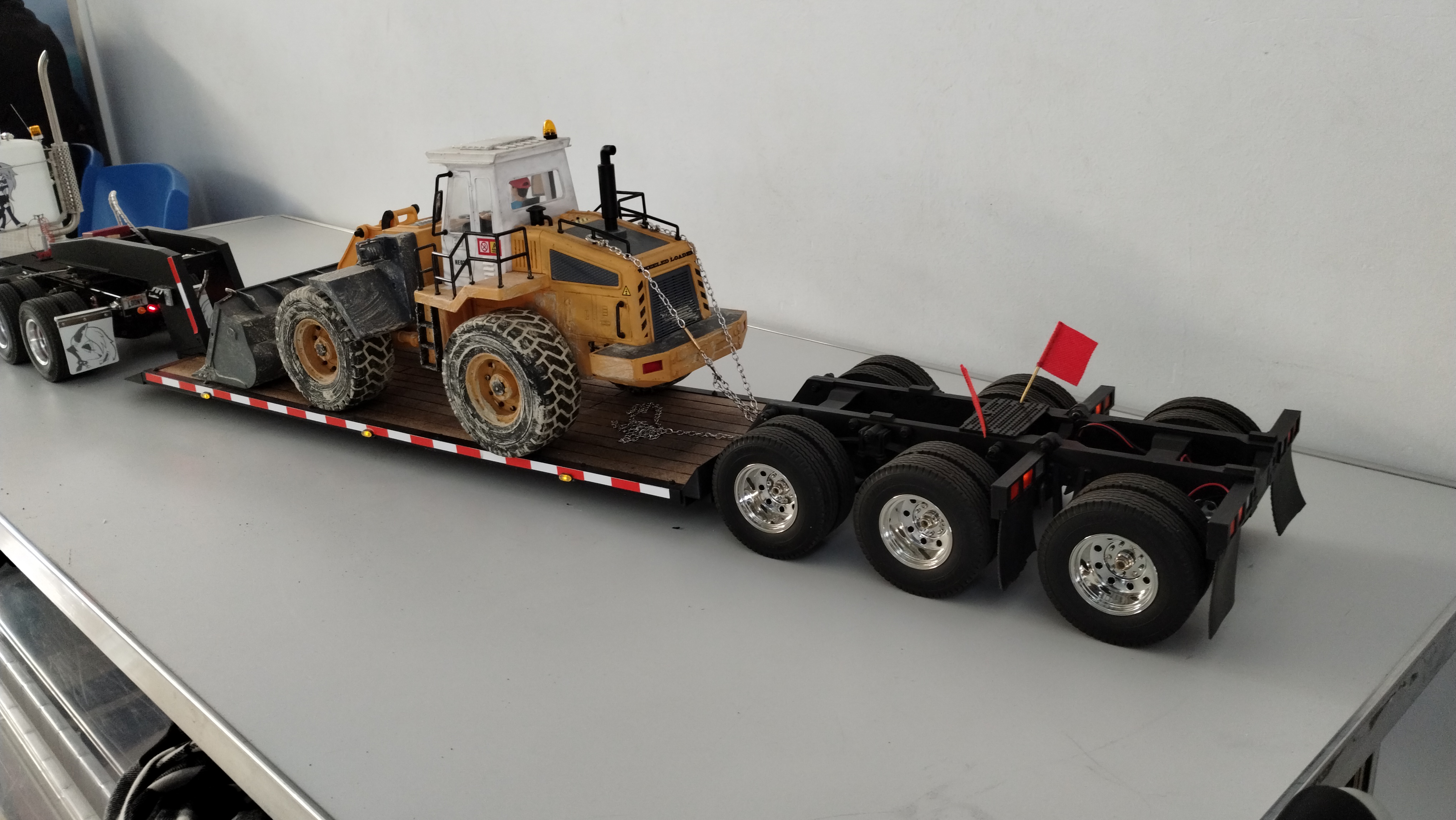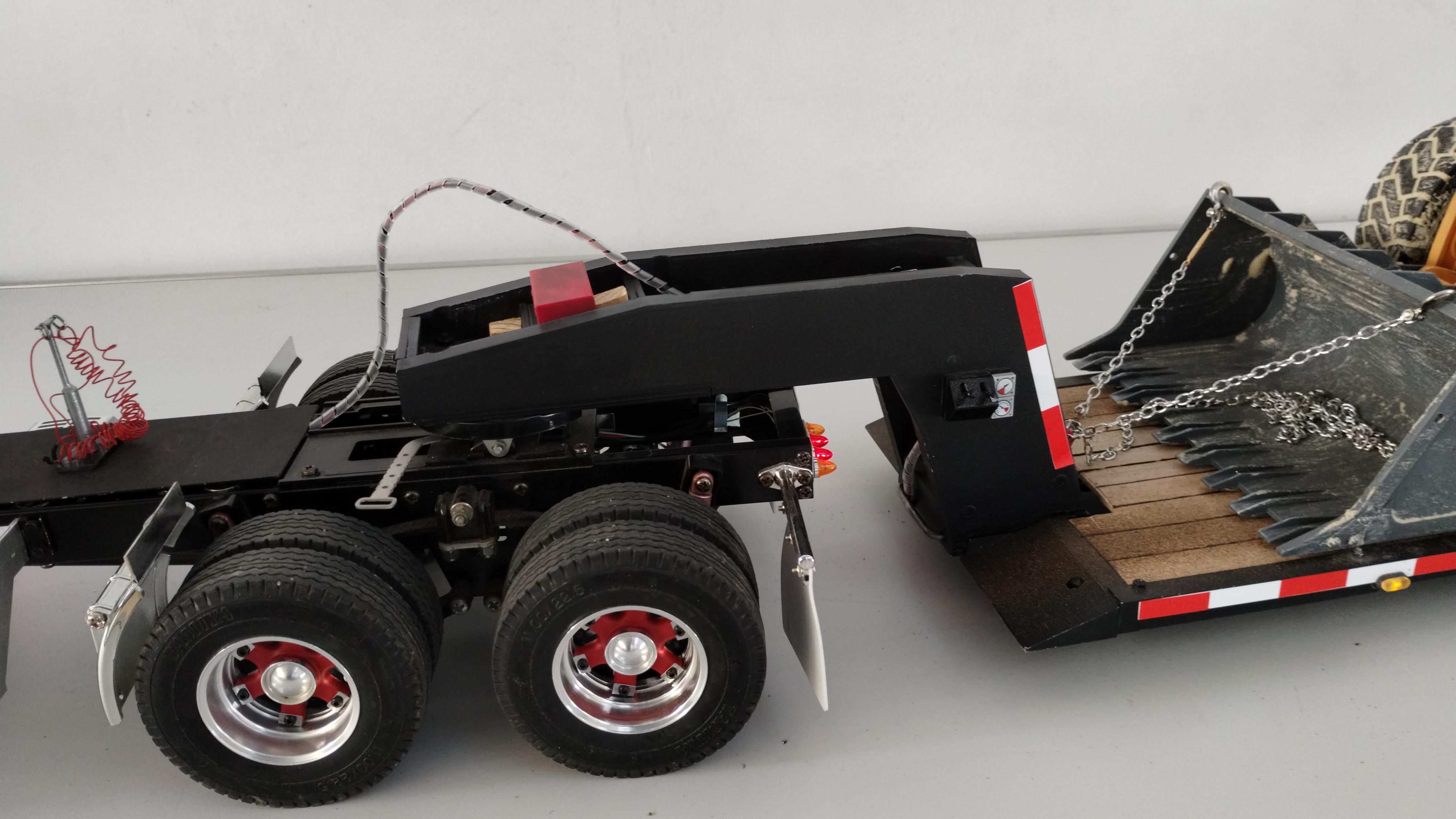 Rich chose a low loader for his rig to pull, its a 3d printed one originally designed to take a Tamiya flat bed deck. This has an Aluminium deck that rich scratch built. The load is an EE shovel loader. The trailer is an understated black in contrast to the truck. But have a closer look. Only load I have seen that is properly tied down.