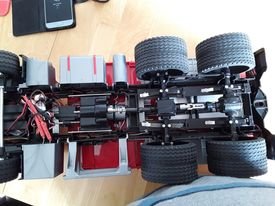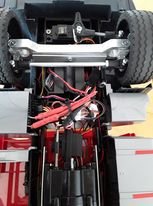 It is based on a Bruder MAN tipper and was purchased ready converted. It runs, the tipper works, it has lights and a beacon bar. Bruder trucks don't have any running gear and the wheels are hollow on the inside face, they take some bashing as they were designed for children. From the pictures you can see the front axle, it is hand crafted from a piece of Aluminium bar and it has a simple central pivot. there is also simple stub axle holder on a pivot for steering. The rear drive looks to be from a Chinese toy rc truck and has limited suspension. The tipper runs on a small motor via a flex shaft and scissor gear.