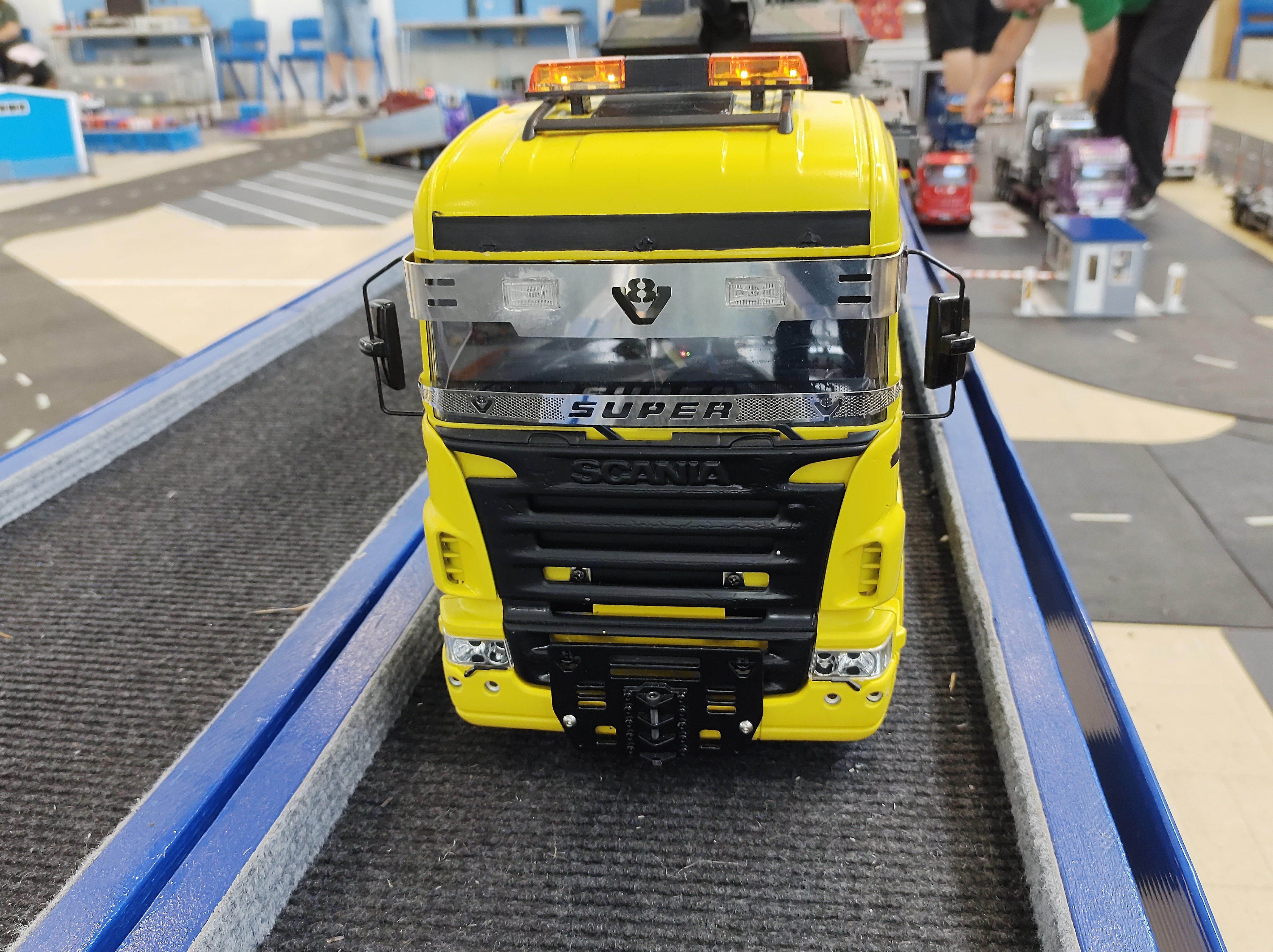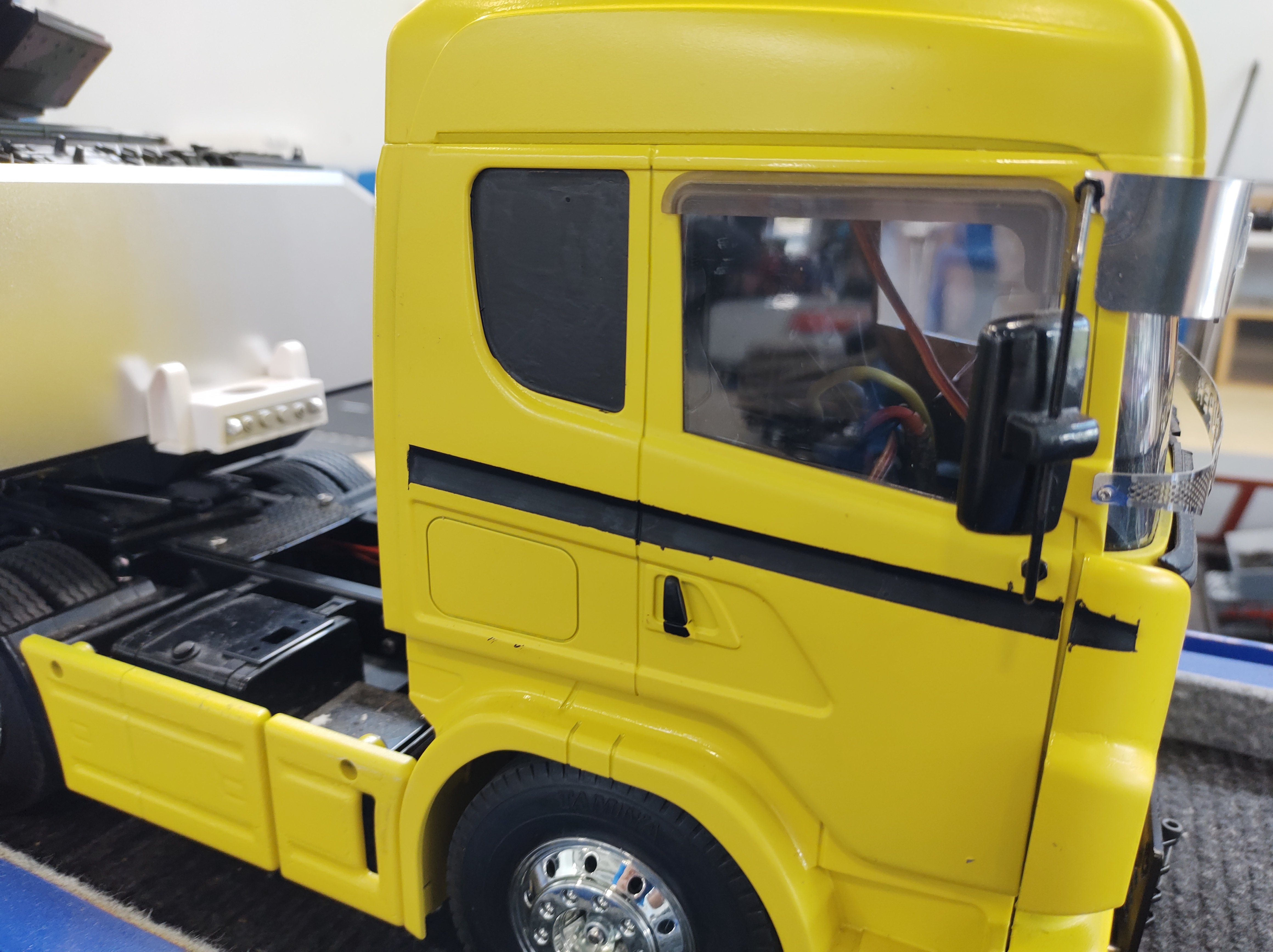 As you will have guessed it is a work in progress and at present is mostly standard but does have a fitted sunvisor and stone guard. It is quite striking in yellow but the little bit of black highlighting makes a huge difference. The rear end is standard Tamiya but does have a rear deckplate fitted.
