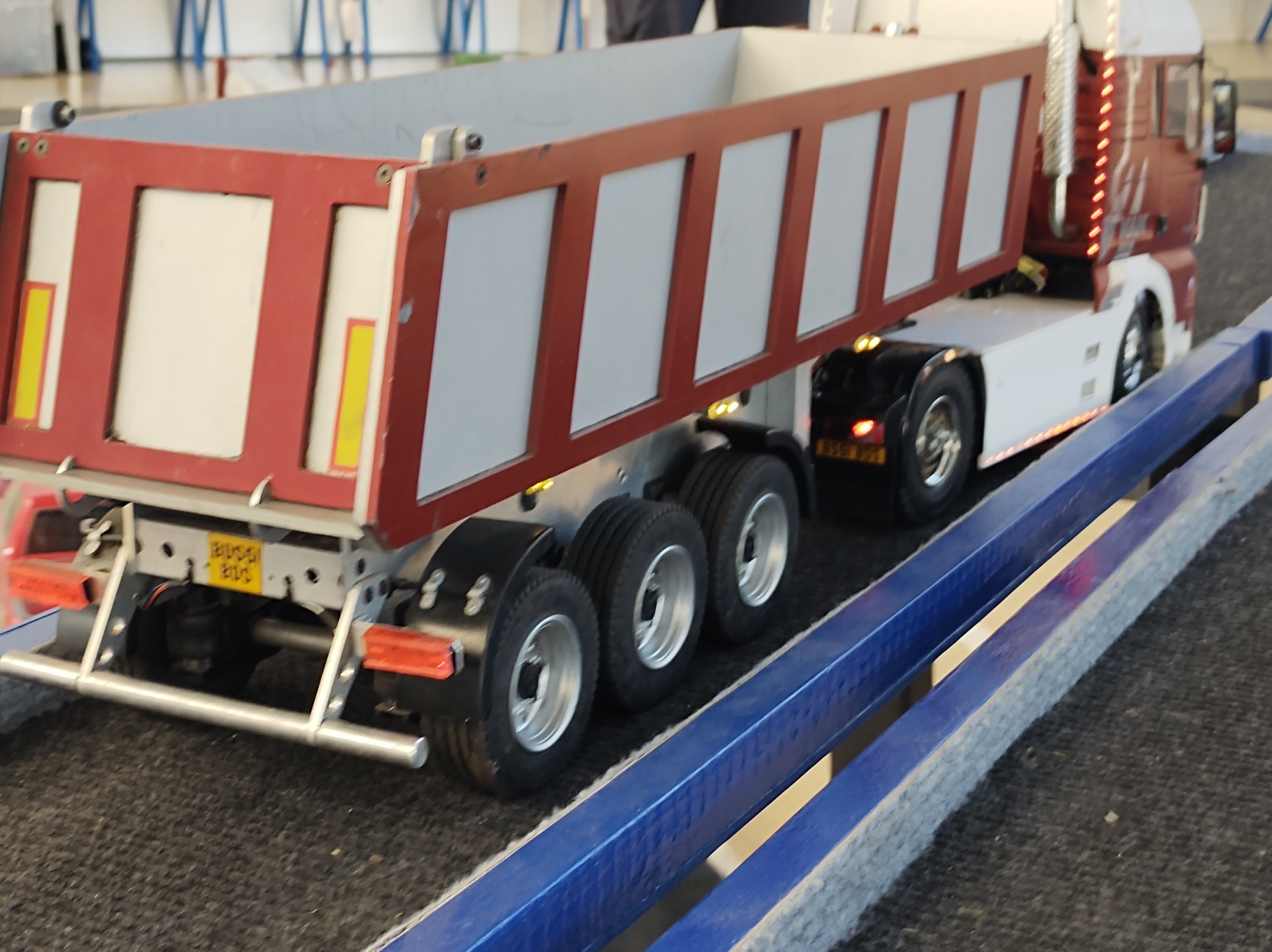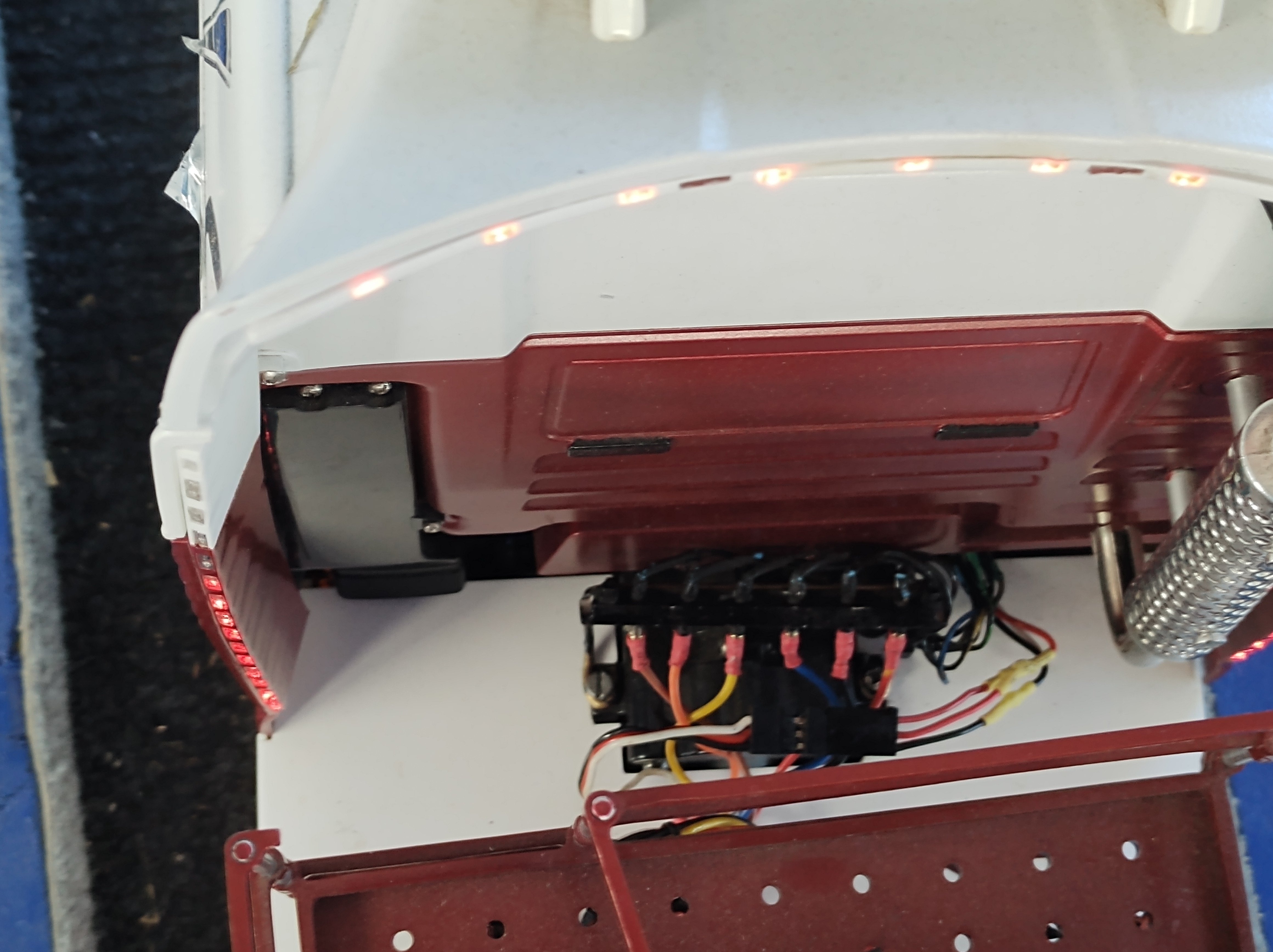 The trailer is one of the original Carson tipper trailers together with a Carson actuator. Originally this was driven by a separate battery and a second receiver (bound to the same model as the truck). The receiver basically ran an ESC for the tipper mechanism. A few years ago Barrie rewired the truck so that the trailer could be driven by direct connection via a number of plugs ( which can be seen in the pictures).