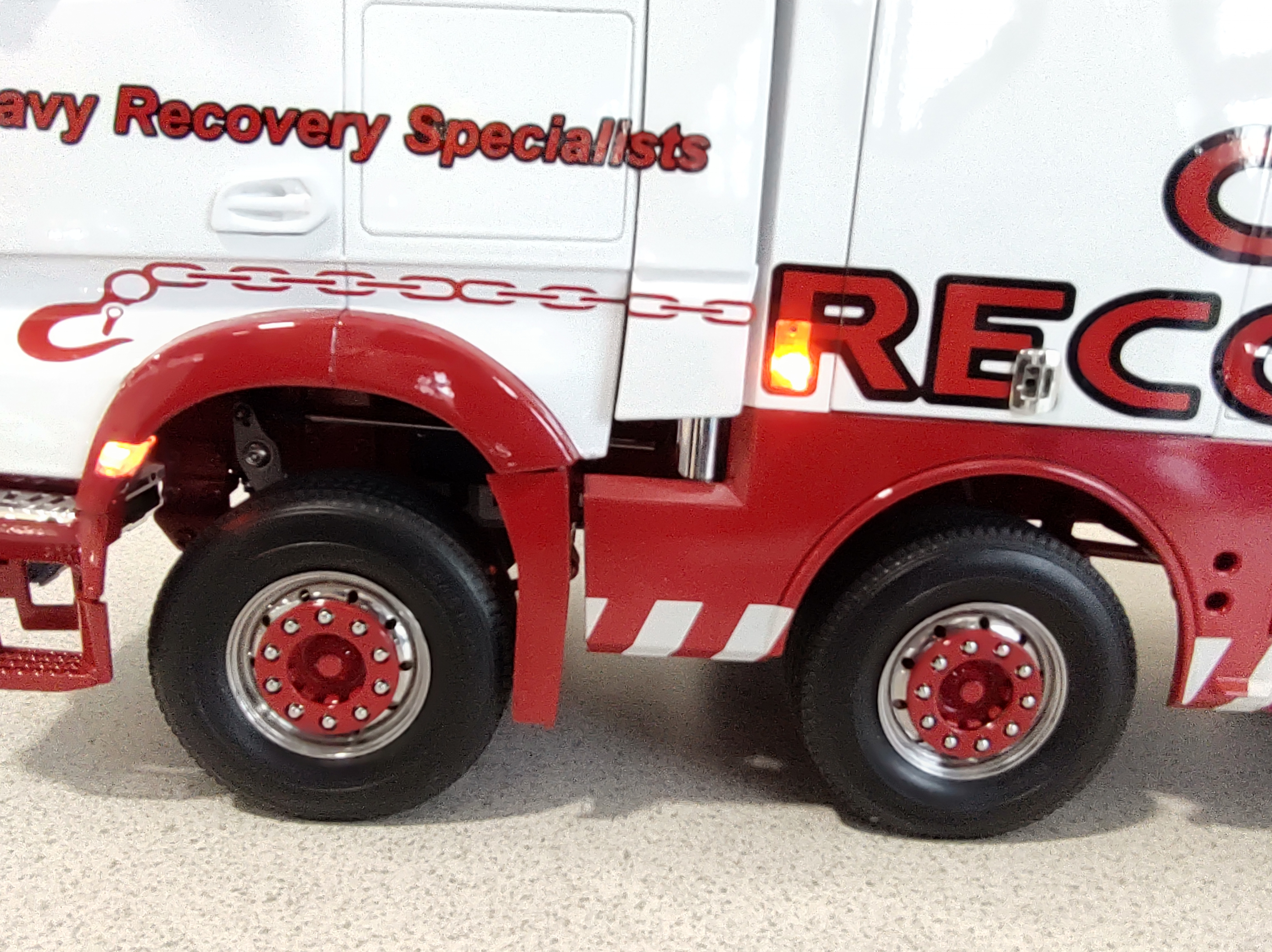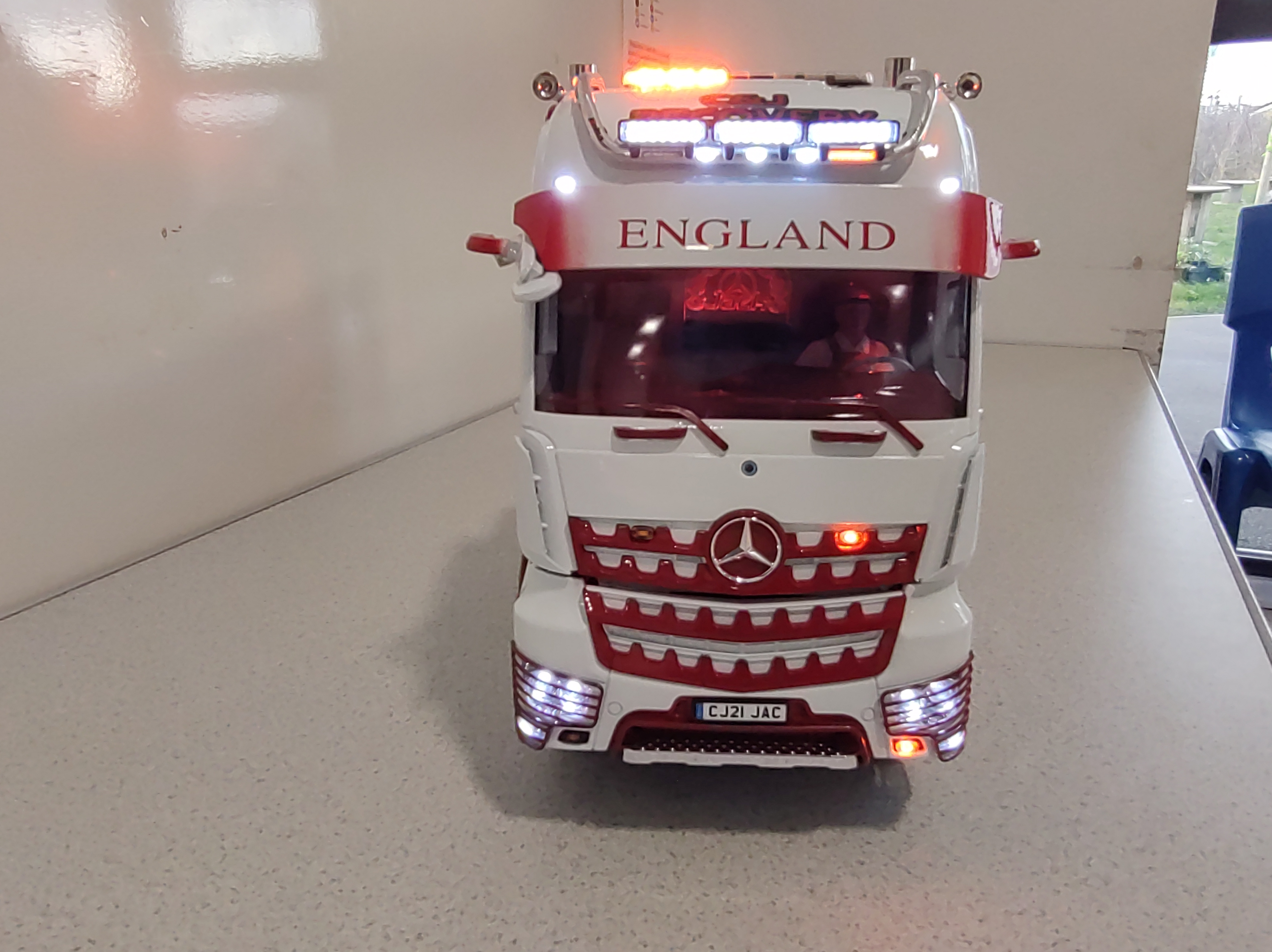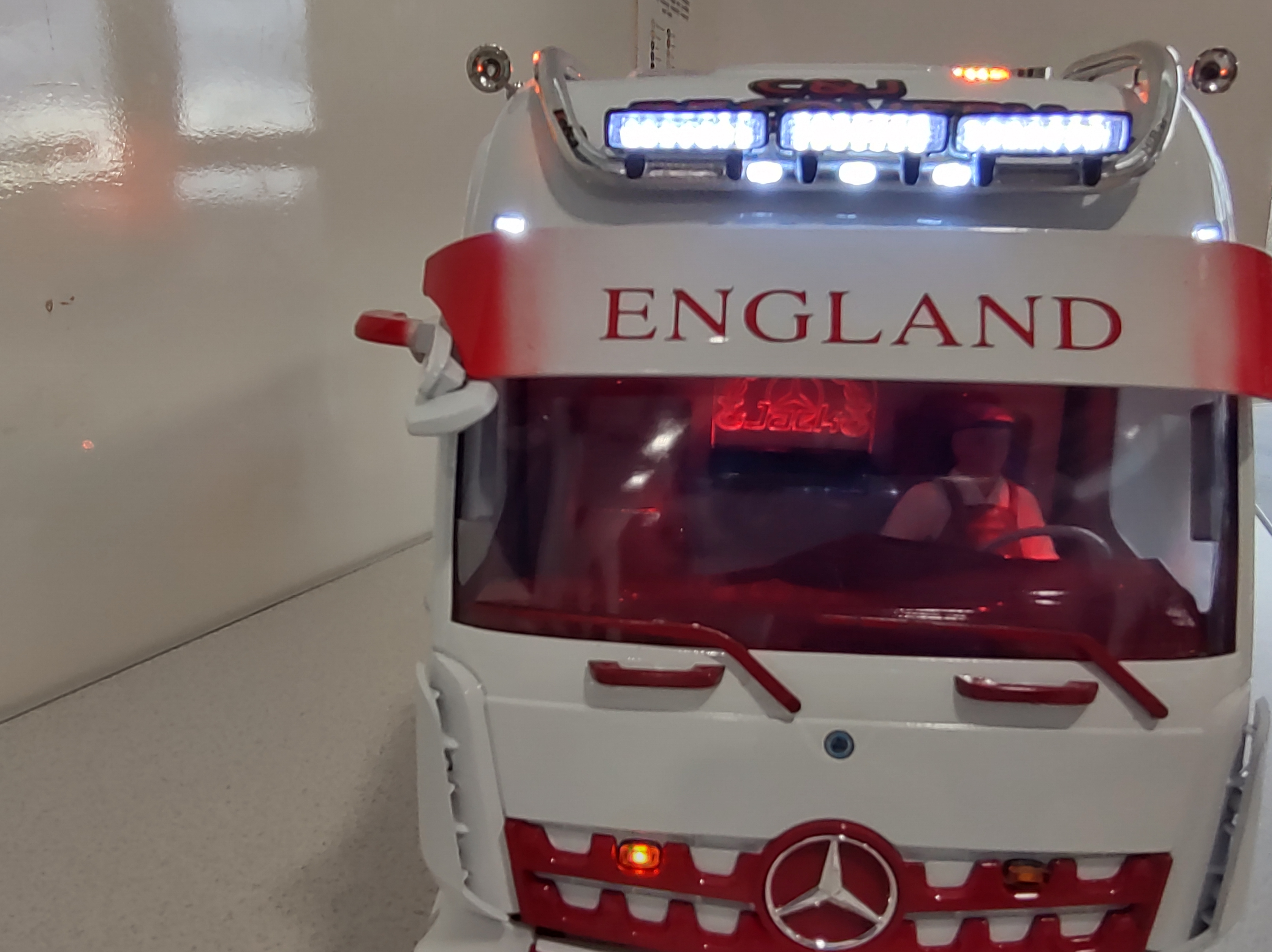 Tamiya's truck is based on an Actros cab but the first change to this truck was the use of a OEM Arocs grill. More additions come in the form of a roof bar from Miroslaw Gorski, two Verkerk beacon bars, Alloy Wheels with in hub reducers, Exhaust stacks, working side marker lights with strobes and more inside the cab.