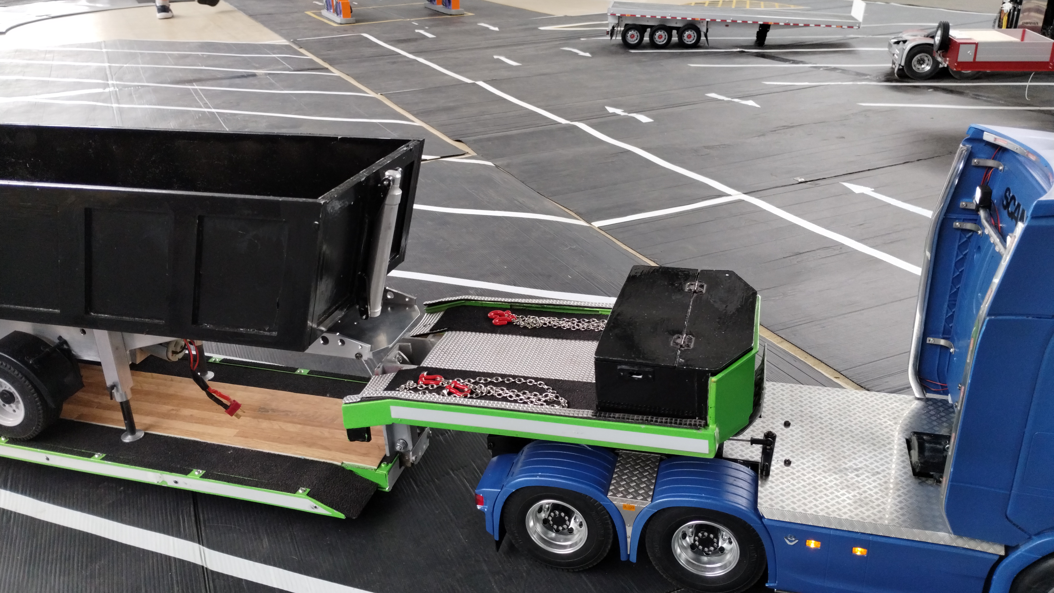 The truck sports a basic GT container light kit ( with bluetooth connectivity for the trailer). A hobbywing 1060 ESC provides the motor control. No sound unit though.