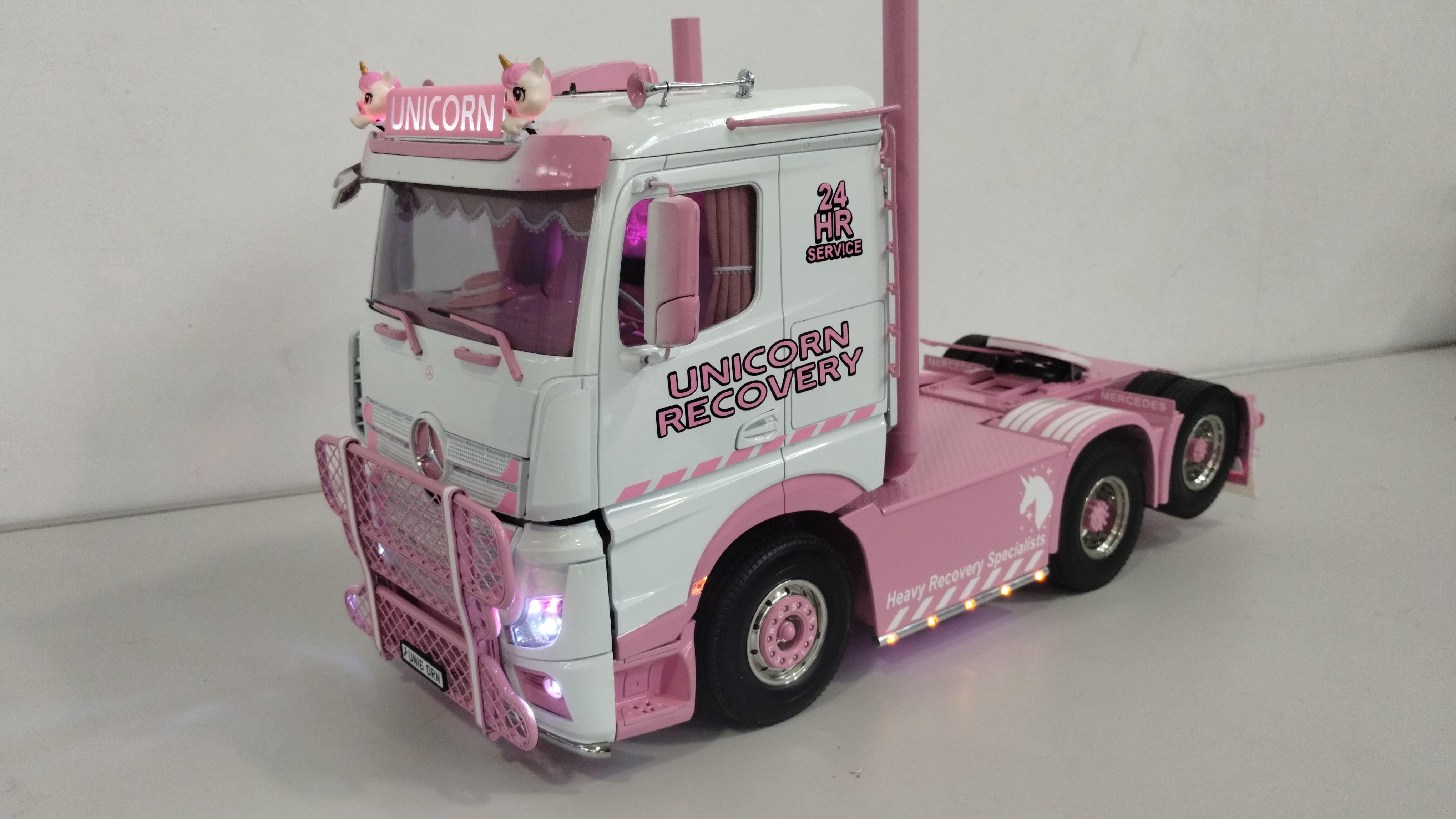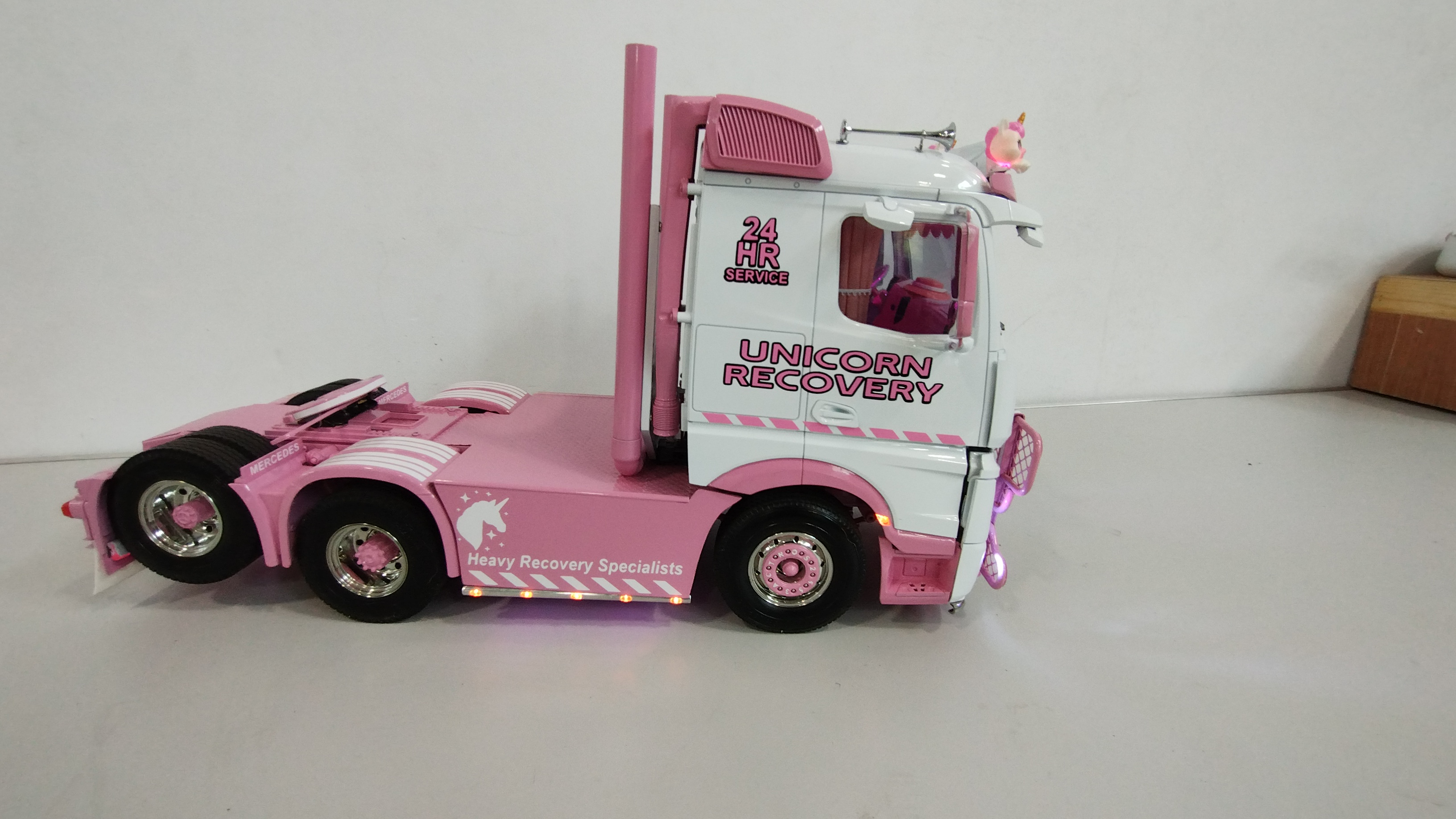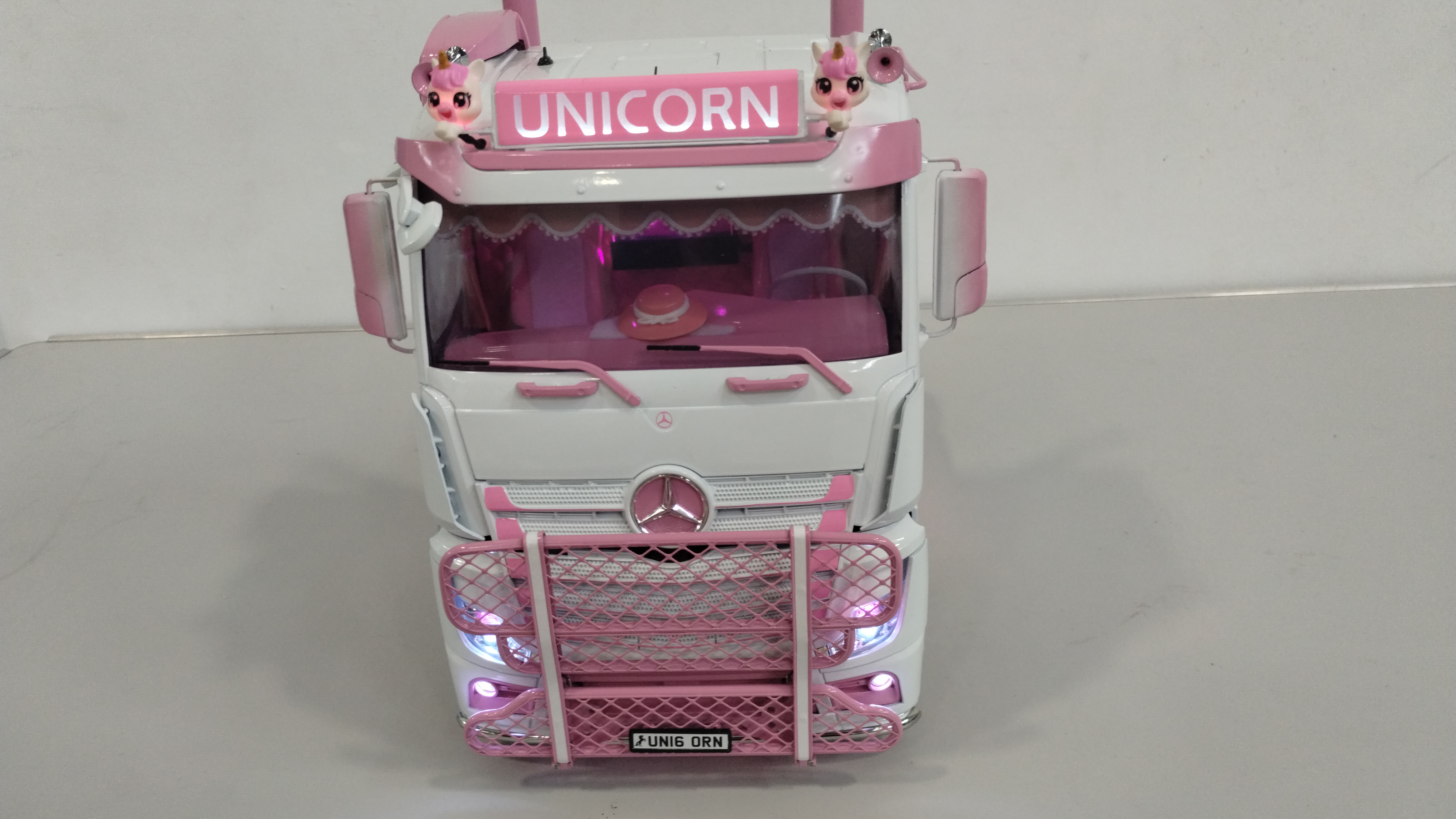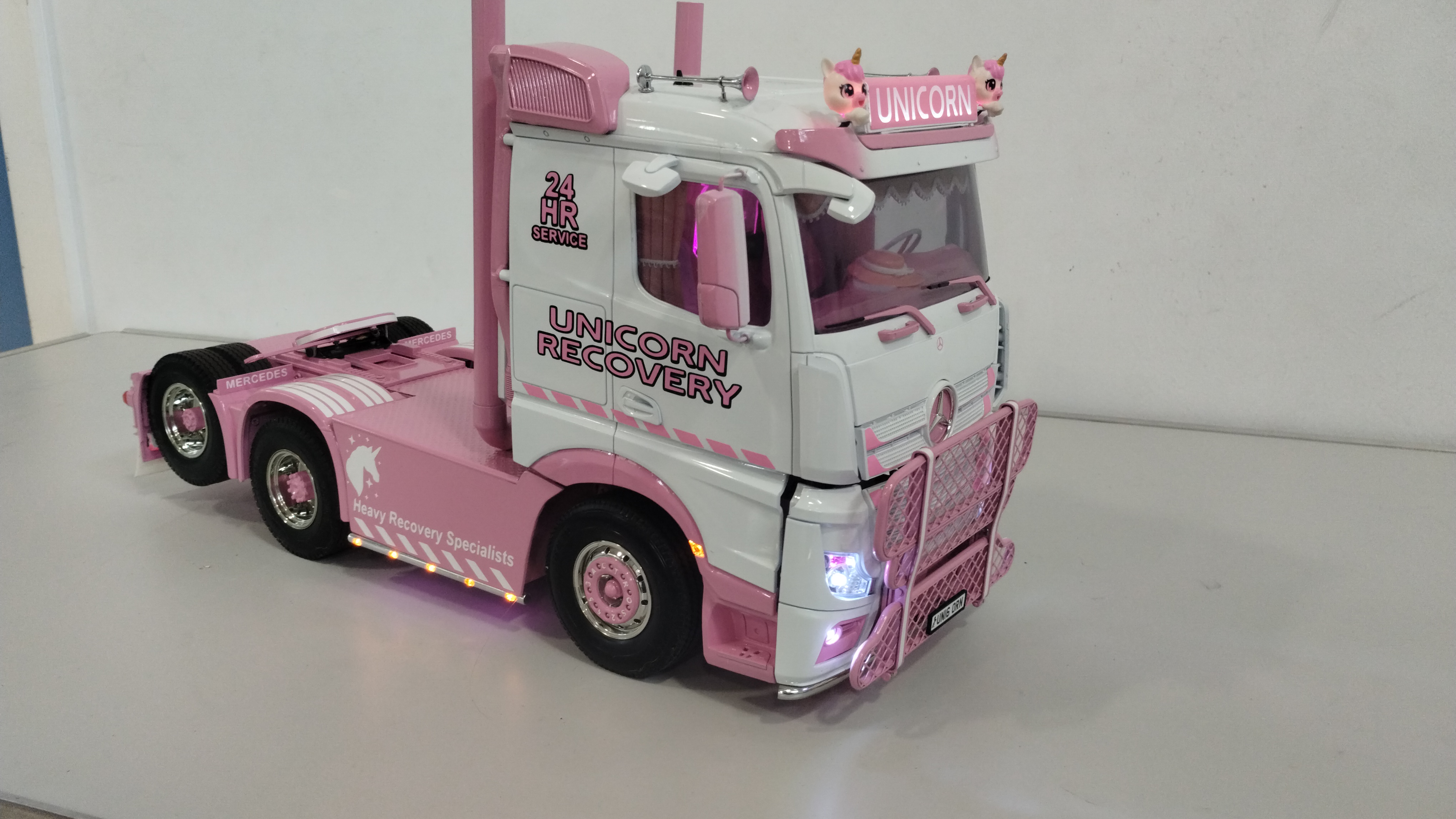 The truck is based on a Unicorn theme and has a lot of pink and white. The truck itself is a bit of a bitser truck in that it is mostly parts that were in spares boxes. The cab is a Hercules Actros but it has an Arocs low roof. Big pink Stacks are from Phil berg and a lot of spares from peoples boxes. It has a full interior a rear lift axle, Miro headboard, GT Power sound and light, IDW bull bar, dutch ladder and custom cab logos. Tiny treasures Curtains and pelmets. All run fro a Spektrum DX6i.
