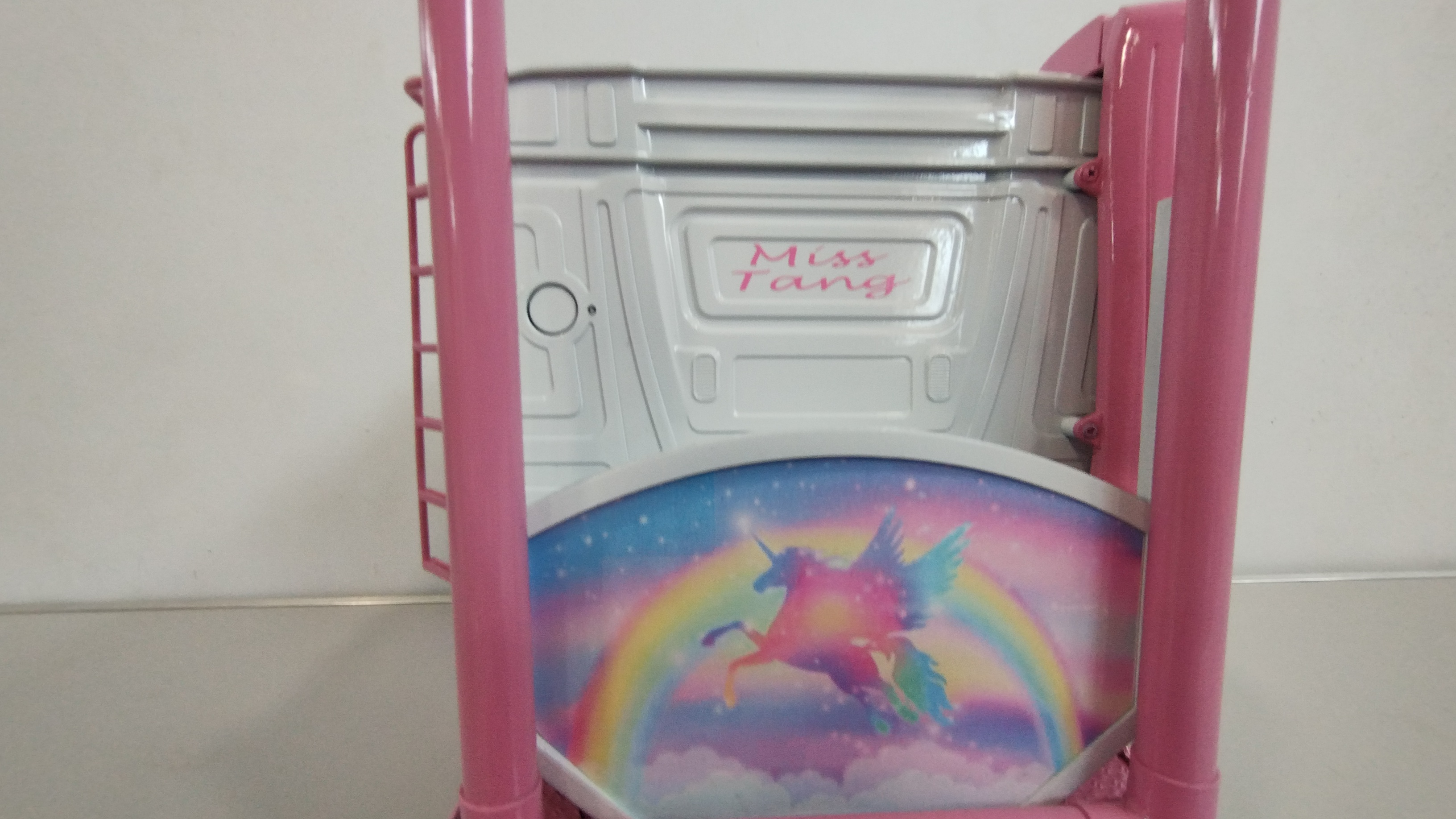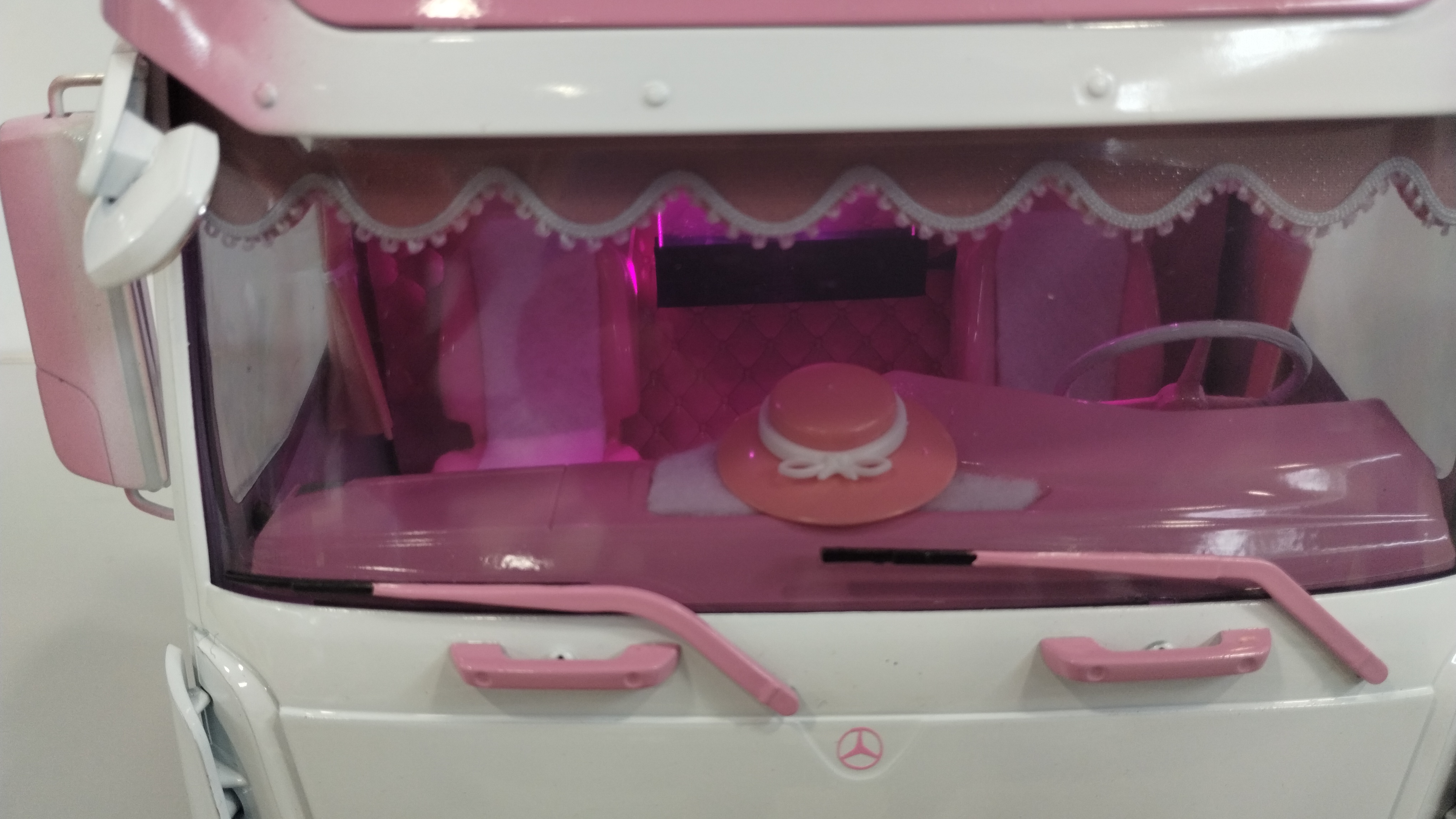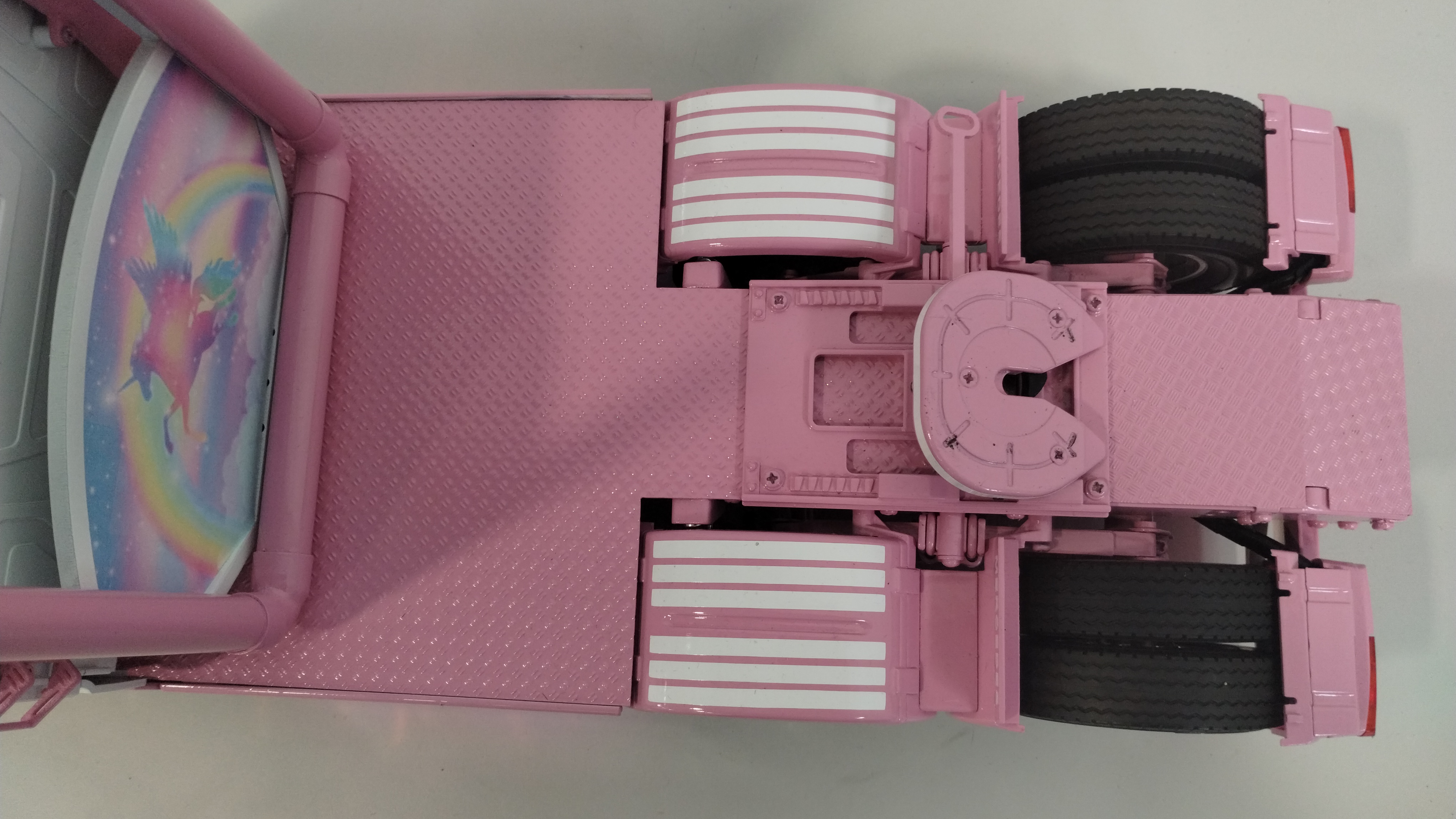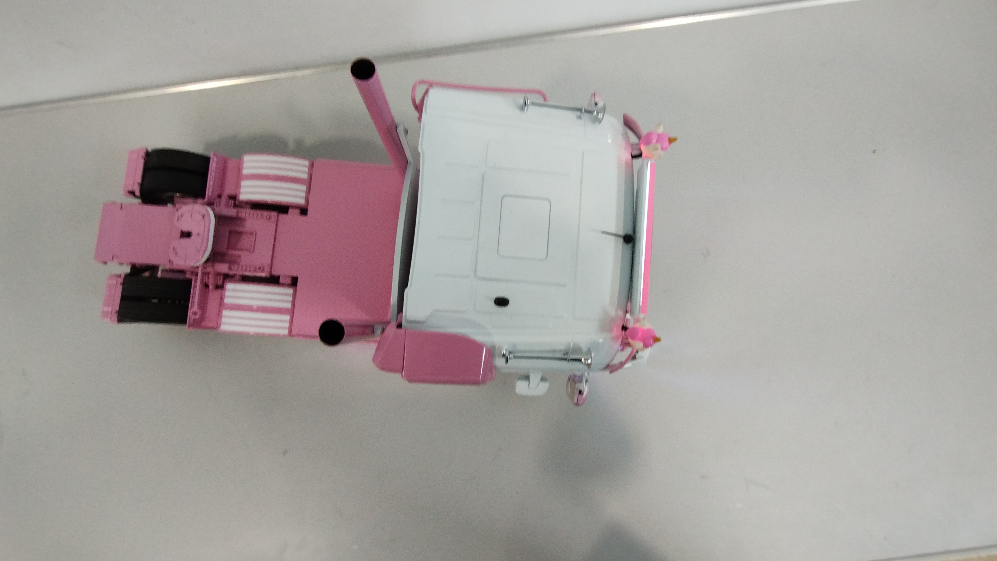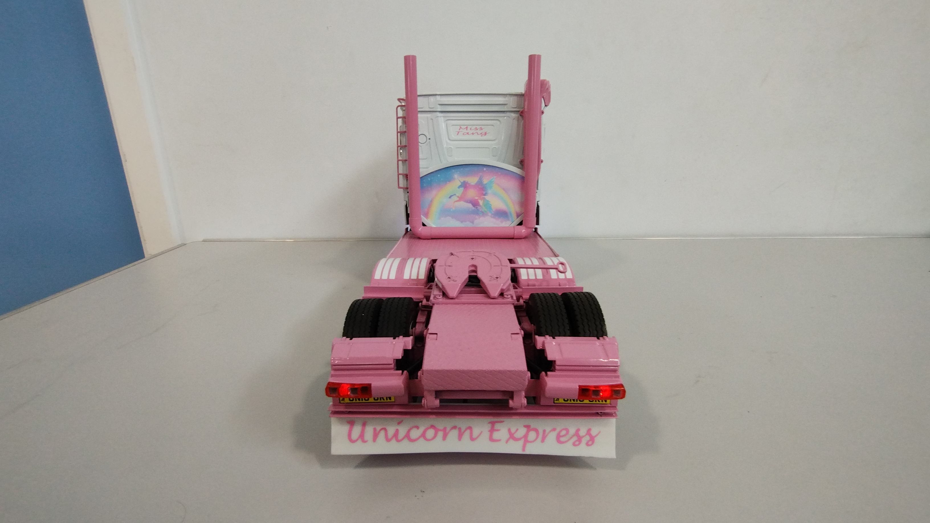 The truck is based on a Unicorn theme and has a lot of pink and white. The truck itself is a bit of a bitser truck in that it is mostly parts that were in spares boxes. The cab is a Hercules Actros but it has an Arocs low roof. Big pink Stacks are from Phil berg and a lot of spares from peoples boxes. It has a full interior a rear lift axle, Miro headboard, GT Power sound and light, IDW bull bar, dutch ladder and custom cab logos. Tiny treasures Curtains and pelmets. All run fro a Spektrum DX6i.