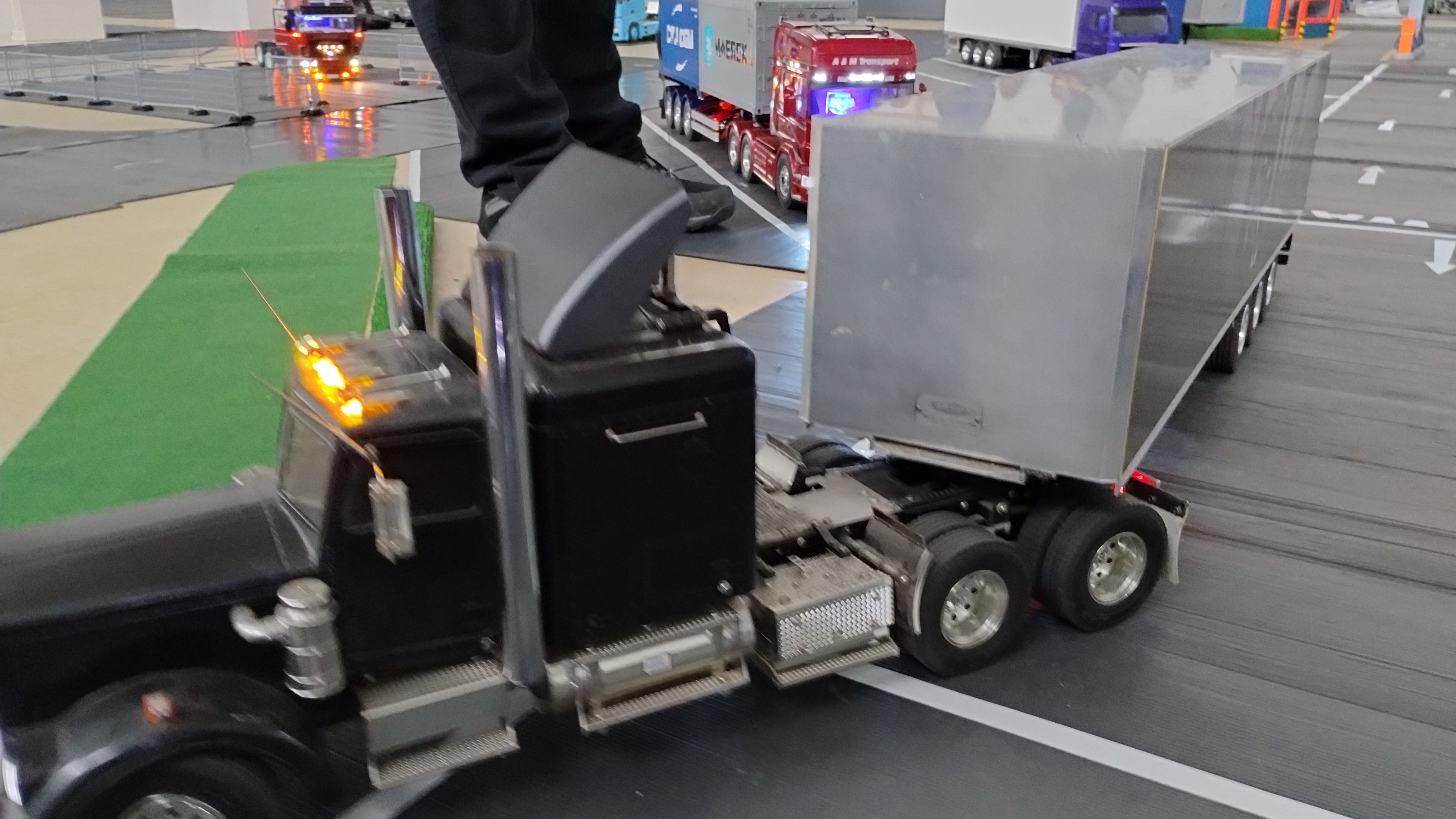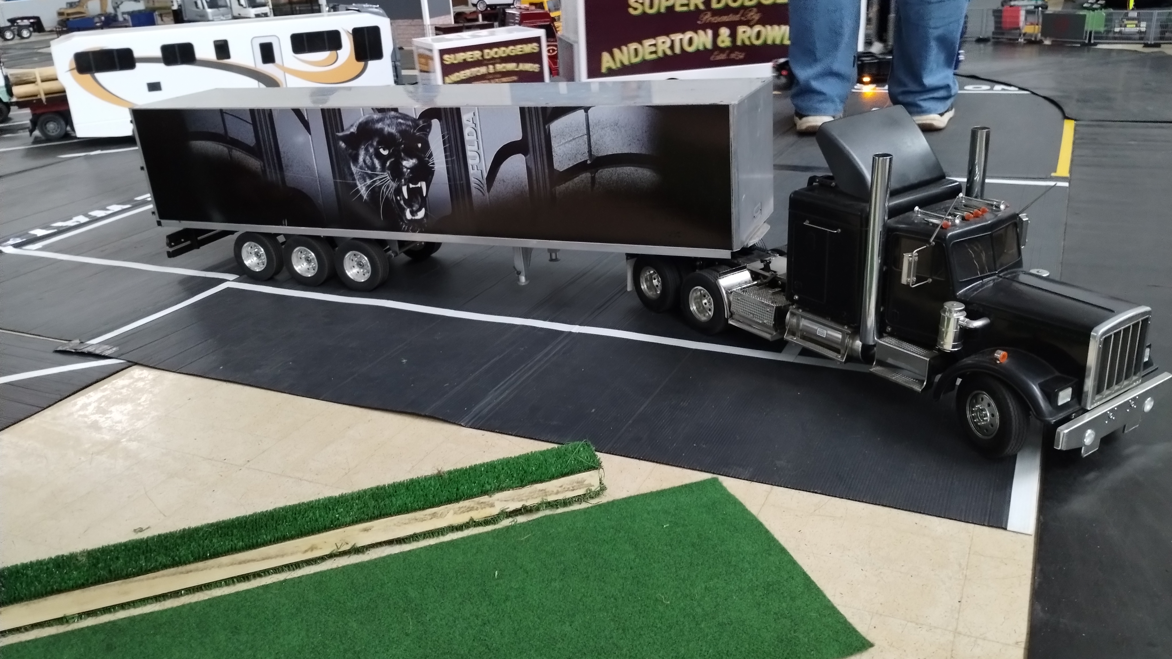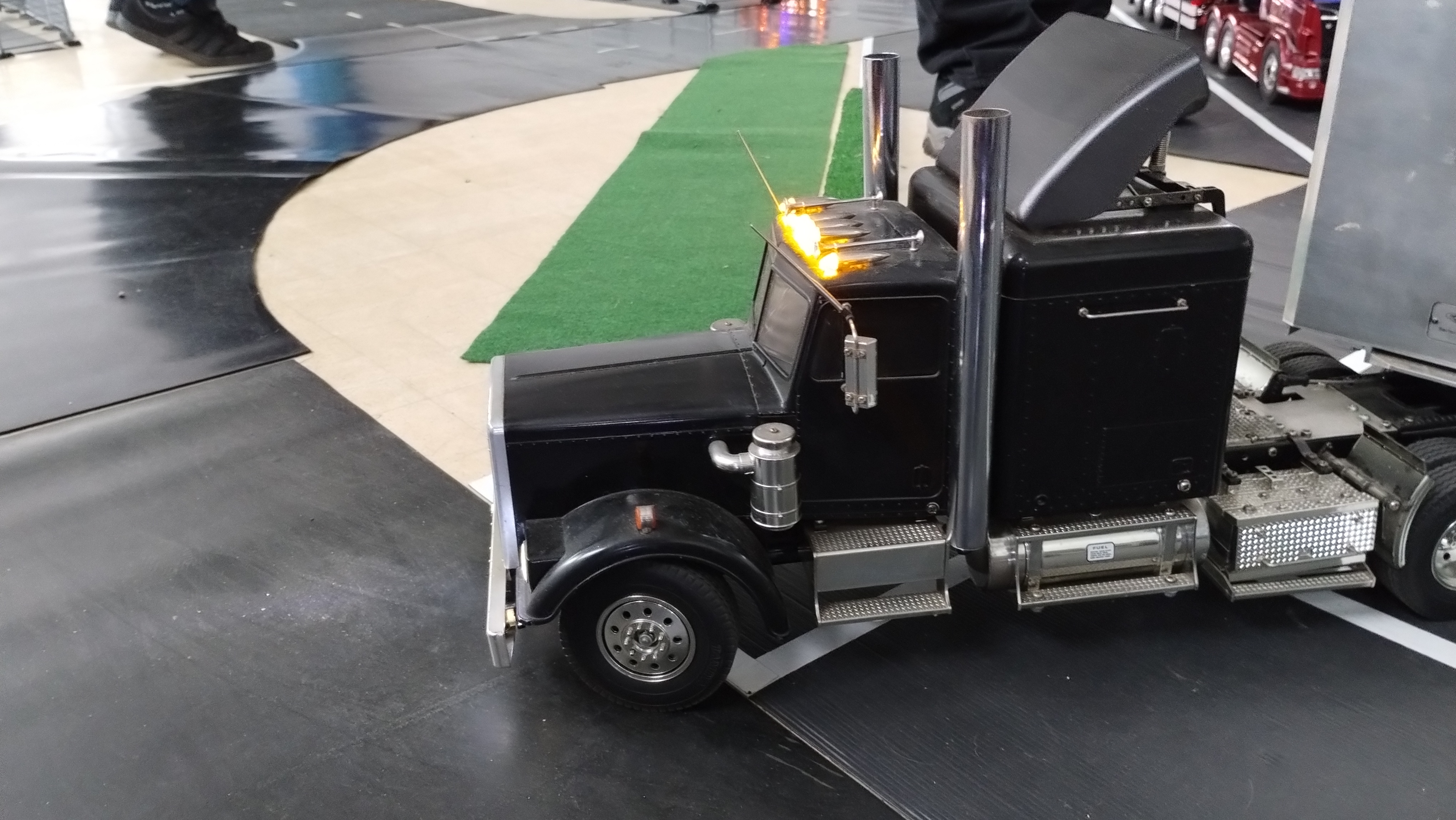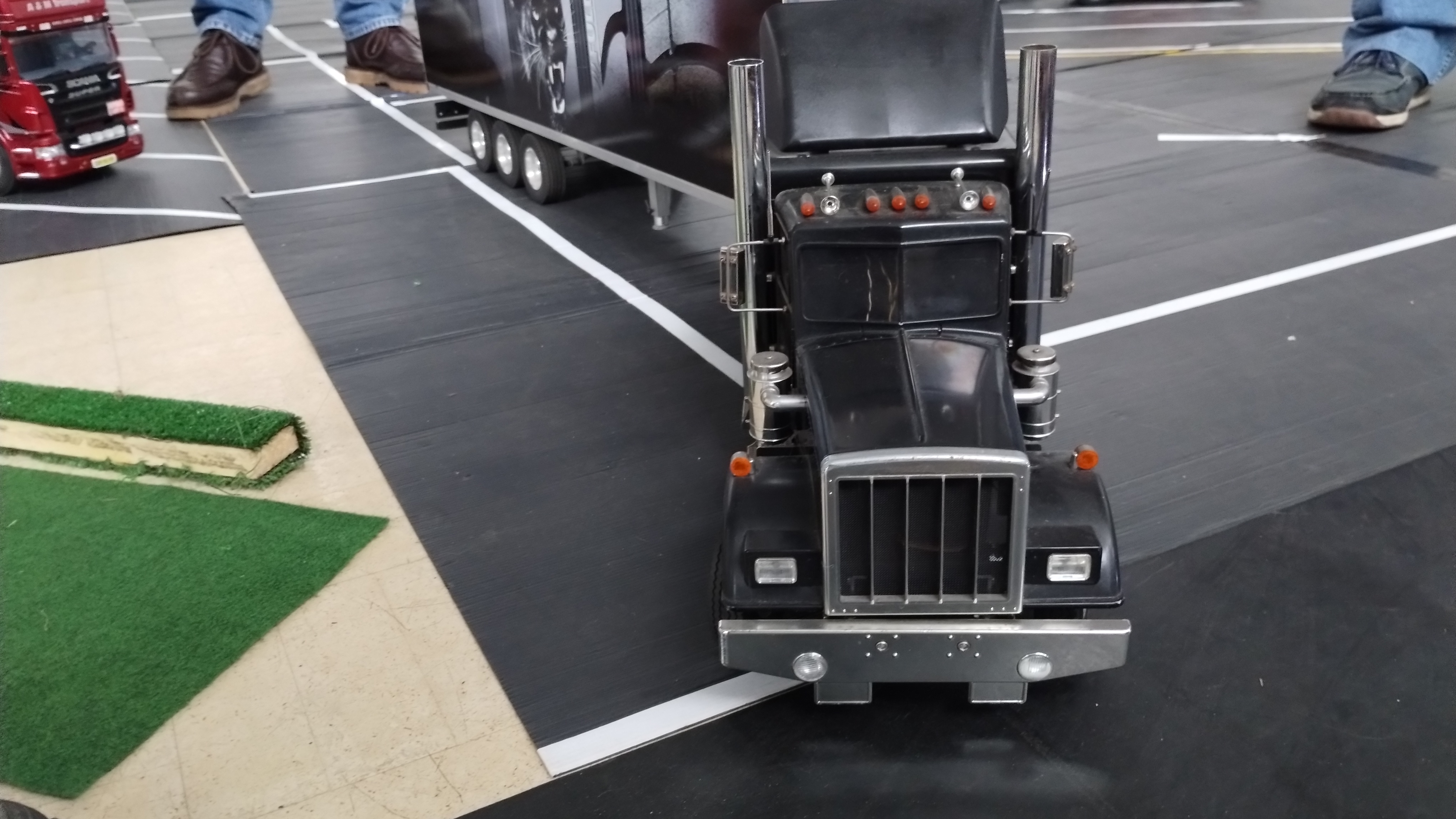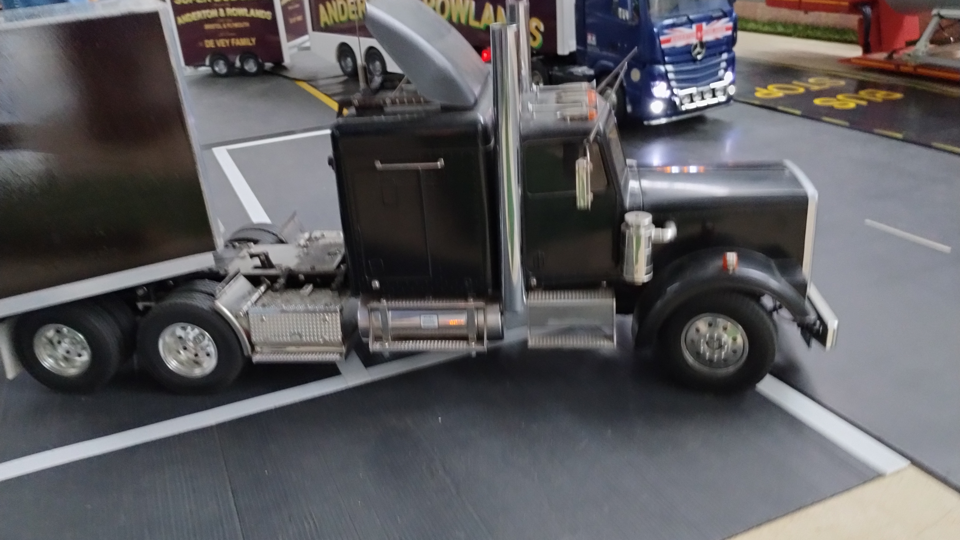 Enough, Spike's truck is a King hauler that he purchased along with a trailer. The chassis has been extended by around 1.5 inches and the stacks have been replaced with stainless versions but other than that it is a stock truck and plain black. A perfect blank canvas. It is fitted with an MFU1 so has the benefit of sound and lights. The controller is an aging 27mhz one and is due for an upgrade.