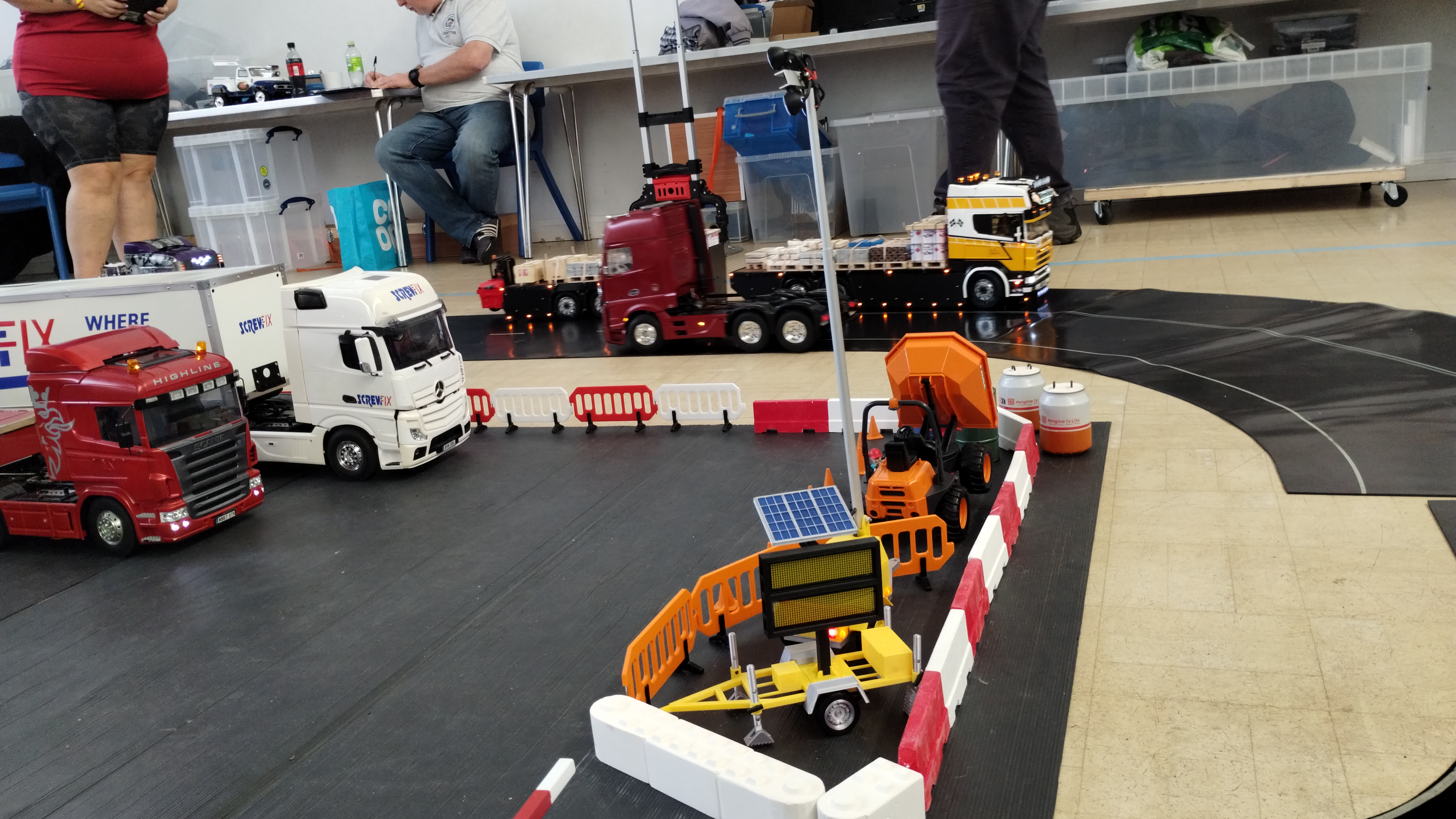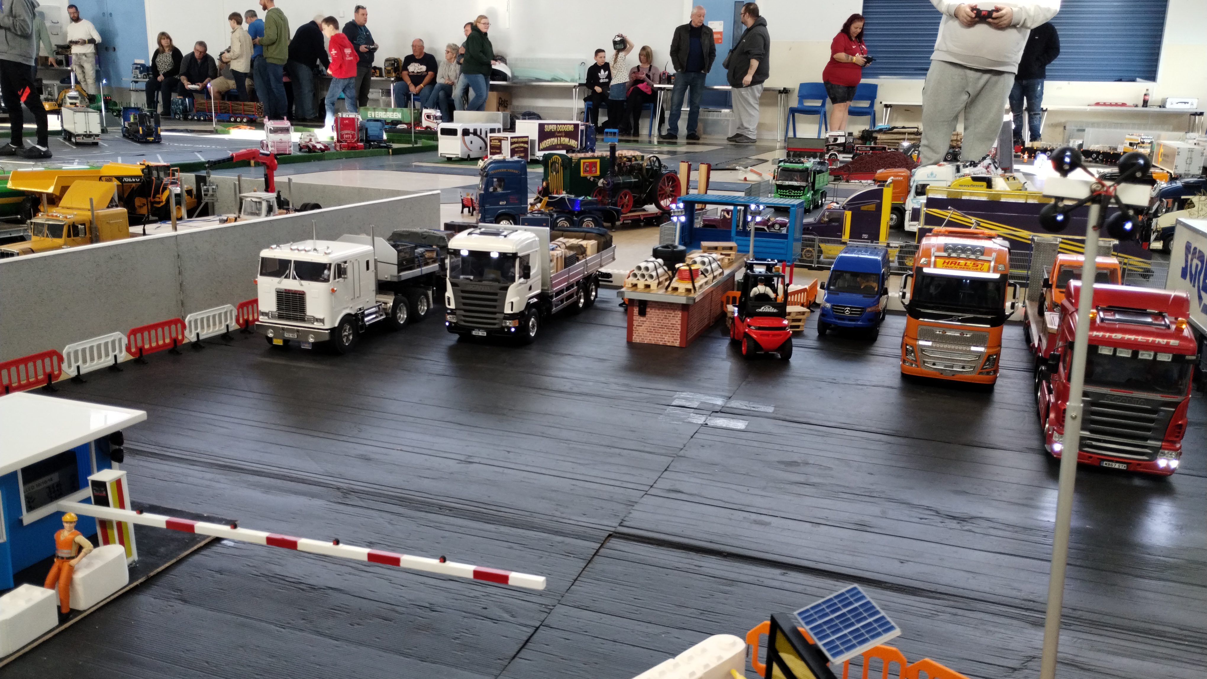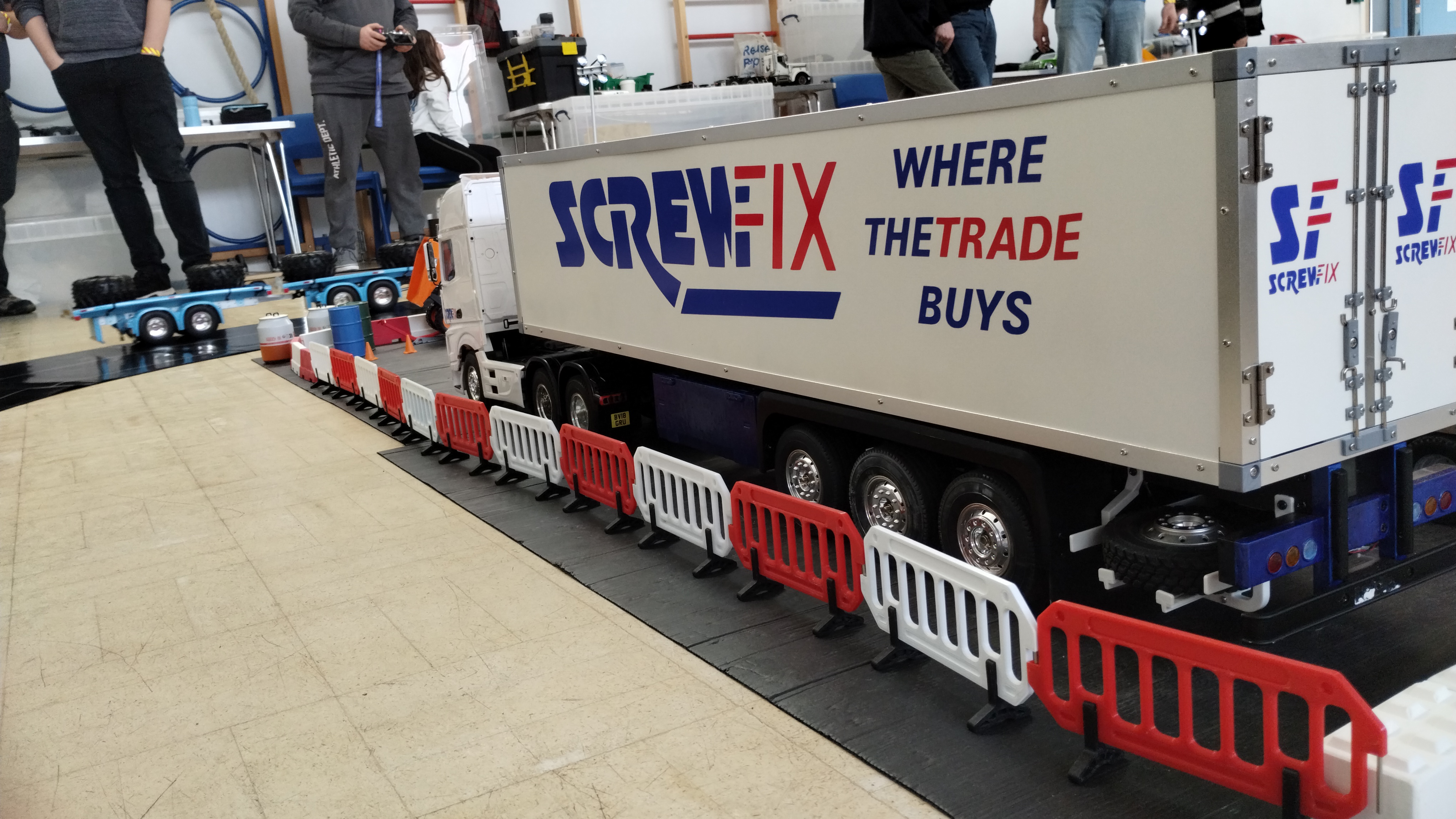 - An impressive lineup of parked vehicles, including a Screwfix box trailer, a Volvo heavy underlift wrecker, Scania low loader, Service van, and a couple of flatbed trucks.
