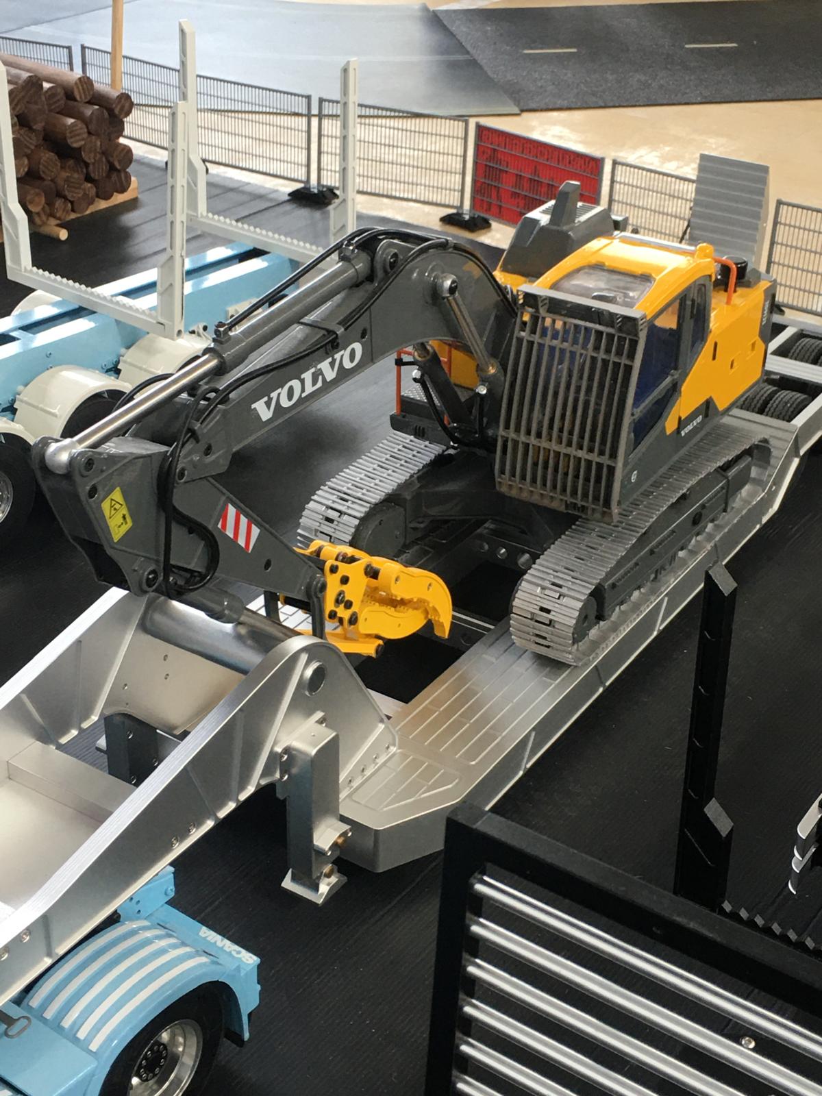 The excavator is a 'Double E' with a grapple to help load and unload the trailers .
