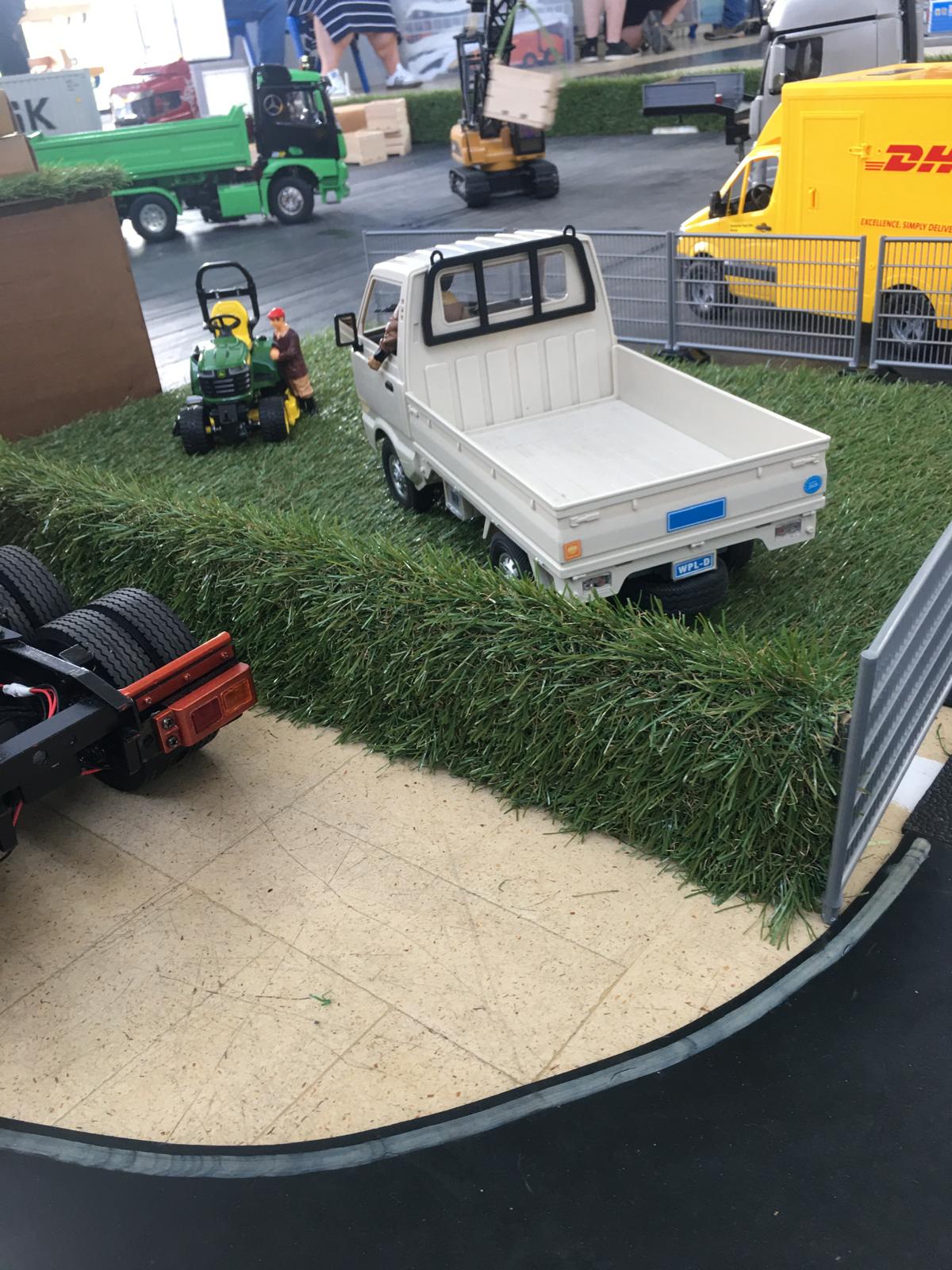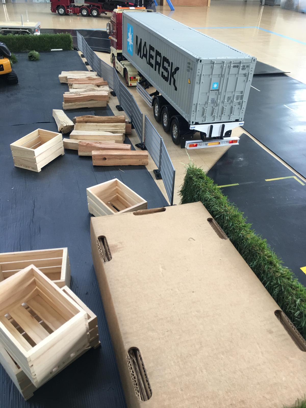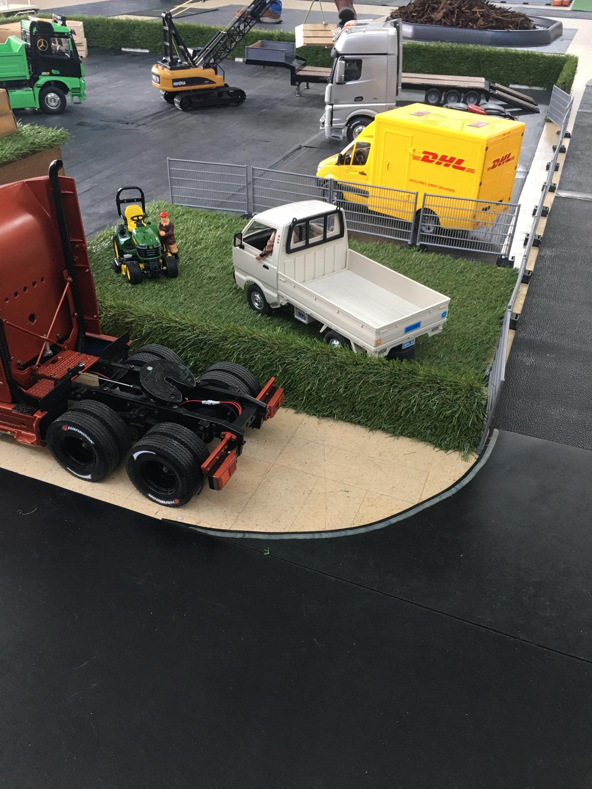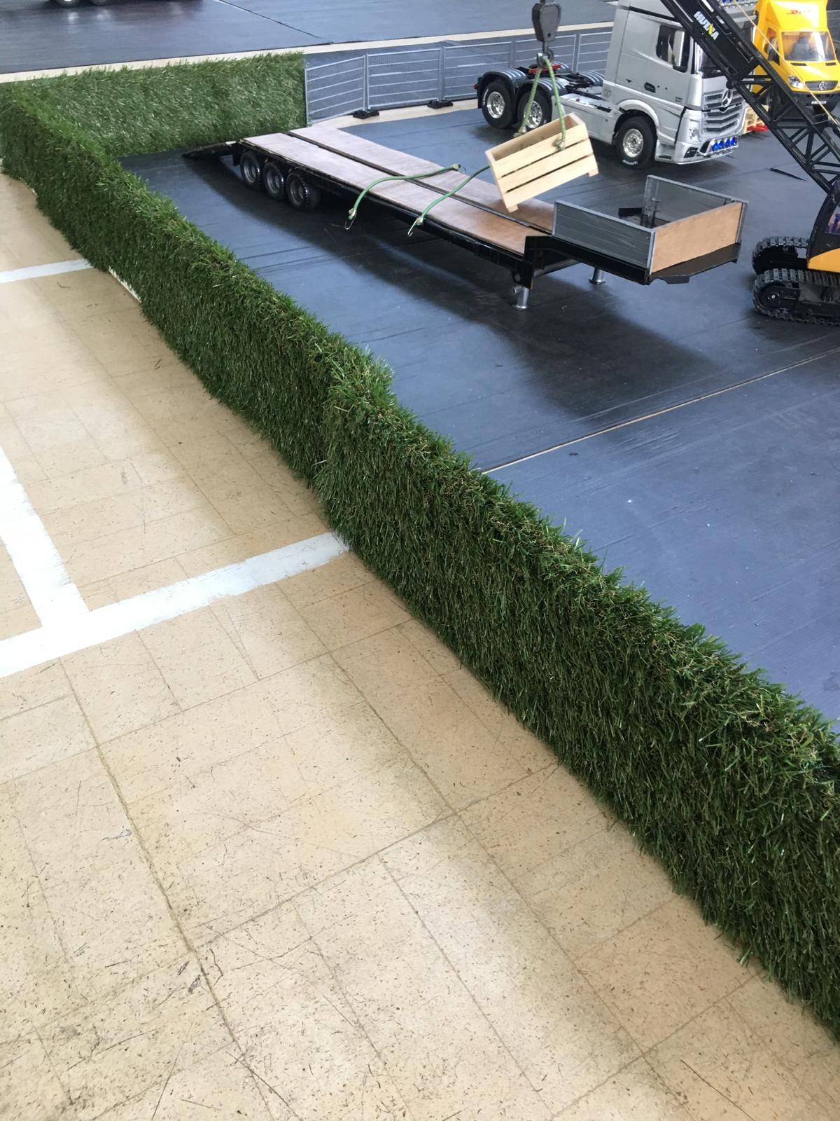 Considering that Harley only got his truck at Christmas his hobby is bowling along at some speed. You can see that the imitation grass has been made use of in a number of ways, hedges, roof of the eco gate hut, rolled as a load.