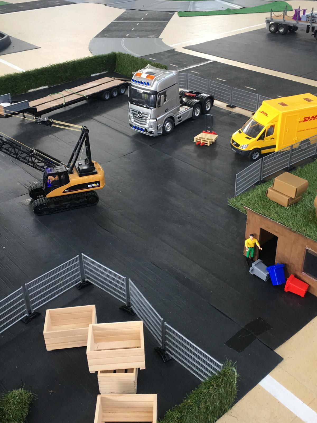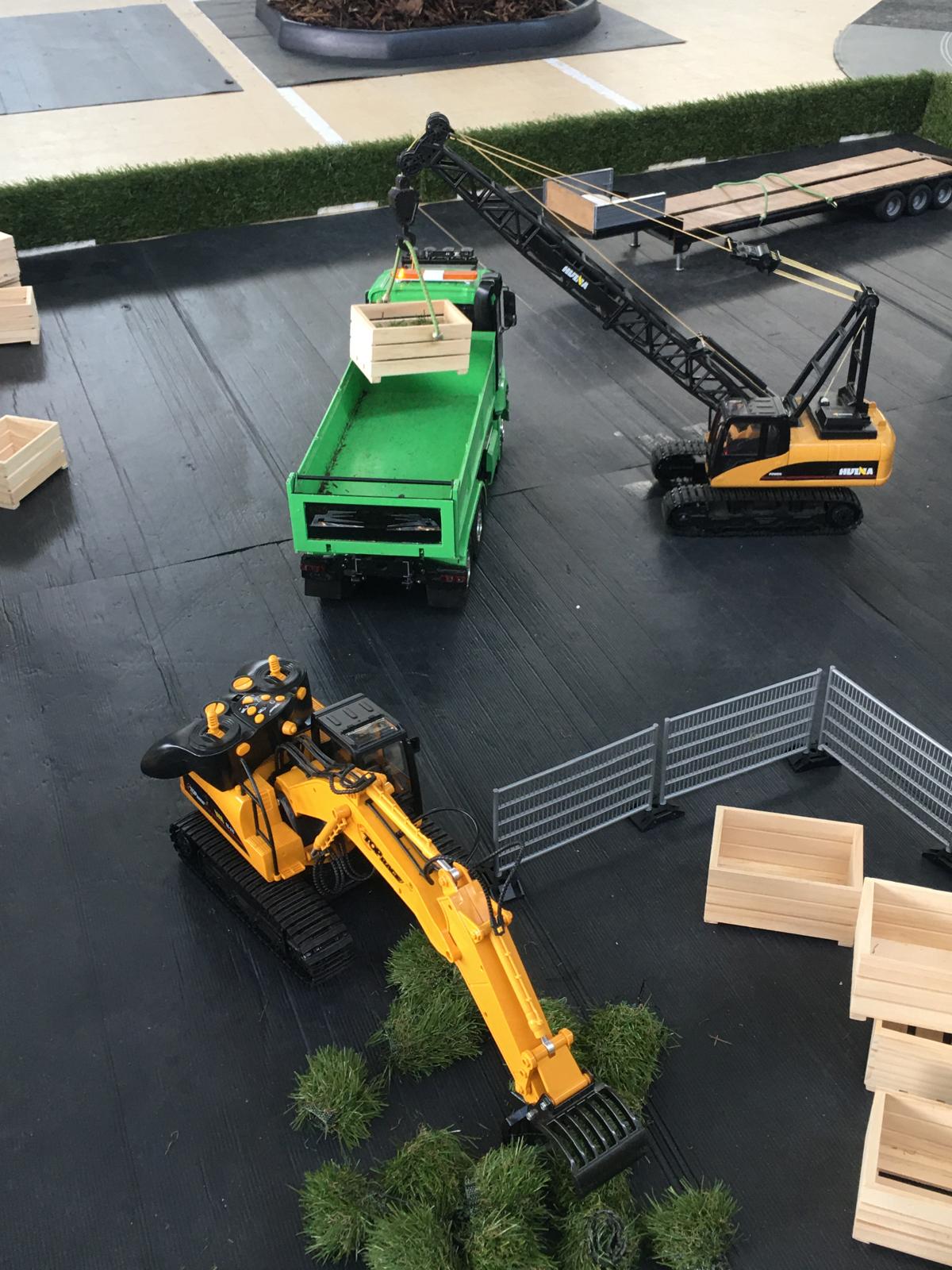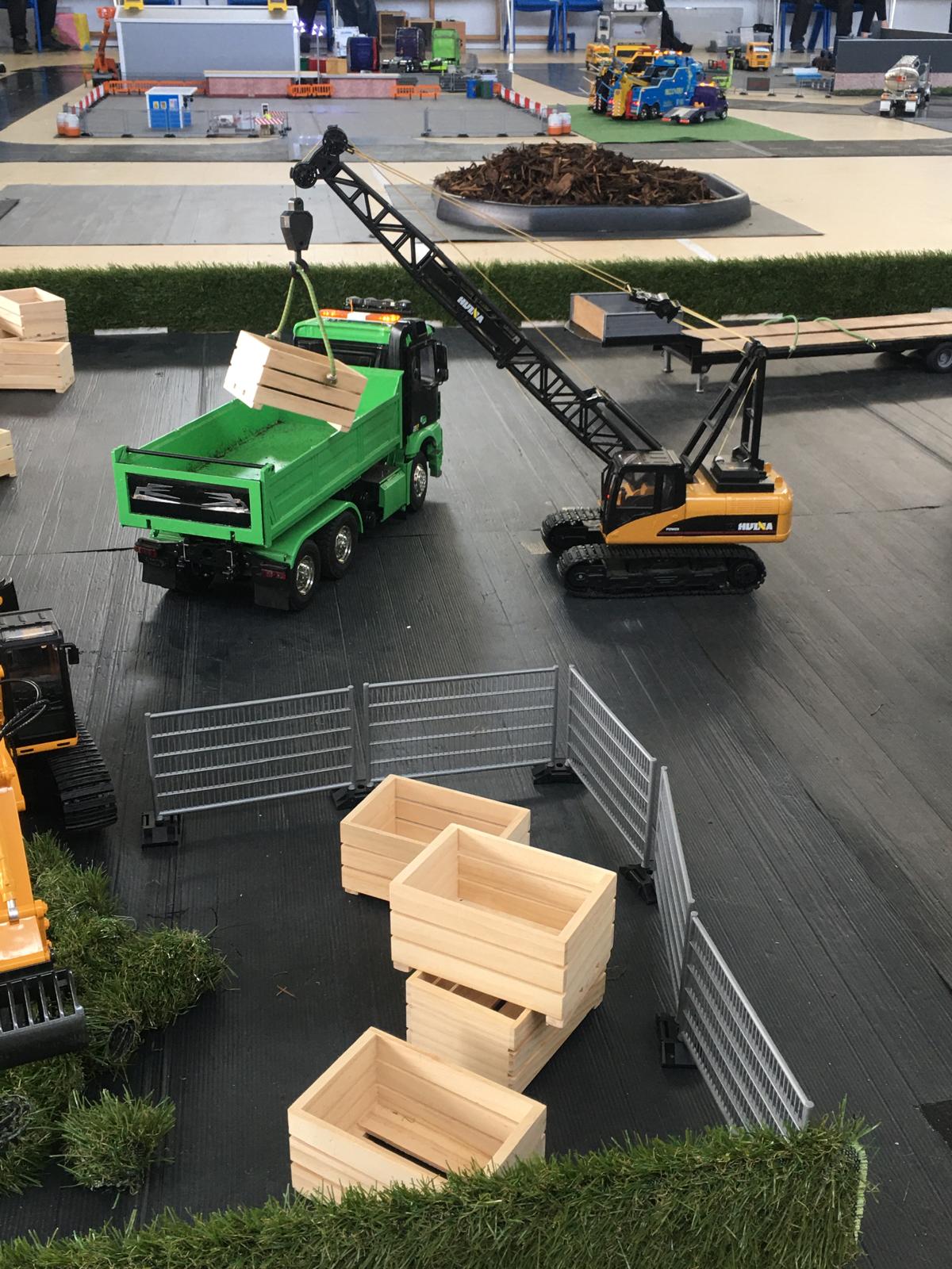 Lots of interest is provided by the Bruder etc. vehicles and accessories and the crawler crane is used for loading.