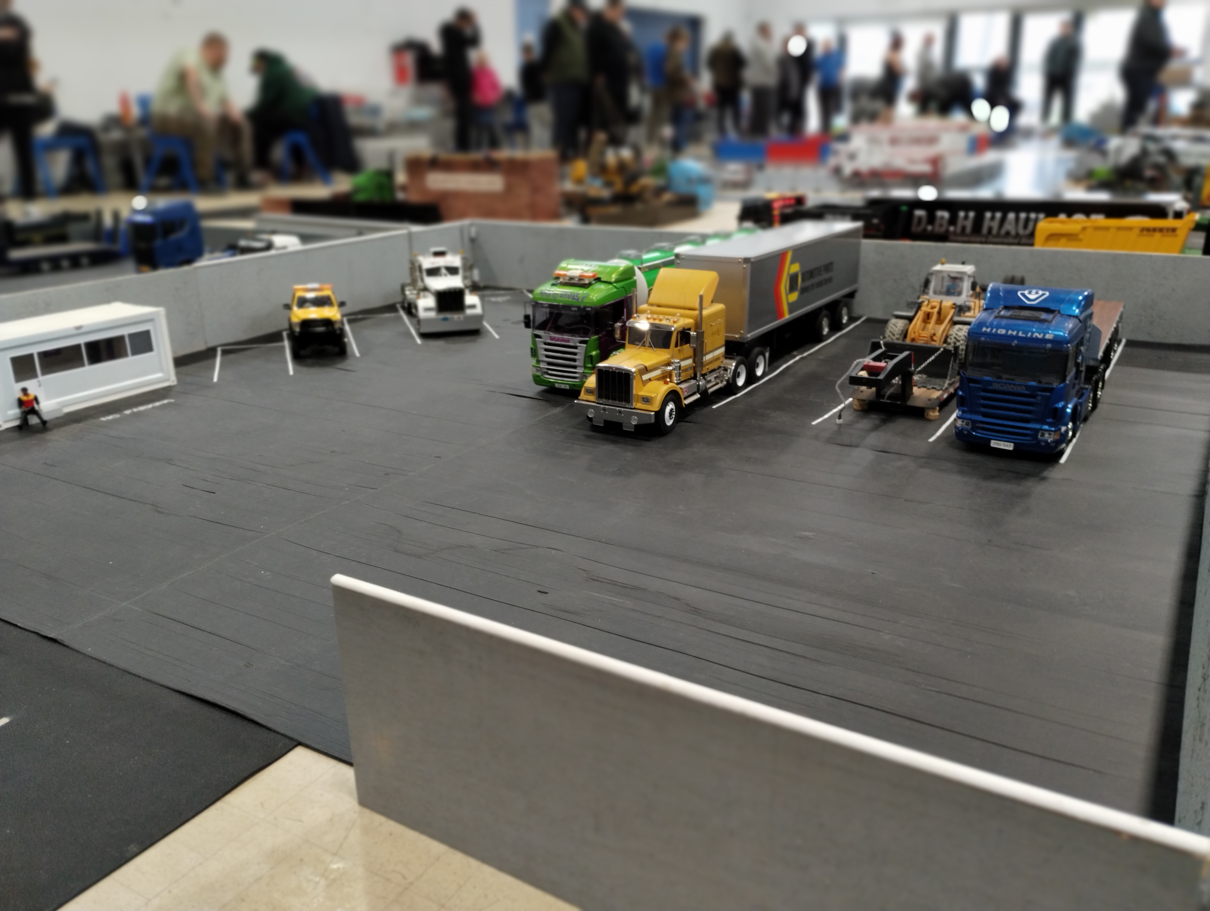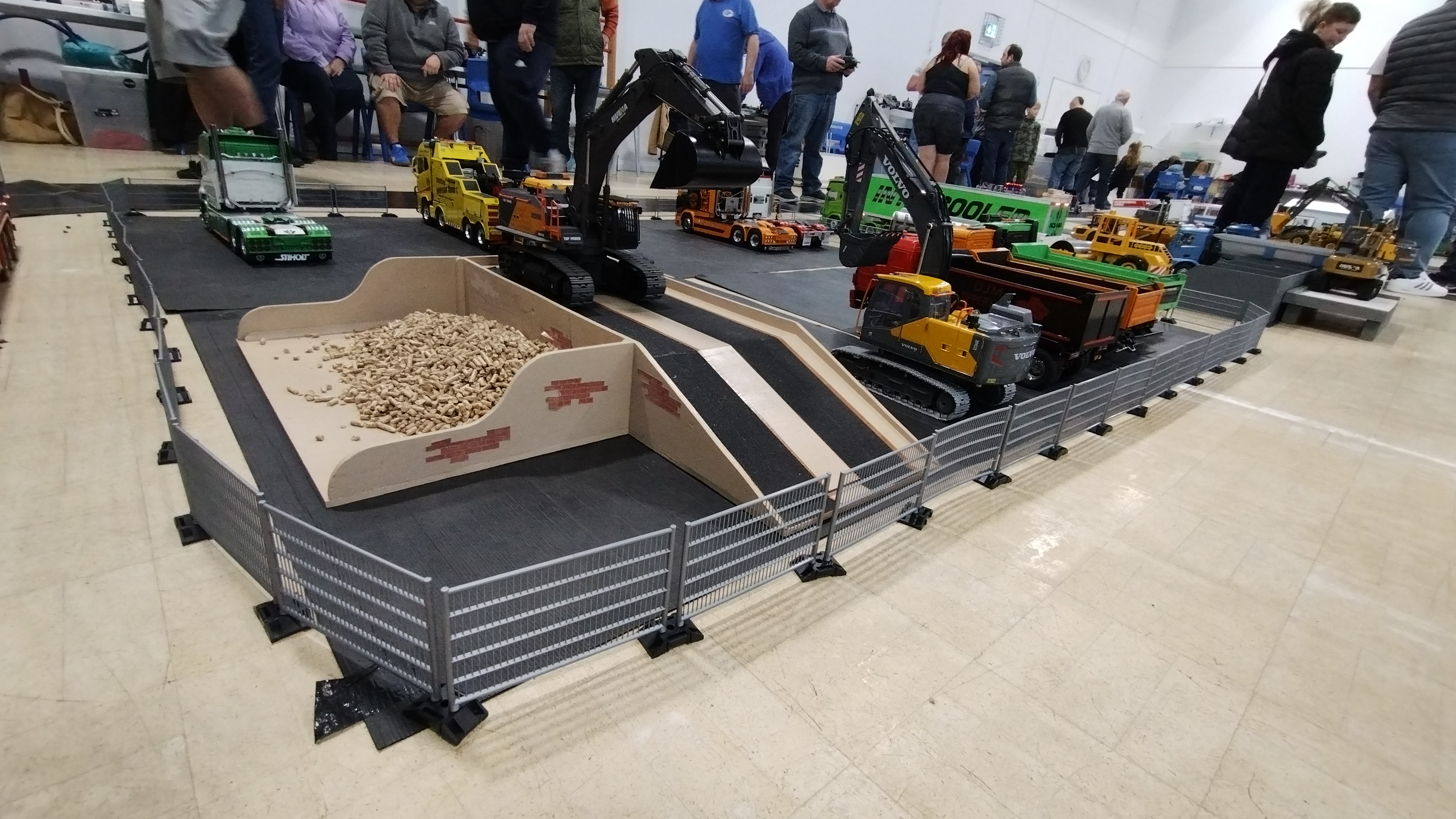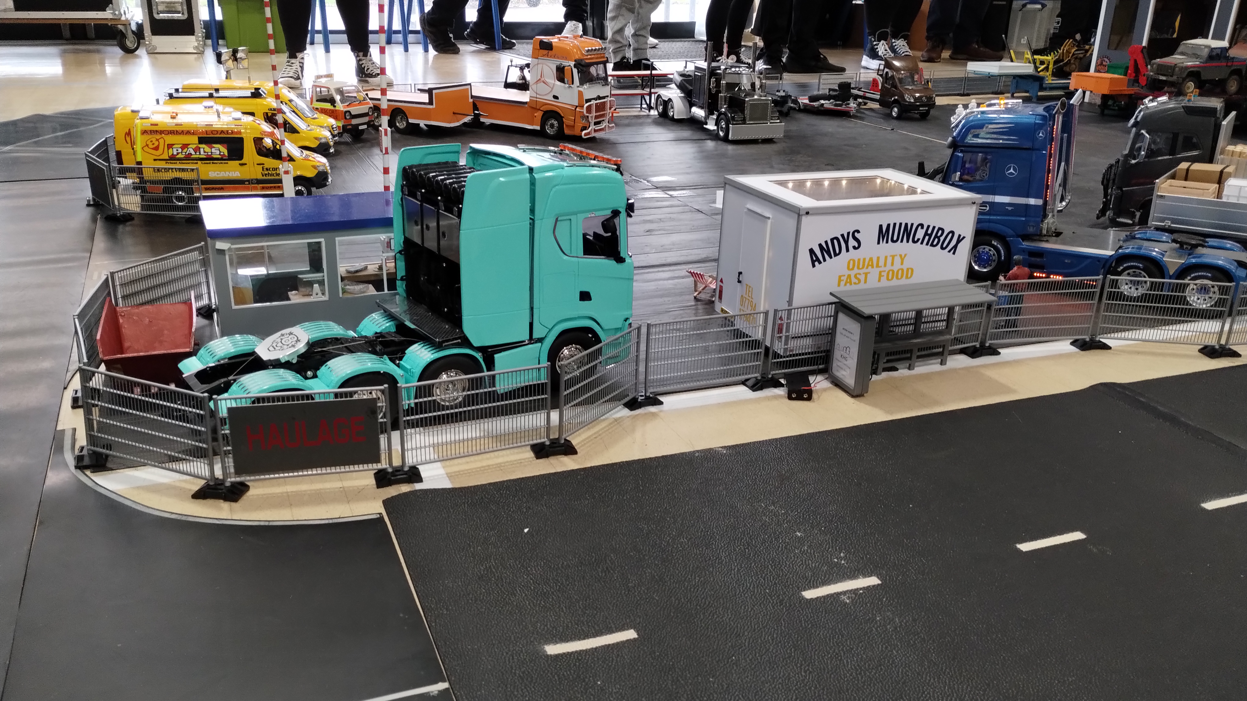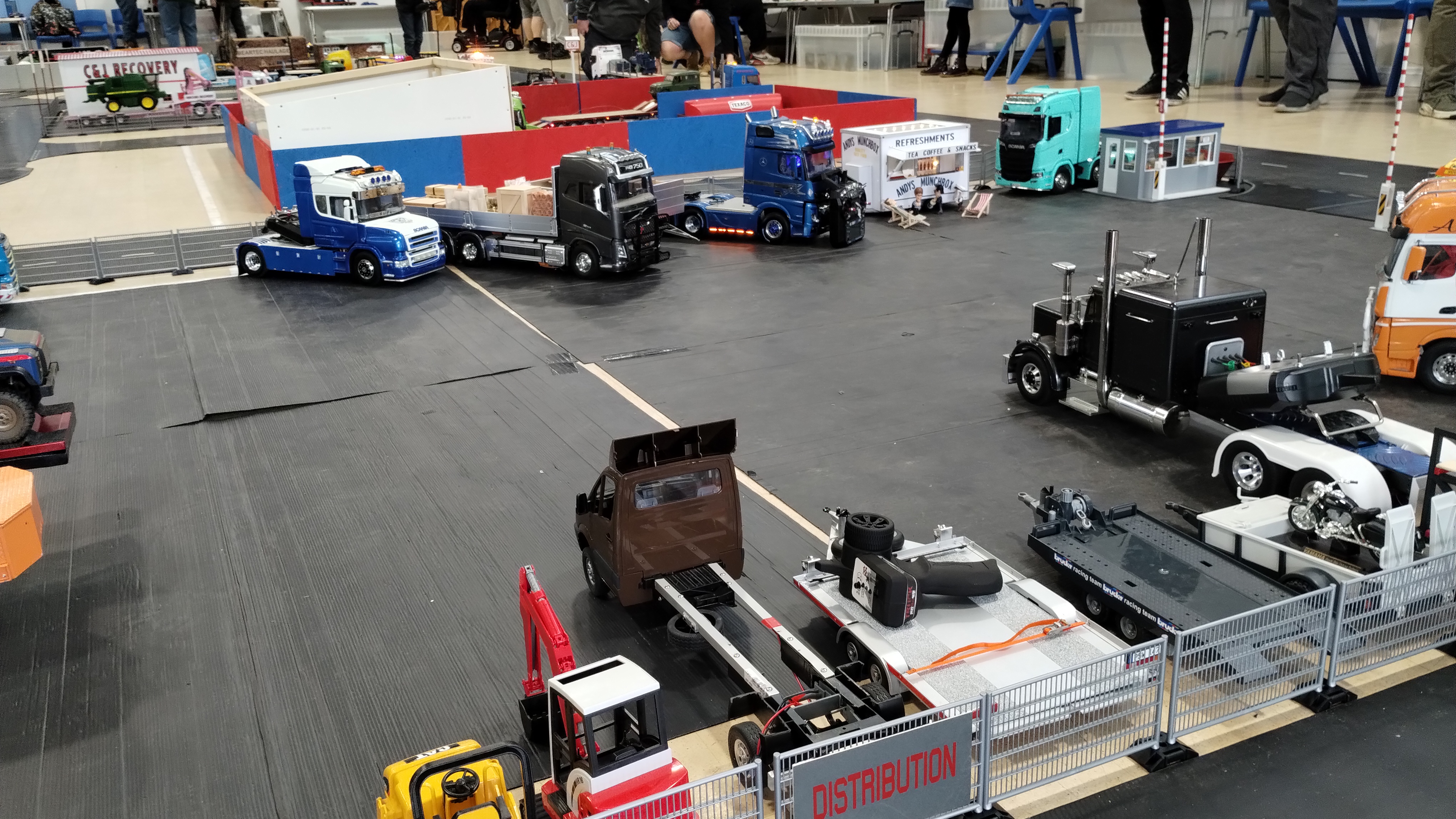 The Crew is always there early doors, ready to unload the trailer and all the other bits. First though we have to clear the hall of school bits. Then we can start with unloading the trailer, setting up tables and chairs in the hall and kitchen. Setting out the signage, getting the reception desk set up, starting the boiler and setting up the food area. In the hall the layout is going down plus around 20 sets of base sheets for the yards, Fuel station and shop, hedges, quarry area, and more. Then the yards build starts around 9:15. Will all the people turn up and how many. Well, shortly after that people started to arrive, bringing their trucks unloading cars, registering attendance and we see what we have achieved.