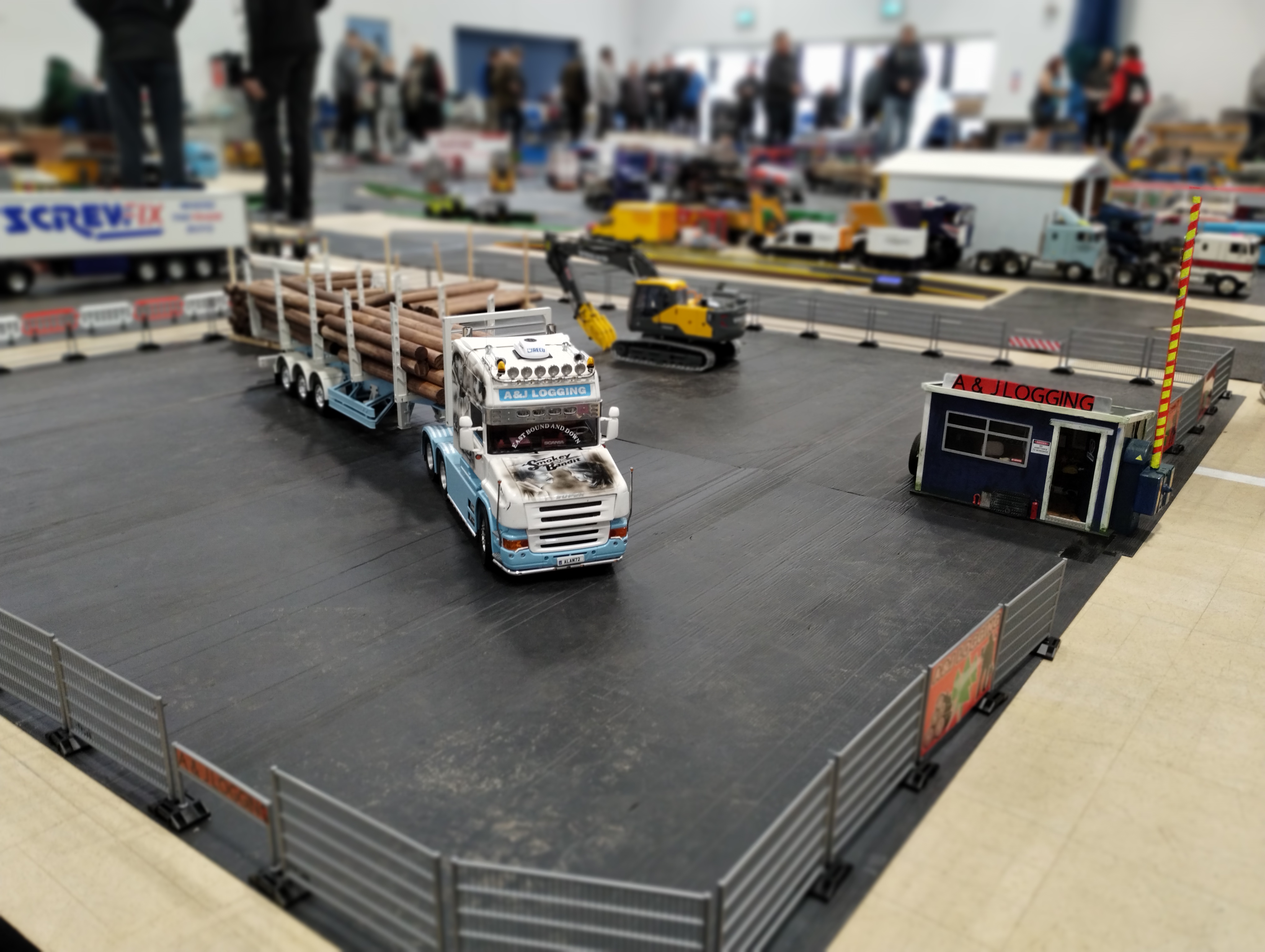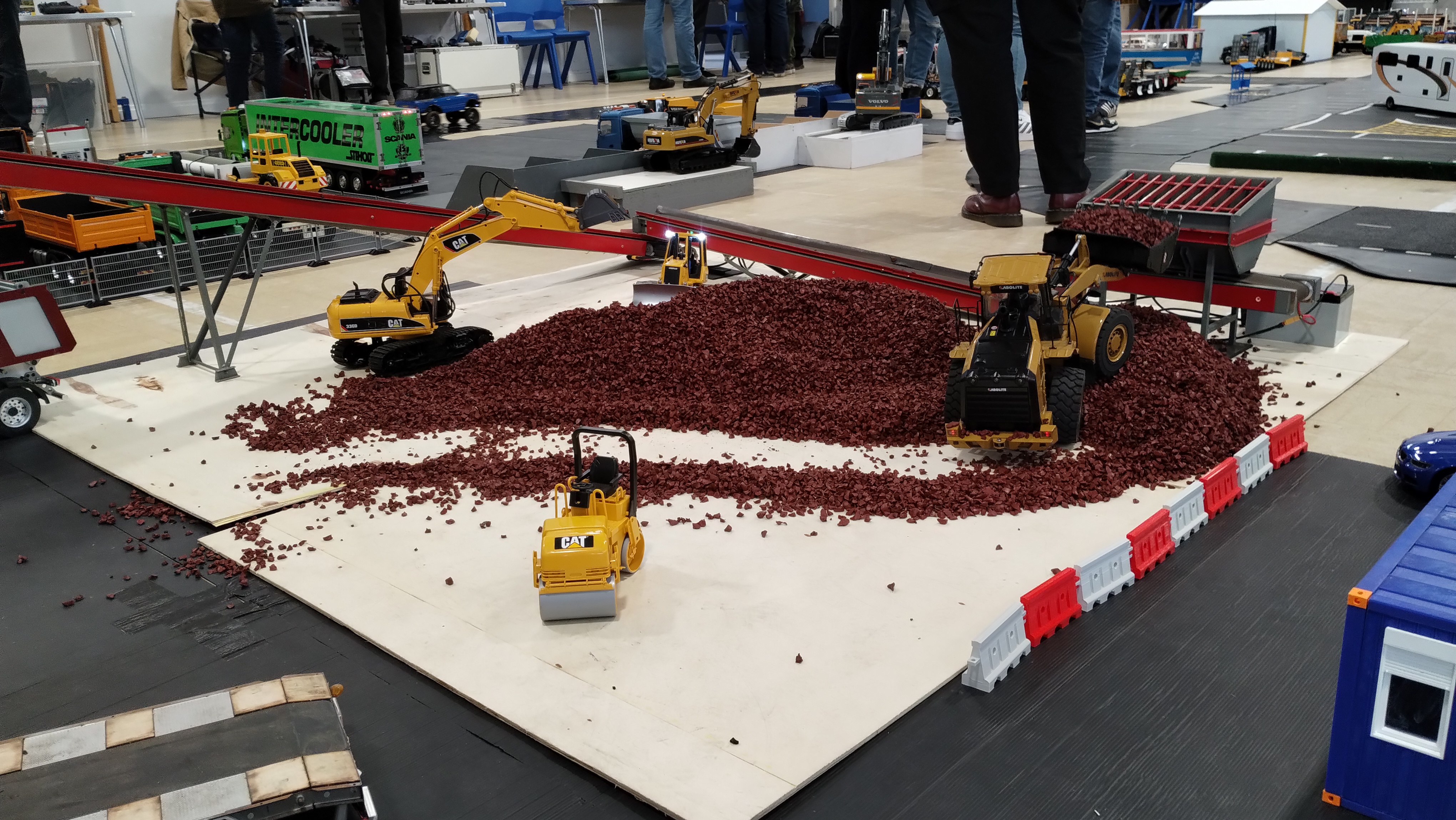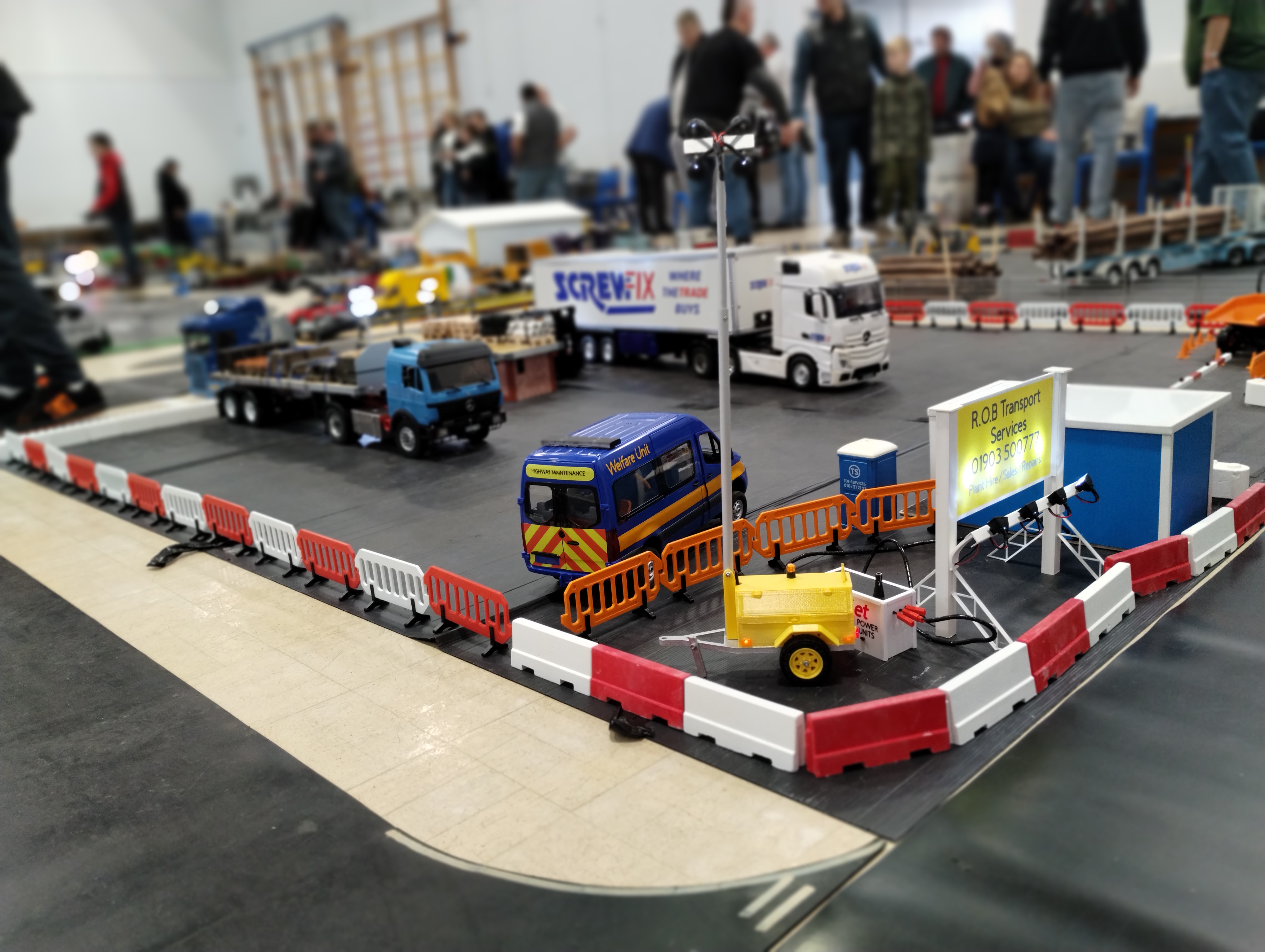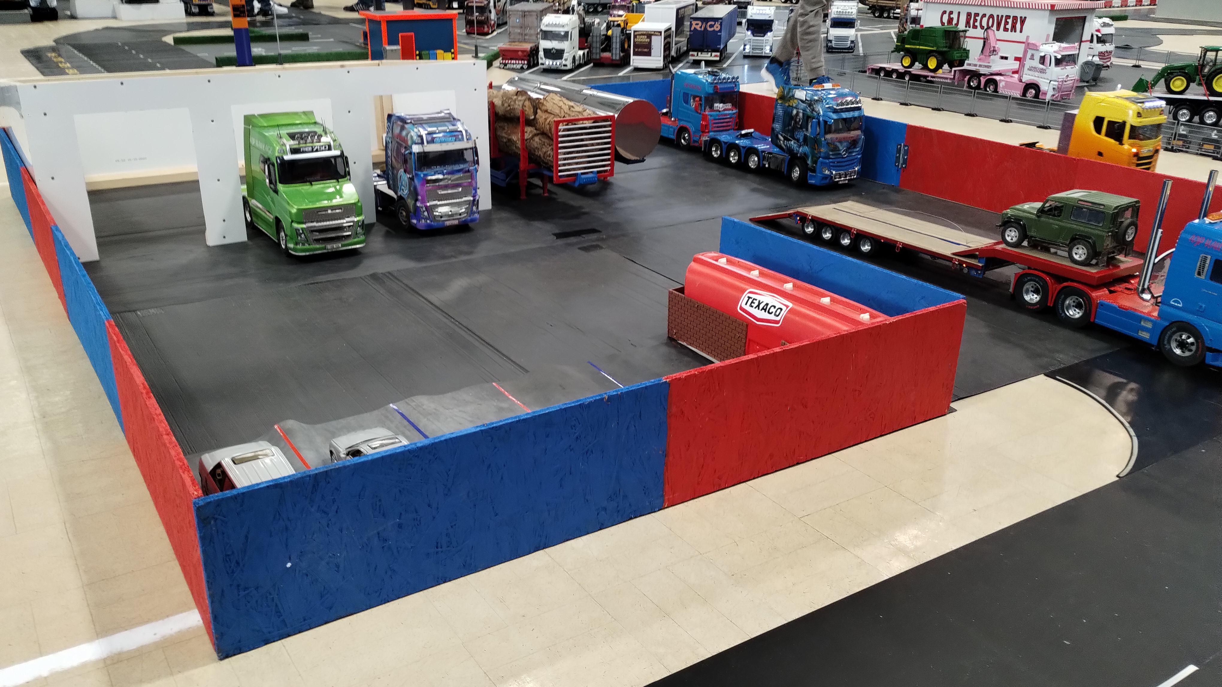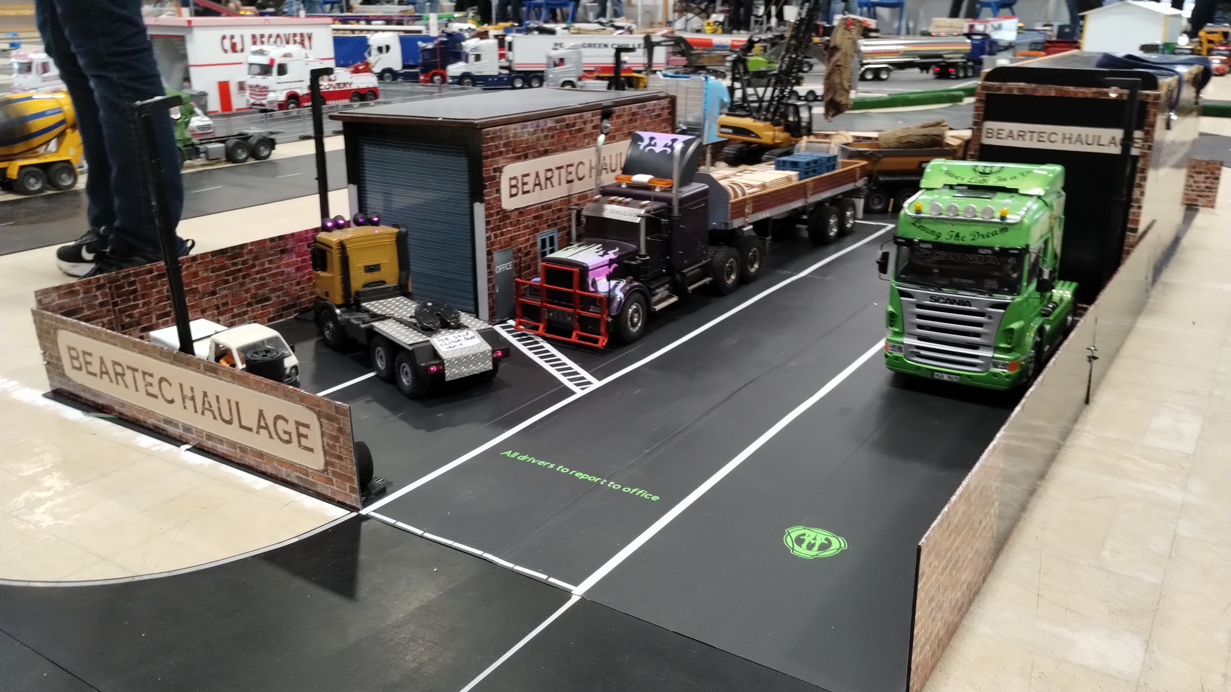 The Crew is always there early doors, ready to unload the trailer and all the other bits. First though we have to clear the hall of school bits. Then we can start with unloading the trailer, setting up tables and chairs in the hall and kitchen. Setting out the signage, getting the reception desk set up, starting the boiler and setting up the food area. In the hall the layout is going down plus around 20 sets of base sheets for the yards, Fuel station and shop, hedges, quarry area, and more. Then the yards build starts around 9:15. Will all the people turn up and how many. Well, shortly after that people started to arrive, bringing their trucks unloading cars, registering attendance and we see what we have achieved.