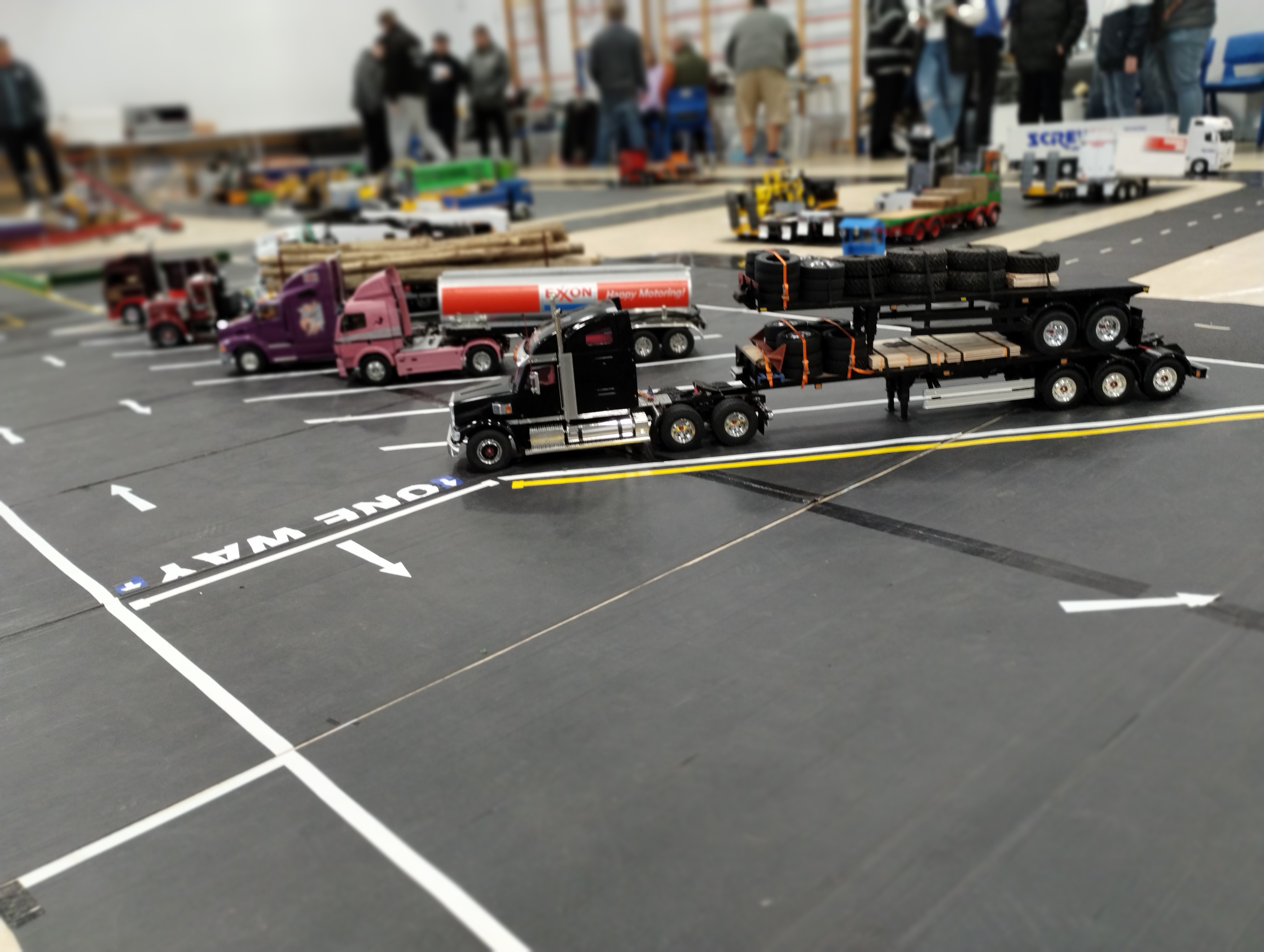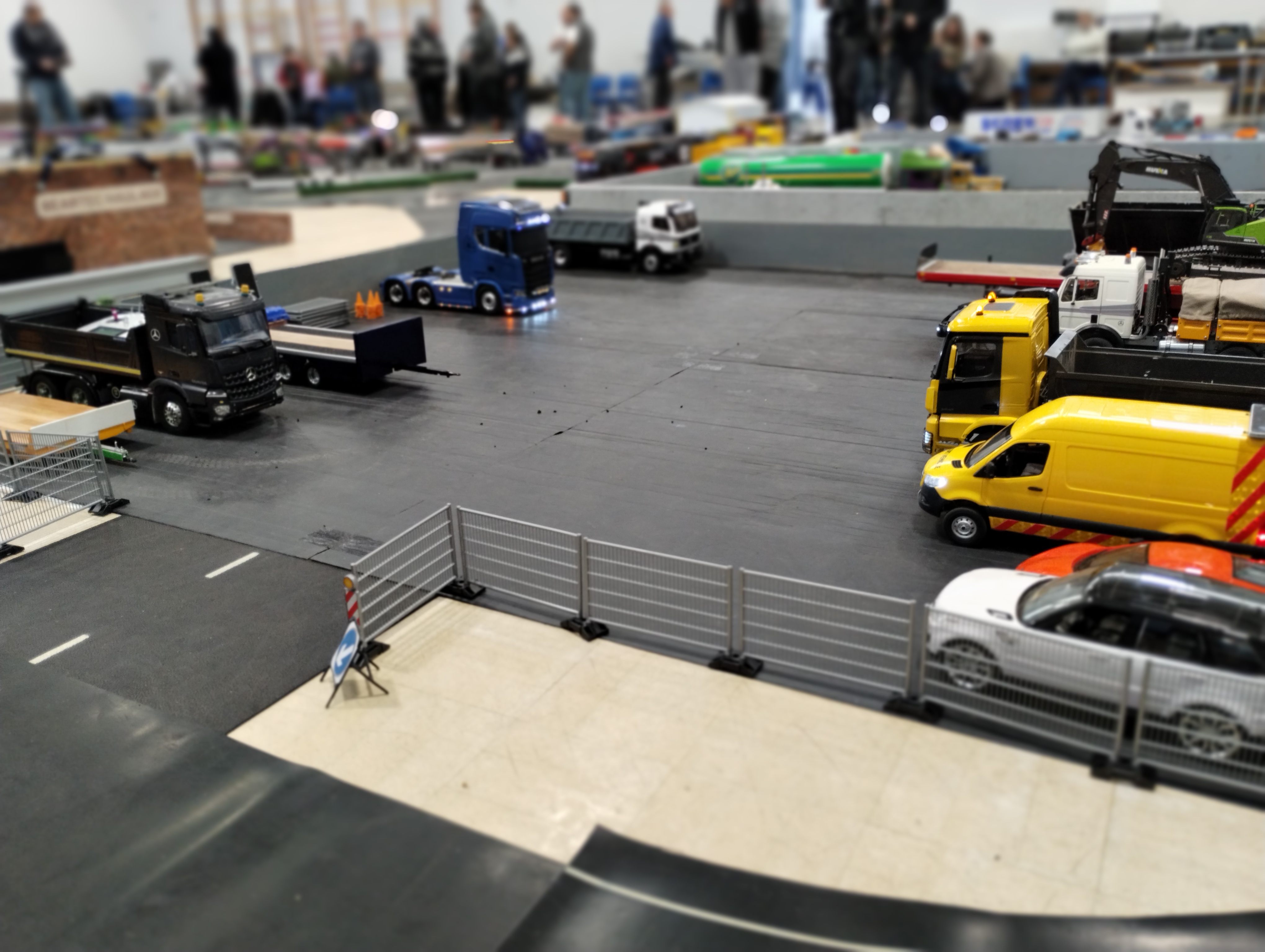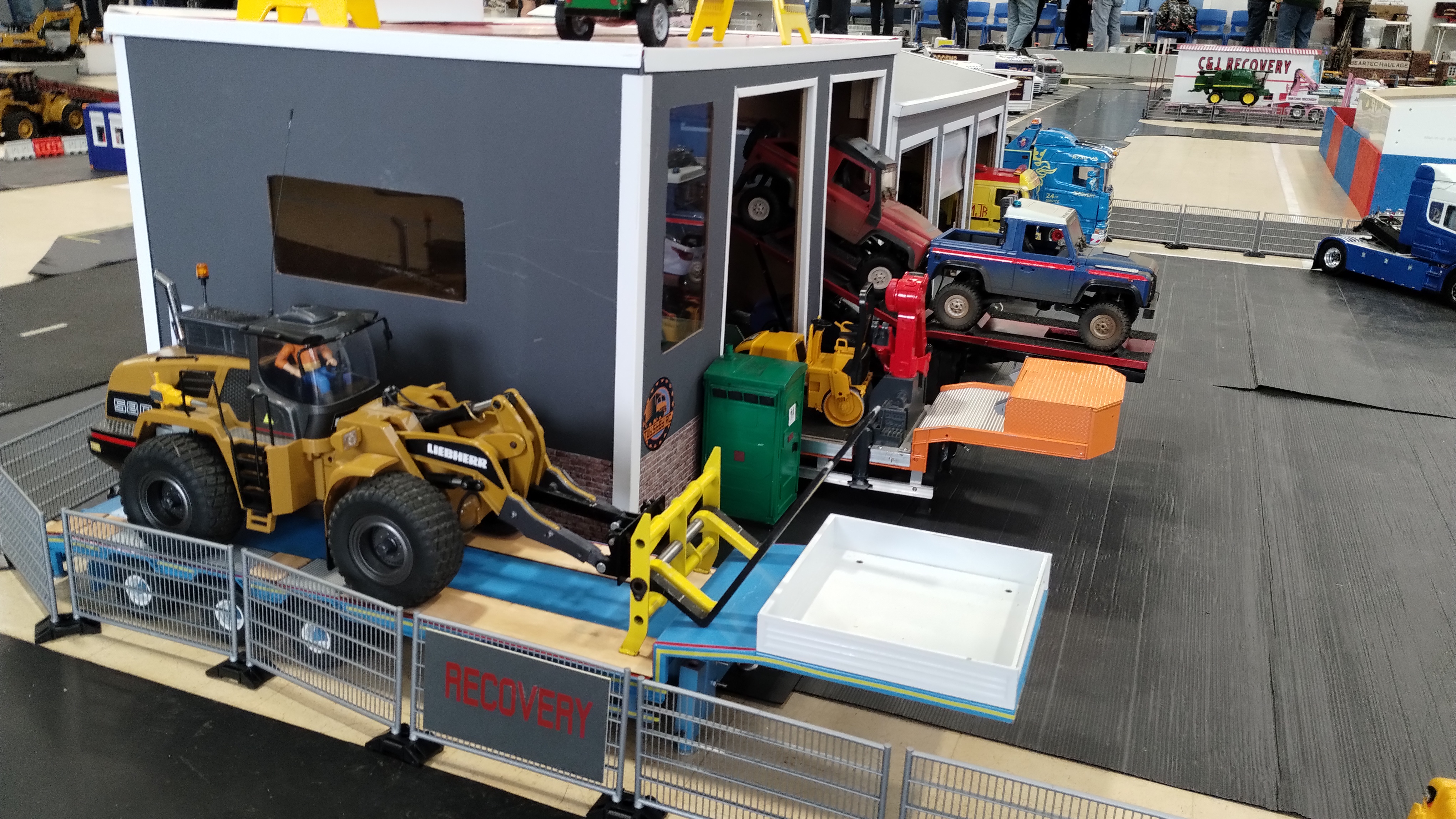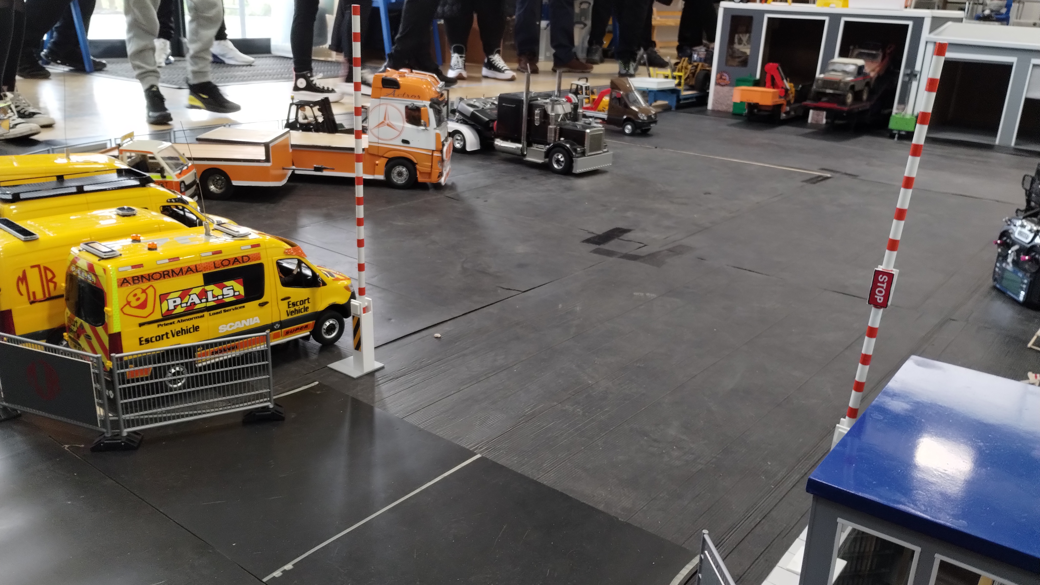 The Crew is always there early doors, ready to unload the trailer and all the other bits. First though we have to clear the hall of school bits. Then we can start with unloading the trailer, setting up tables and chairs in the hall and kitchen. Setting out the signage, getting the reception desk set up, starting the boiler and setting up the food area. In the hall the layout is going down plus around 20 sets of base sheets for the yards, Fuel station and shop, hedges, quarry area, and more. Then the yards build starts around 9:15. Will all the people turn up and how many. Well, shortly after that people started to arrive, bringing their trucks unloading cars, registering attendance and we see what we have achieved.