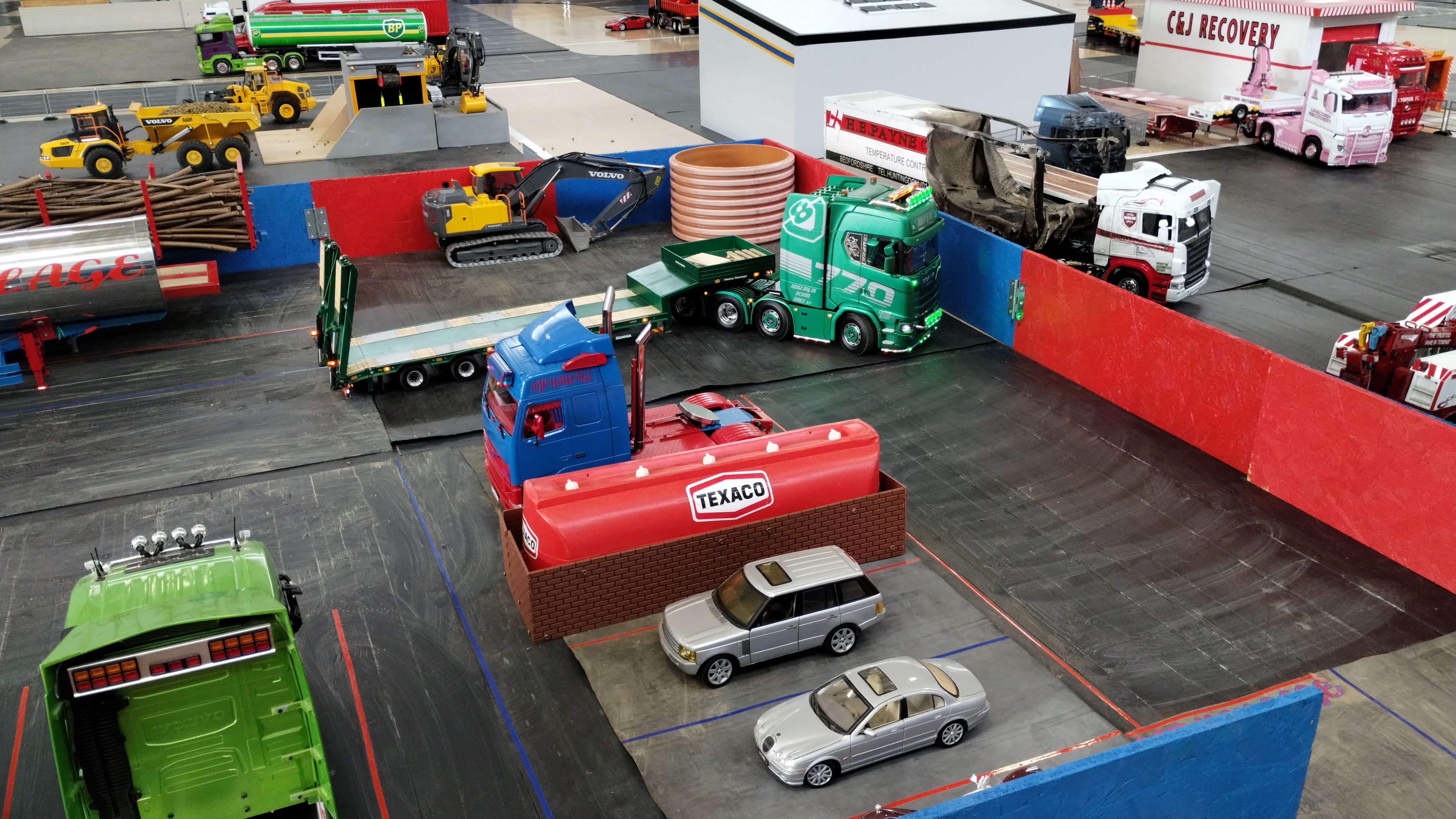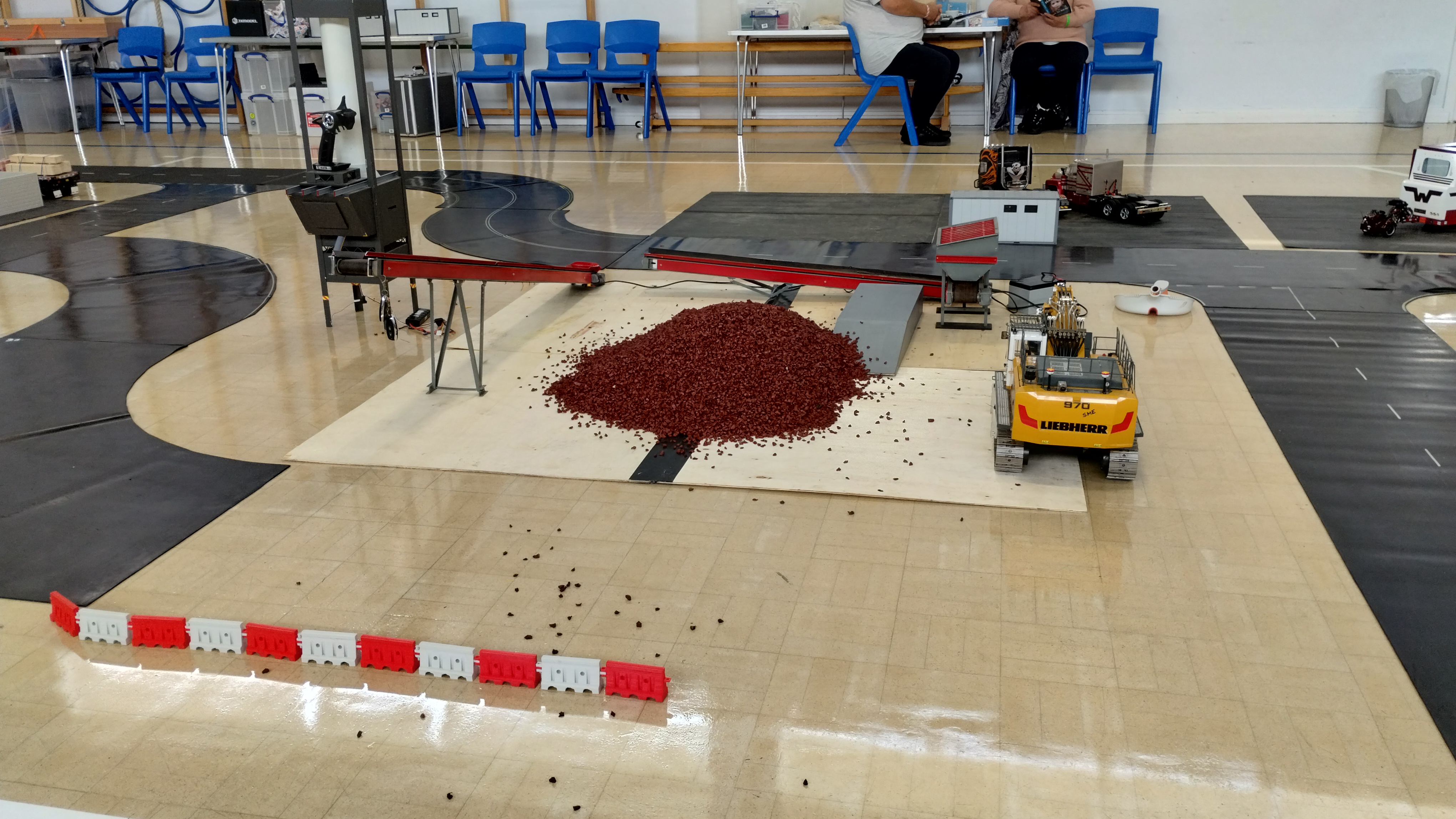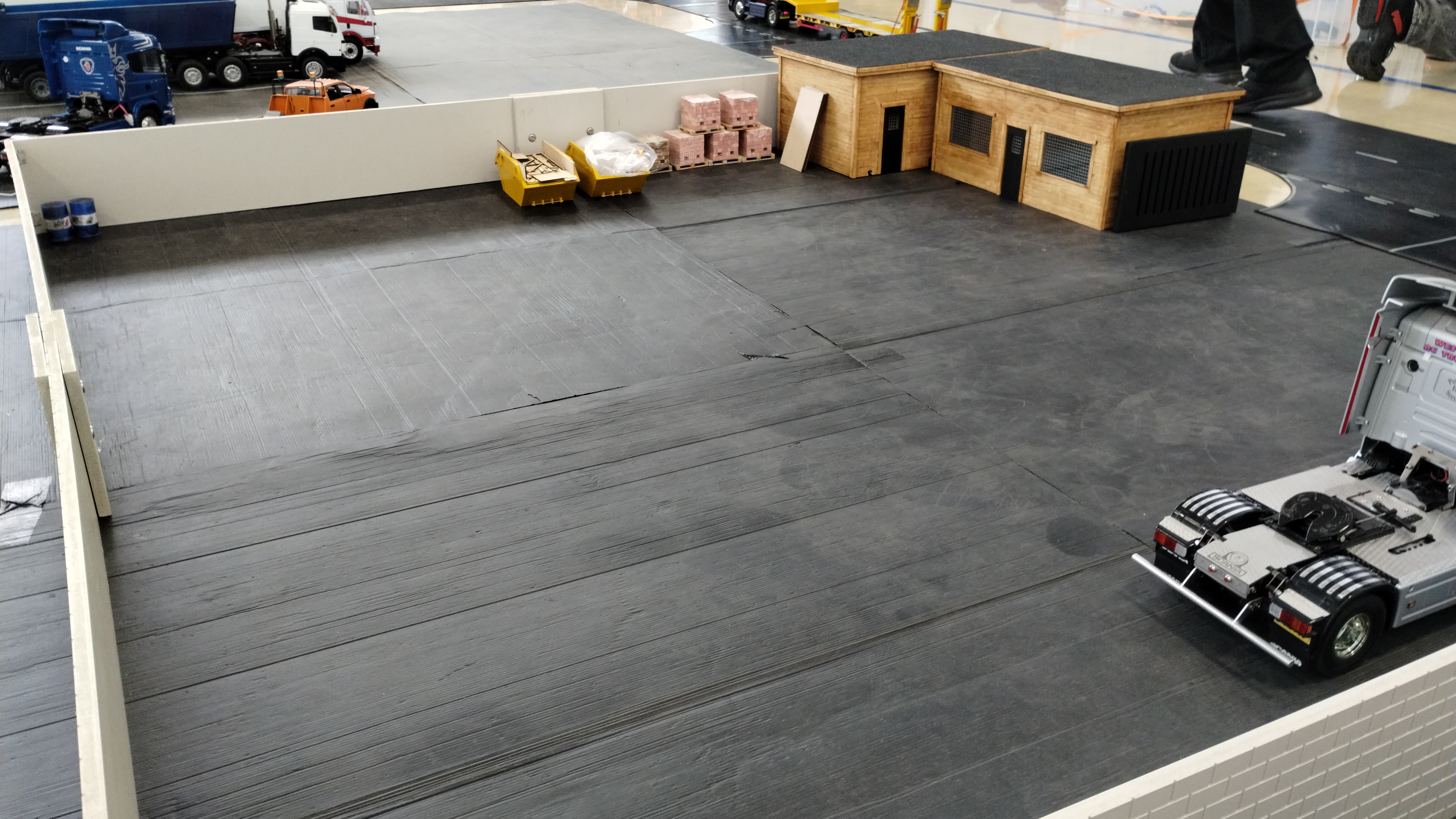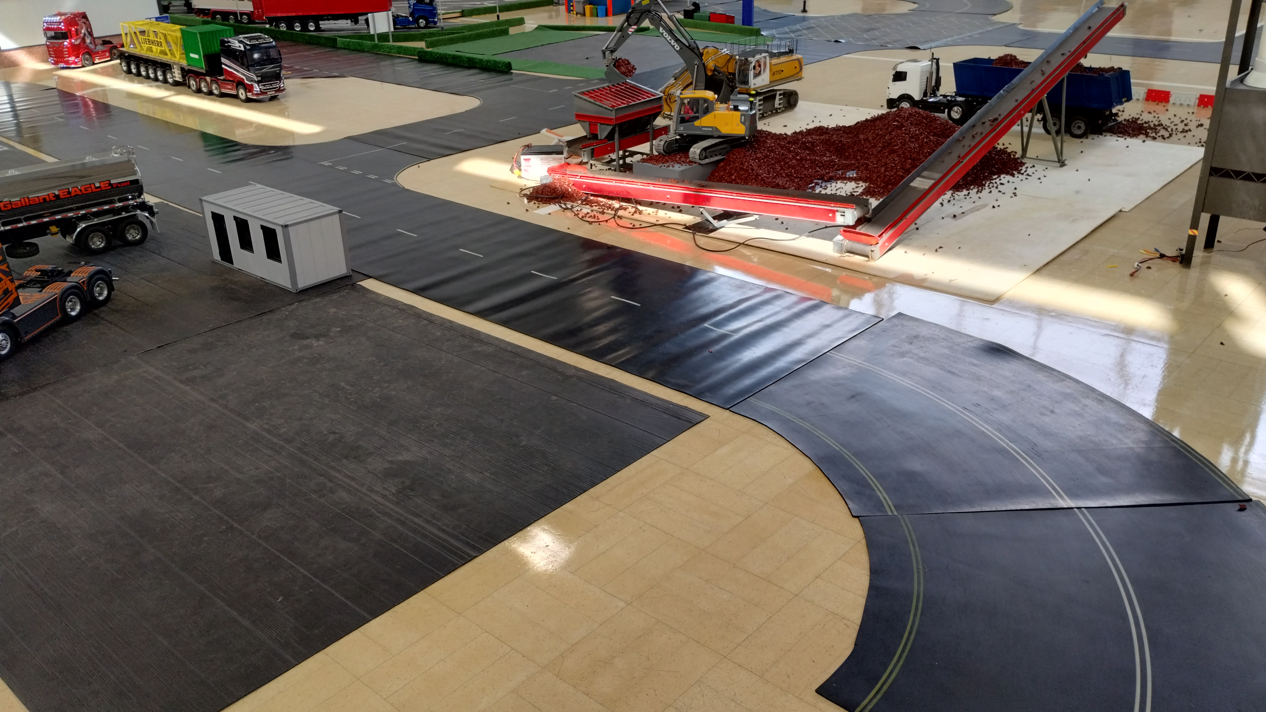 So come the summer we had a bit to do. You will have seen some of it (e.g. the new box crossroads, snack van and various bits, silo tower etc). There is more in preparation but come September our biggest concern was the state of the roadway. We booked the hall for the Saturday but could not get in until 17:00. around 6 of us arrived with the track, layed out tables and washed the track outside, dried it, repaired bits, consigned some to the skip, marked it up so we know what's what. Inventoried it ( I must attend to that) and layed it out as close as possible to the layout. Sunday was normal but it seemed to take forever to get the layout done. Suffice to say that we were all shattered!