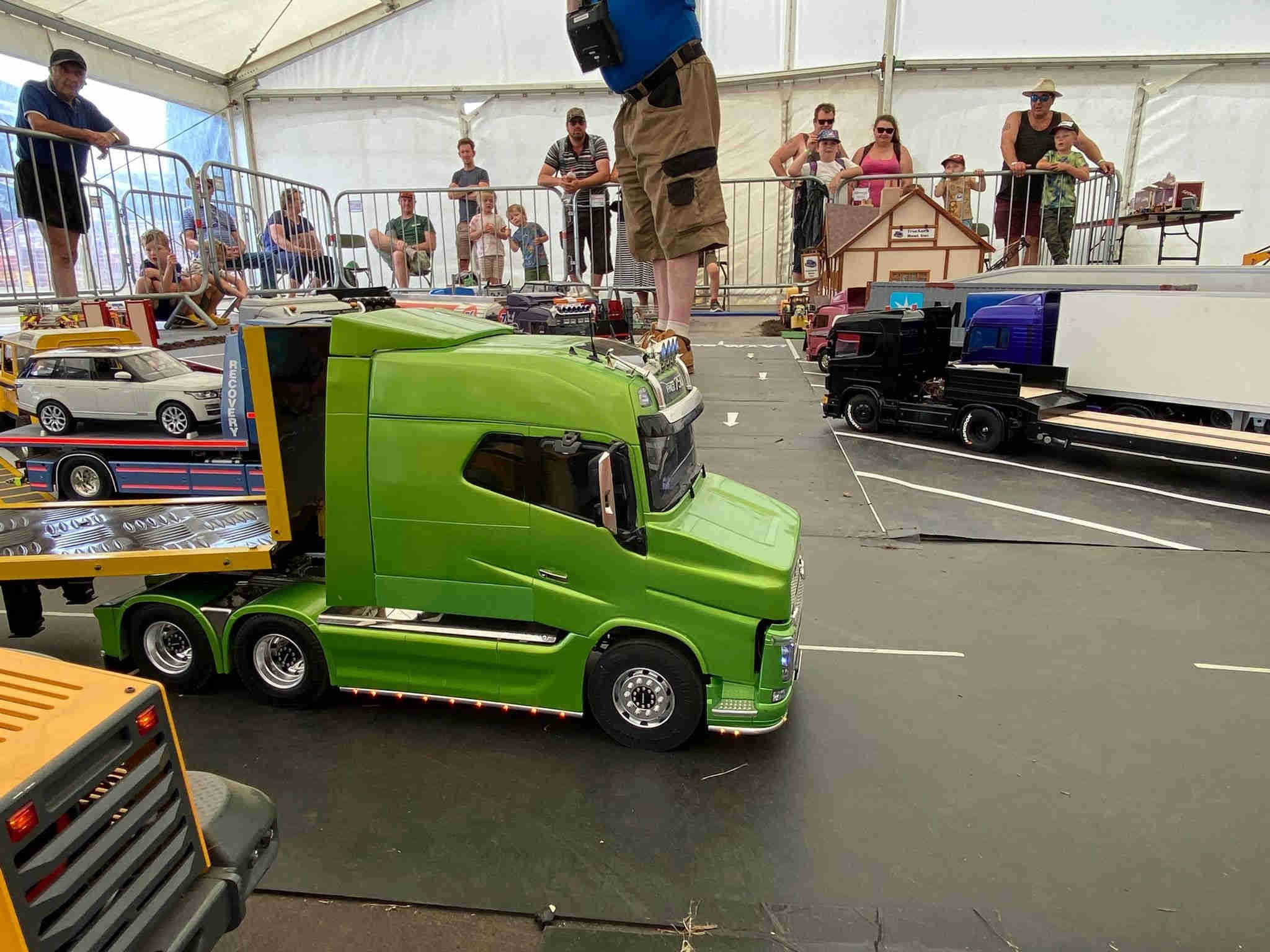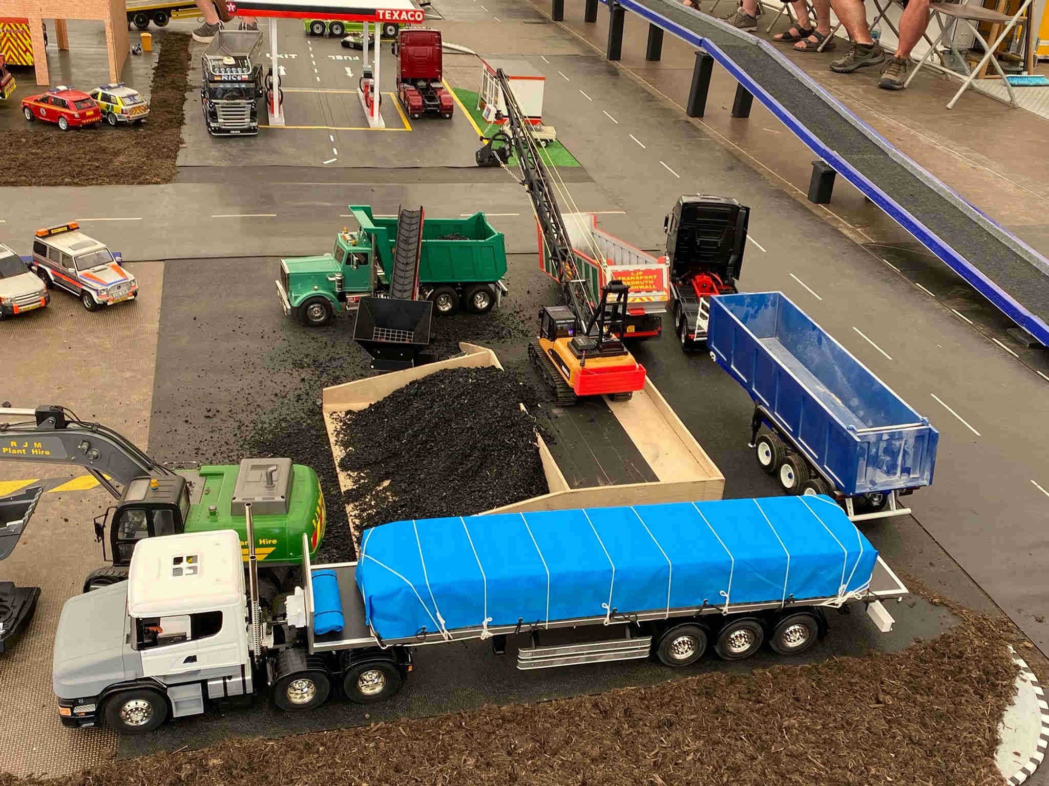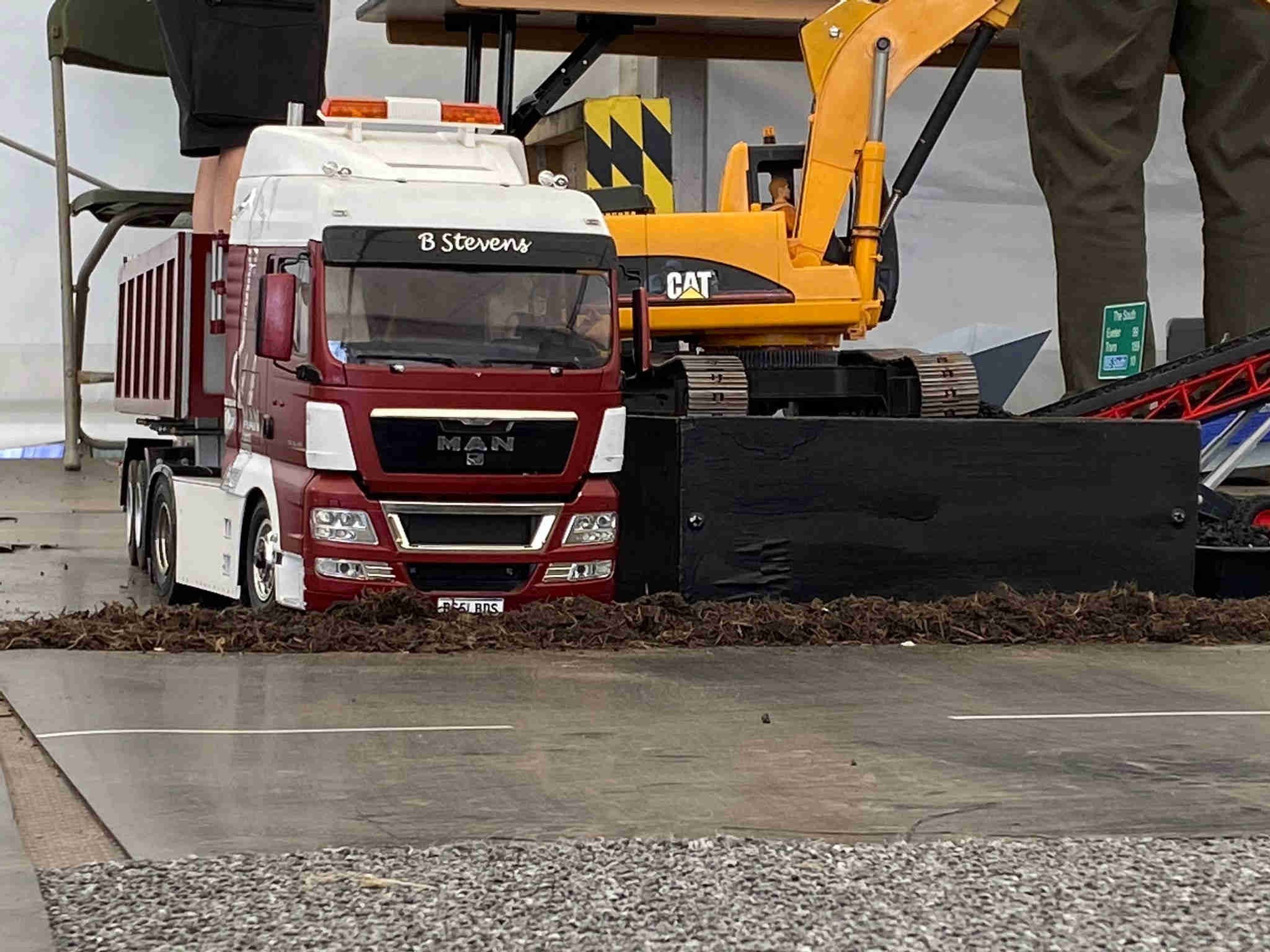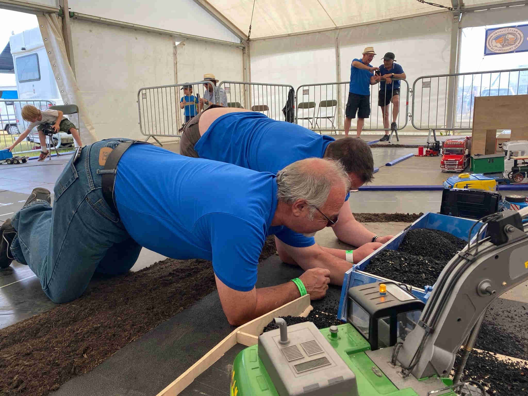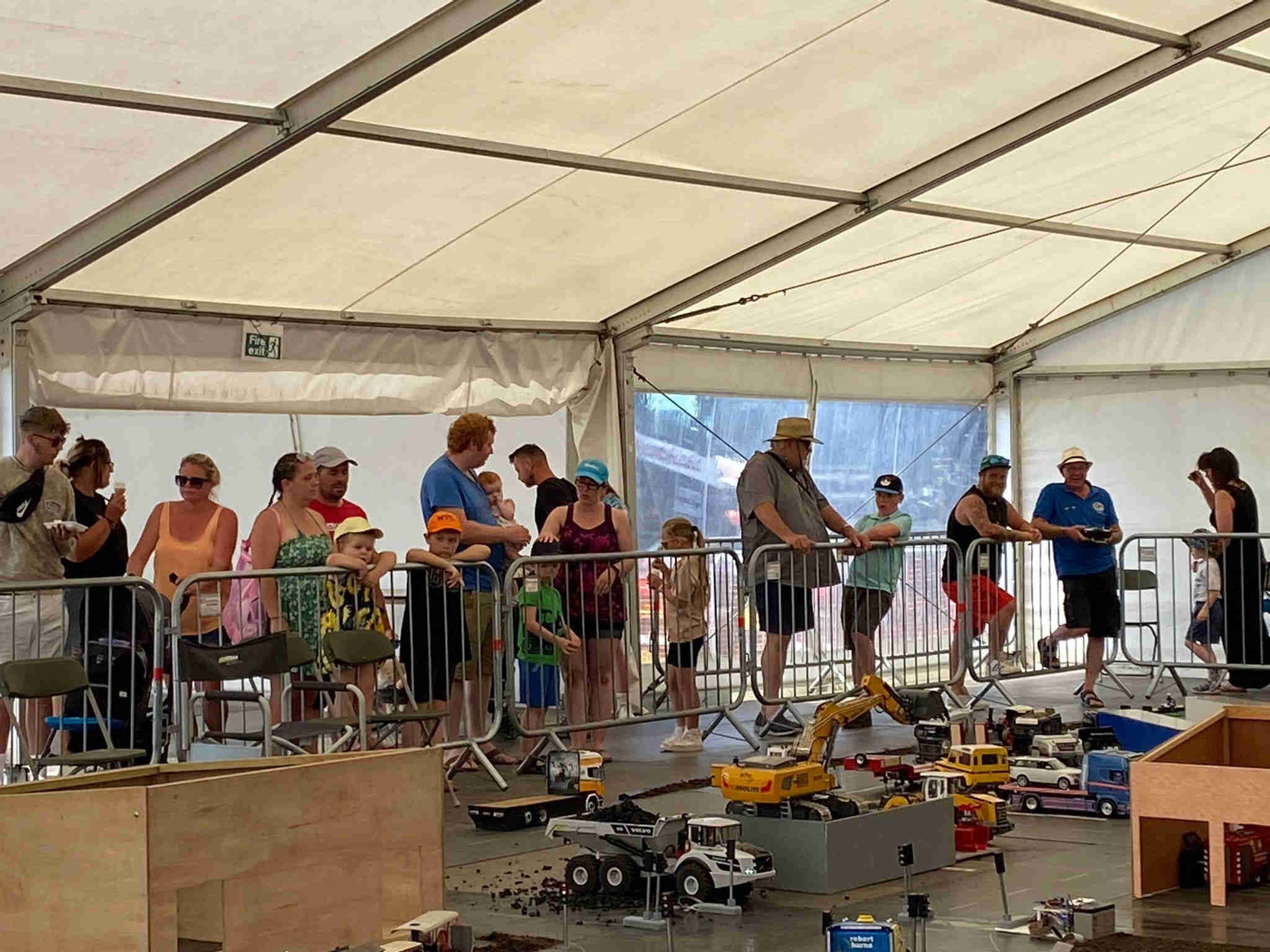 With brilliant sunshine blazing down Saturday morning was upon us, and the gates opened, and the crowds appeared, with a bit of planning we had allowed a bigger viewing area with seating, so visitors could escape the heat. The trucks were running, and the crowds were entertained, we are really lucky to have some local models running, Dave James with his Dennis Oates trucks, always a crowd puller in Cornwall, and Lee Shepherd’s fire engines, modelled on the appliances based at Tolvaddon, a few miles away from the showground, and Duncan Perryman’s Scania 4 series, with Trelawny’s Army image on the rear of the cab. “Sum bleddy ‘oss, innum”. With Allan Shilletto’s digging area located at the front of the layout, there was plenty of action, with two other digging areas operating, there was always something going on.