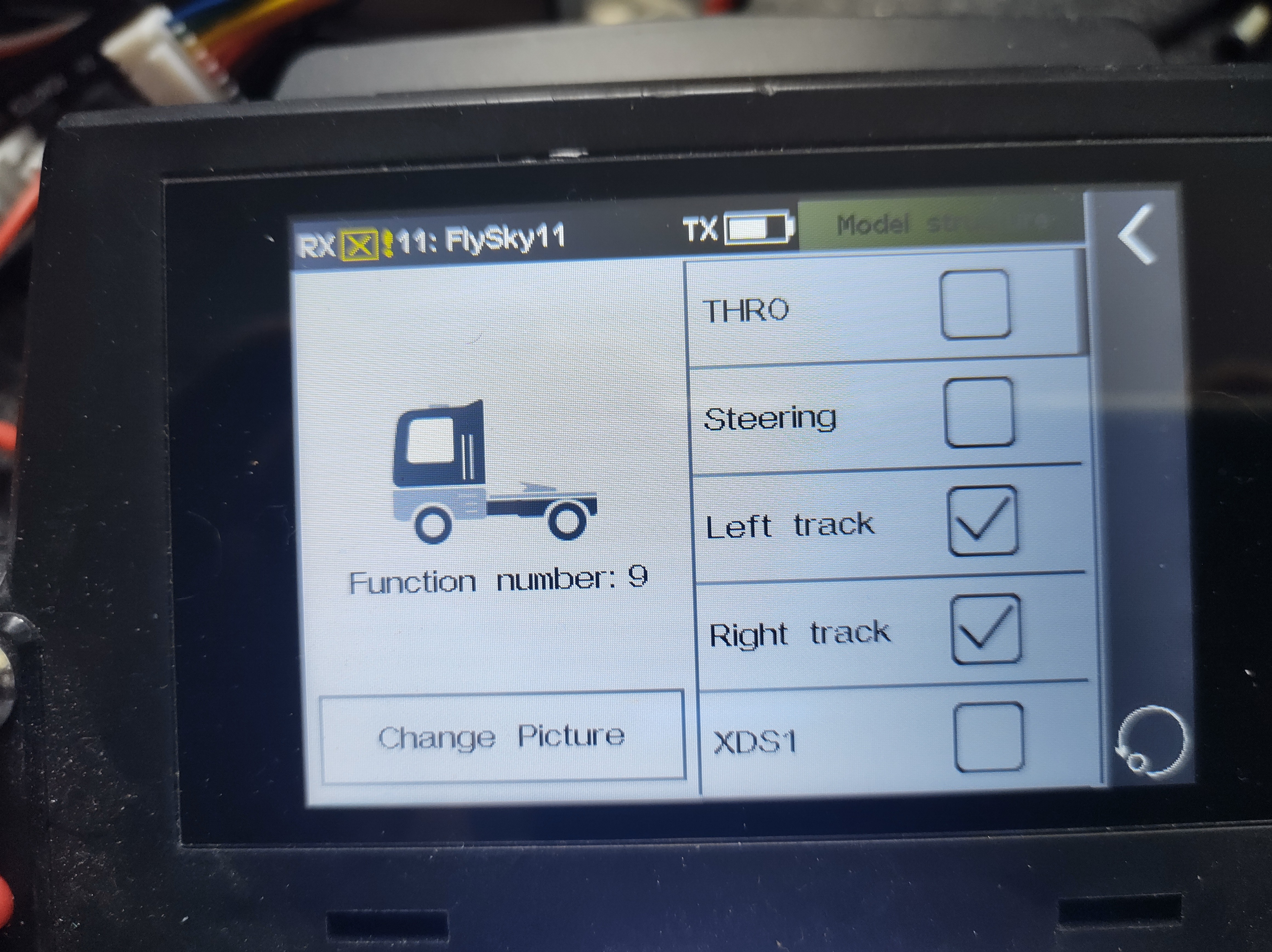 Below this is Model structure. Here you can select the model picture and choose some pre programmed names for your channels, This picture shows left and right tracks but touching the box will select or deselect the options.