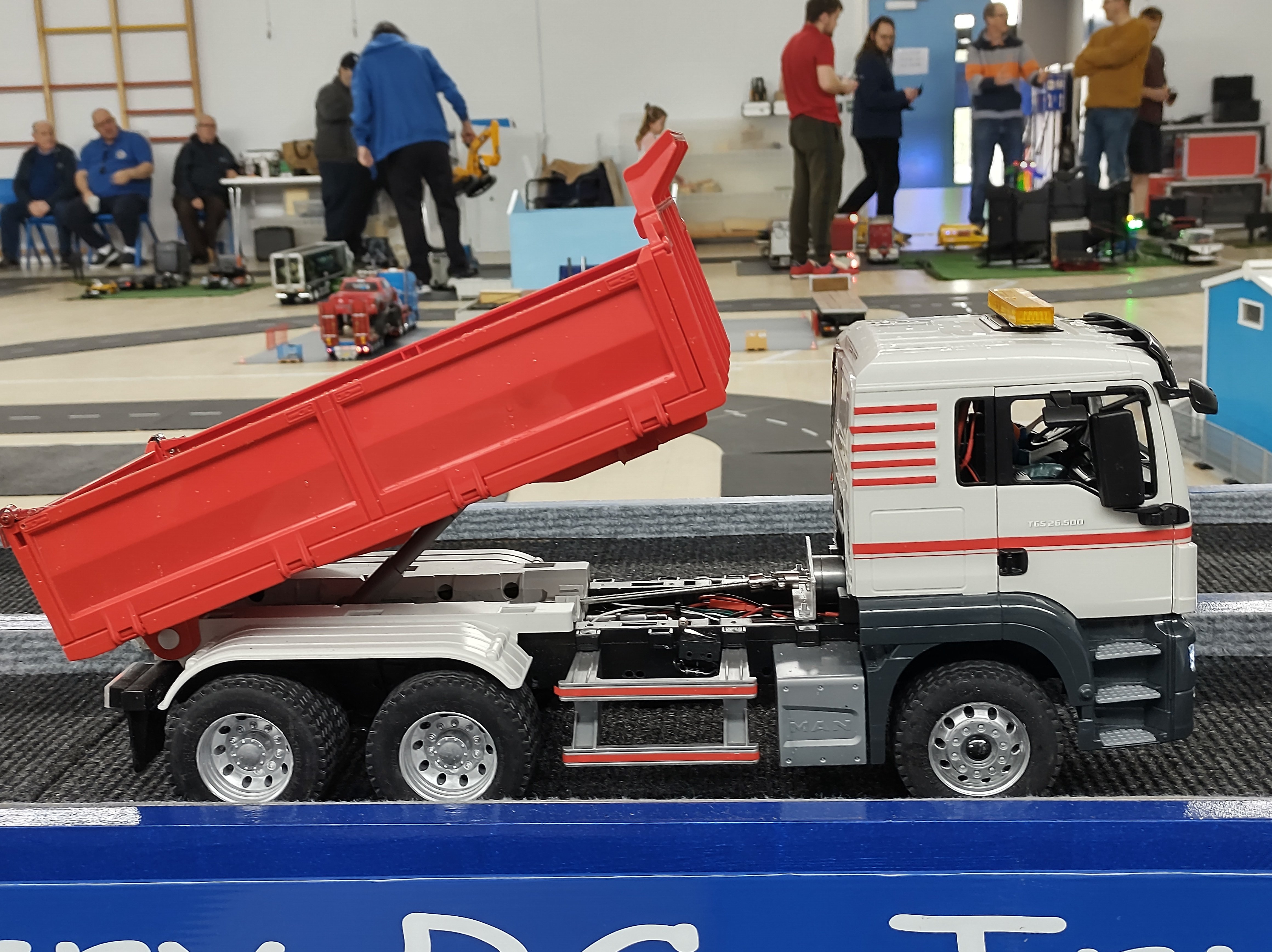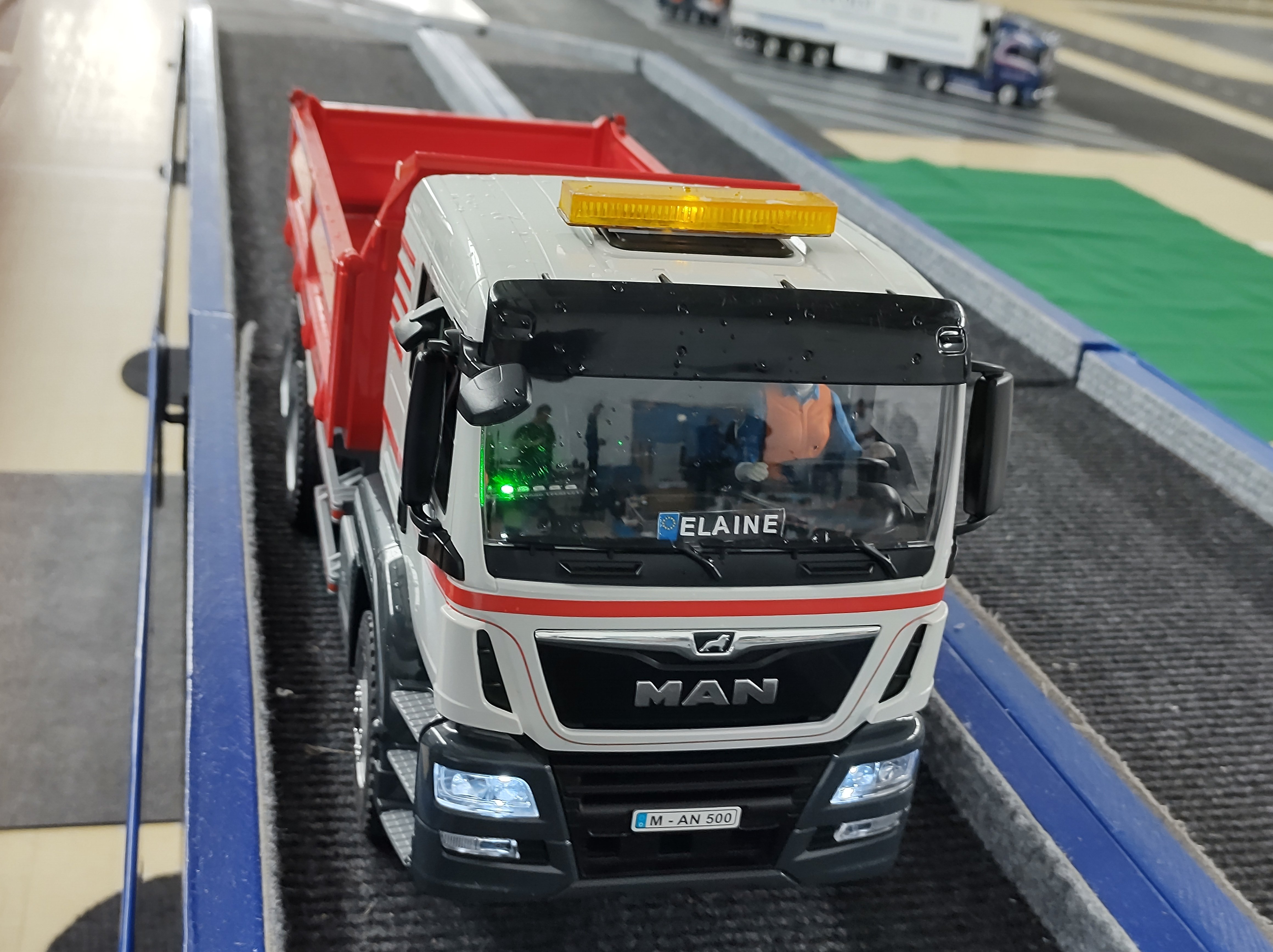 It is based on a Bruder MAN tipper and was purchased ready converted. It runs, the tipper works, it has lights and a beacon bar. Bruder trucks don't have any running gear and the wheels are hollow on the inside face, they take some bashing as they were designed for children. From the pictures you can see the front axle, it is hand crafted from a piece of Aluminium bar and it has a simple central pivot. there is also simple stub axle holder on a pivot for steering. The rear drive looks to be from a Chinese toy rc truck and has limited suspension. The tipper runs on a small motor via a flex shaft and scissor gear.