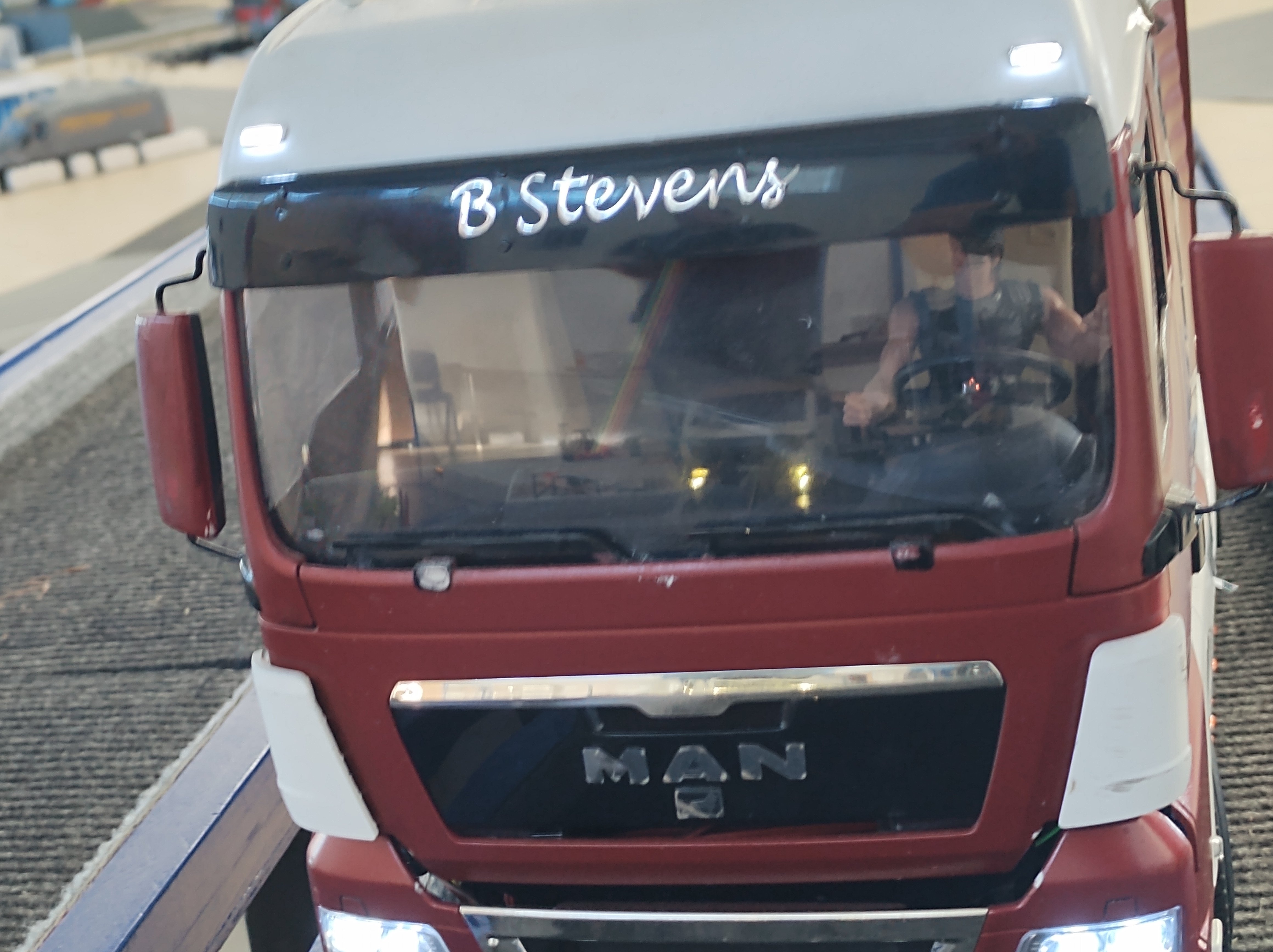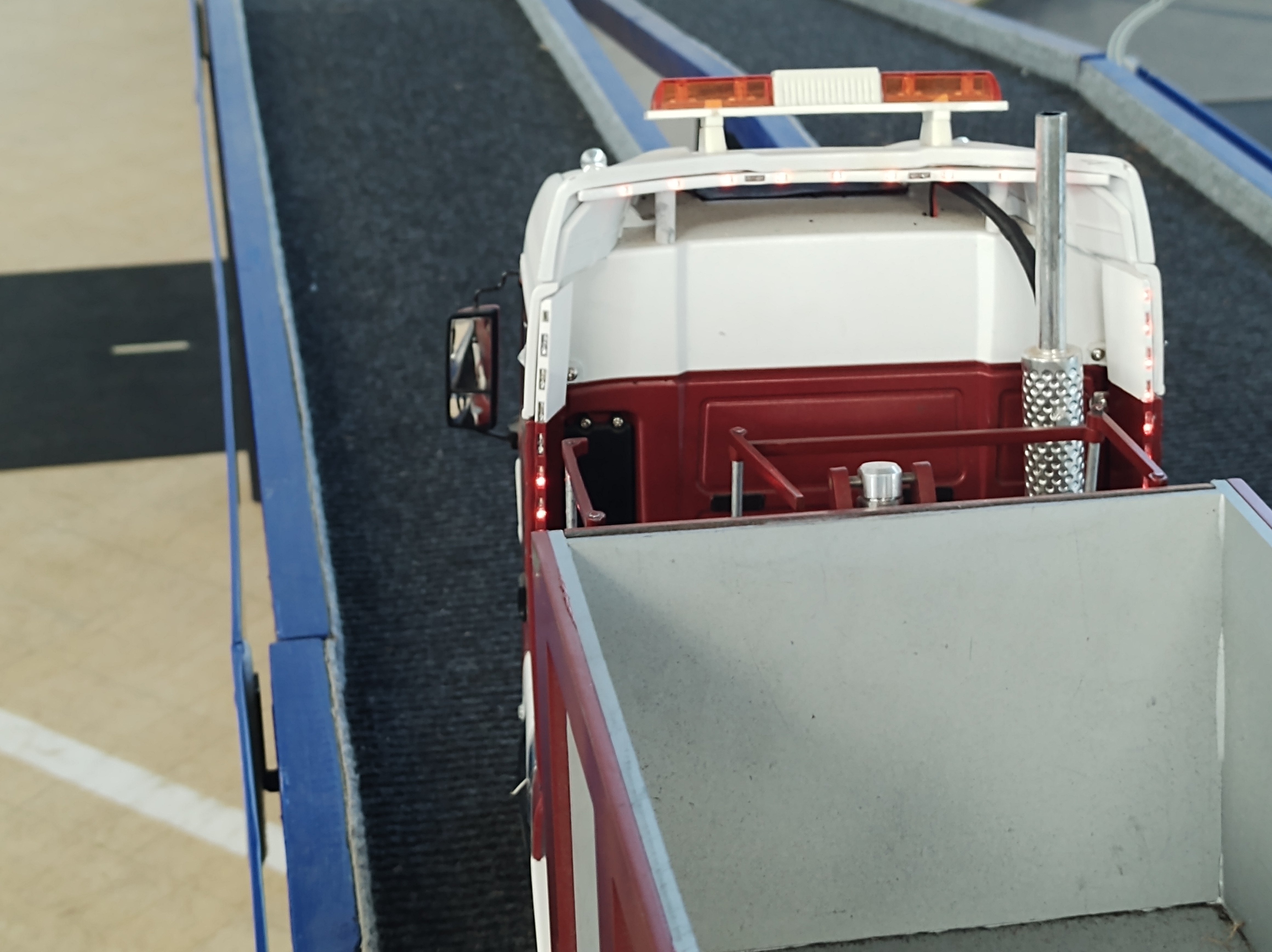 The truck was built a number of years ago ( 6,7 8 or maybe more). ESC sound and light are from servonaut which gives great control and good sound. Other upgrades from the kit include Aluminium wheels, full working marker lights and the cab rear perimiter lights, which include working indicators. The roof features a working beacon bar.