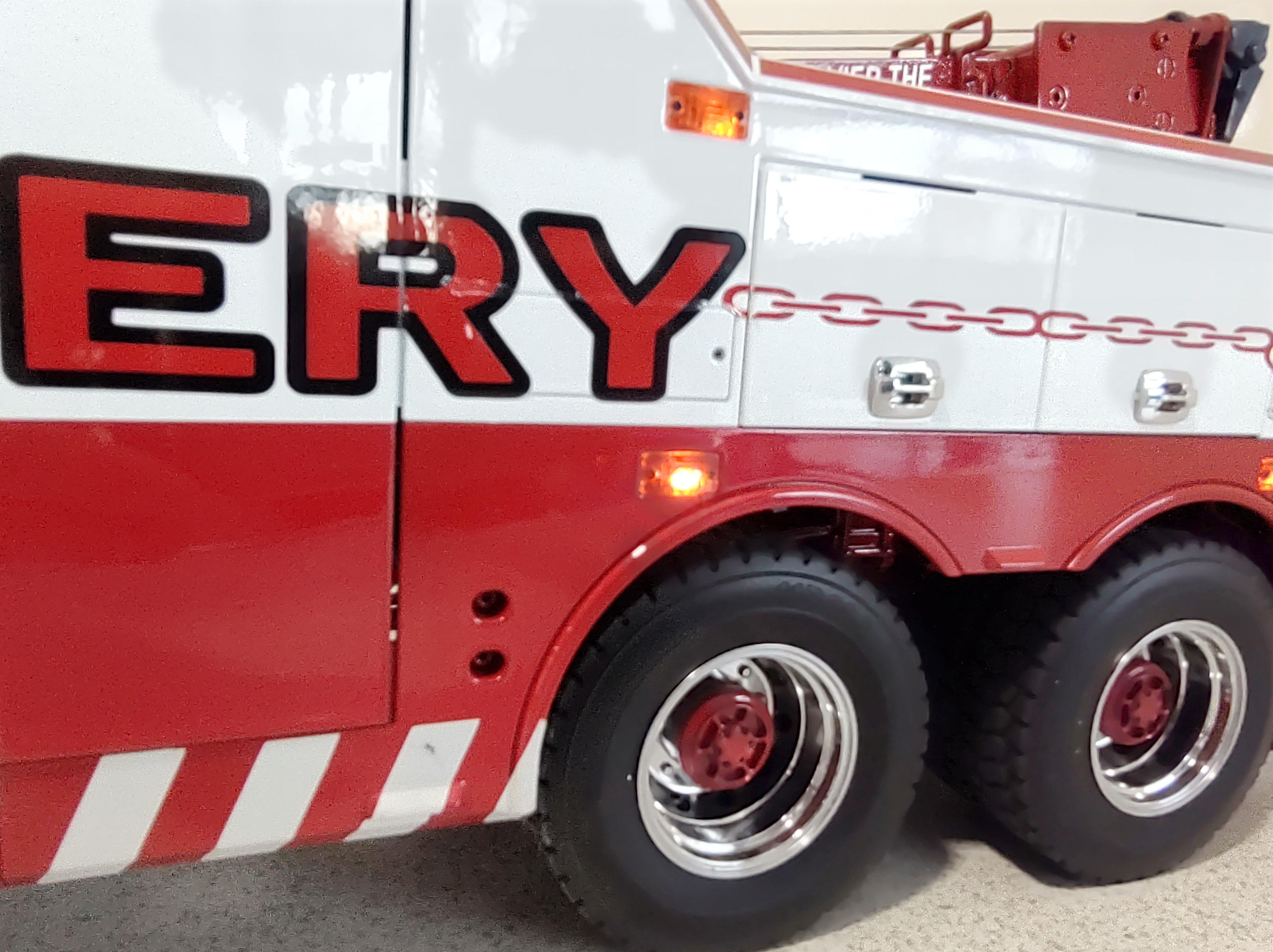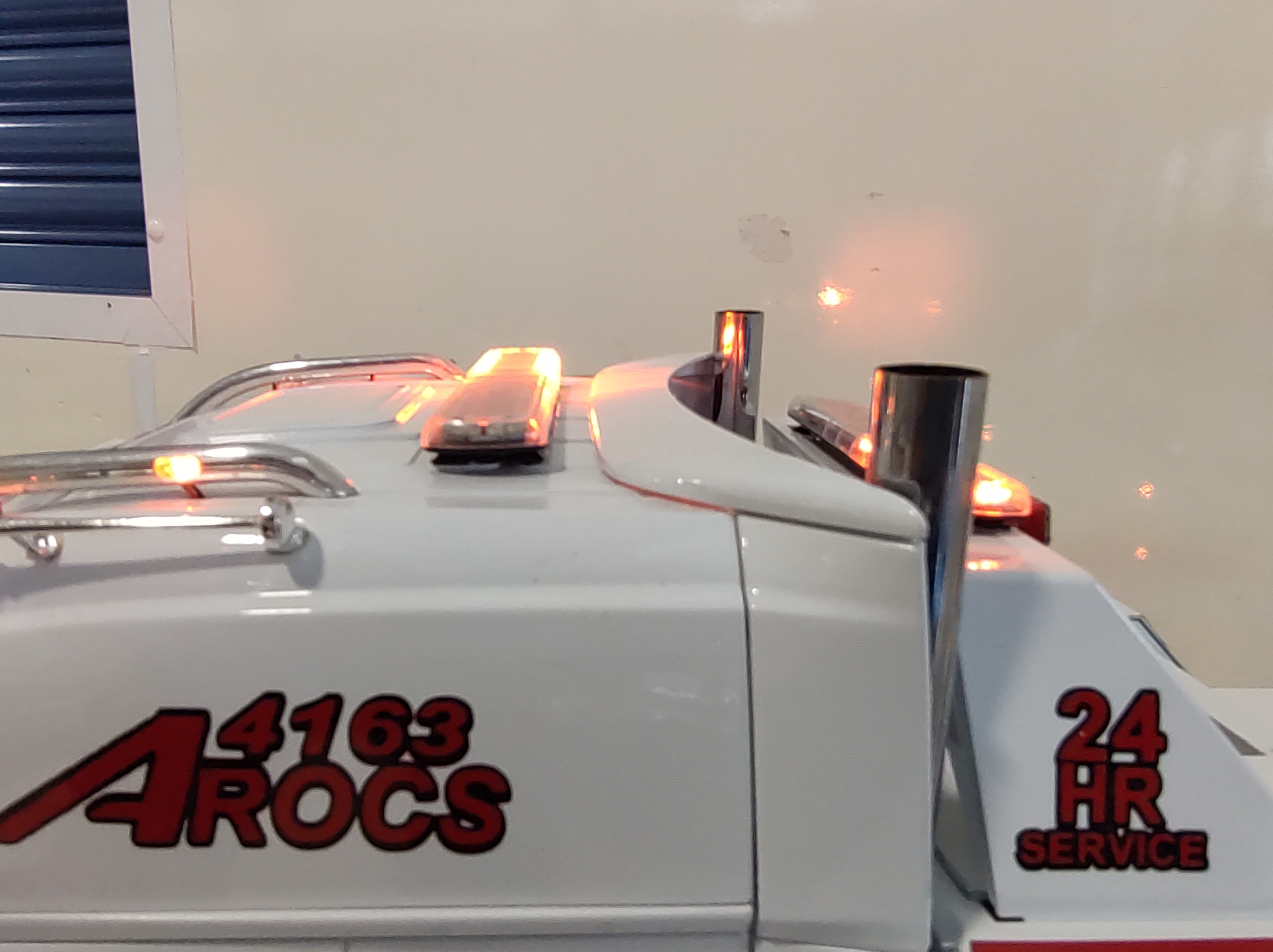 Tamiya's truck is based on an Actros cab but the first change to this truck was the use of a OEM Arocs grill. More additions come in the form of a roof bar from Miroslaw Gorski, two Verkerk beacon bars, Alloy Wheels with in hub reducers, Exhaust stacks, working side marker lights with strobes and more inside the cab.