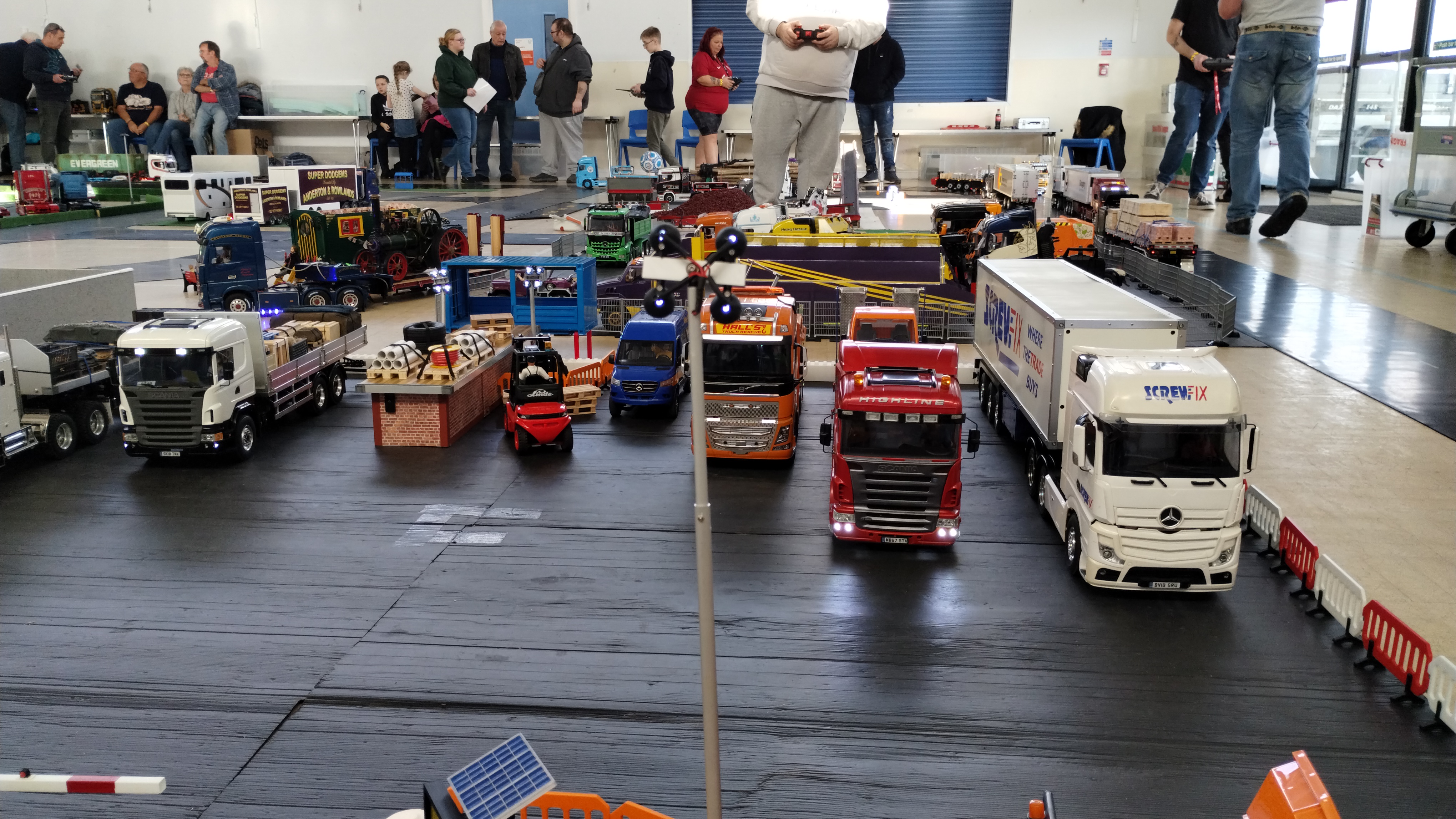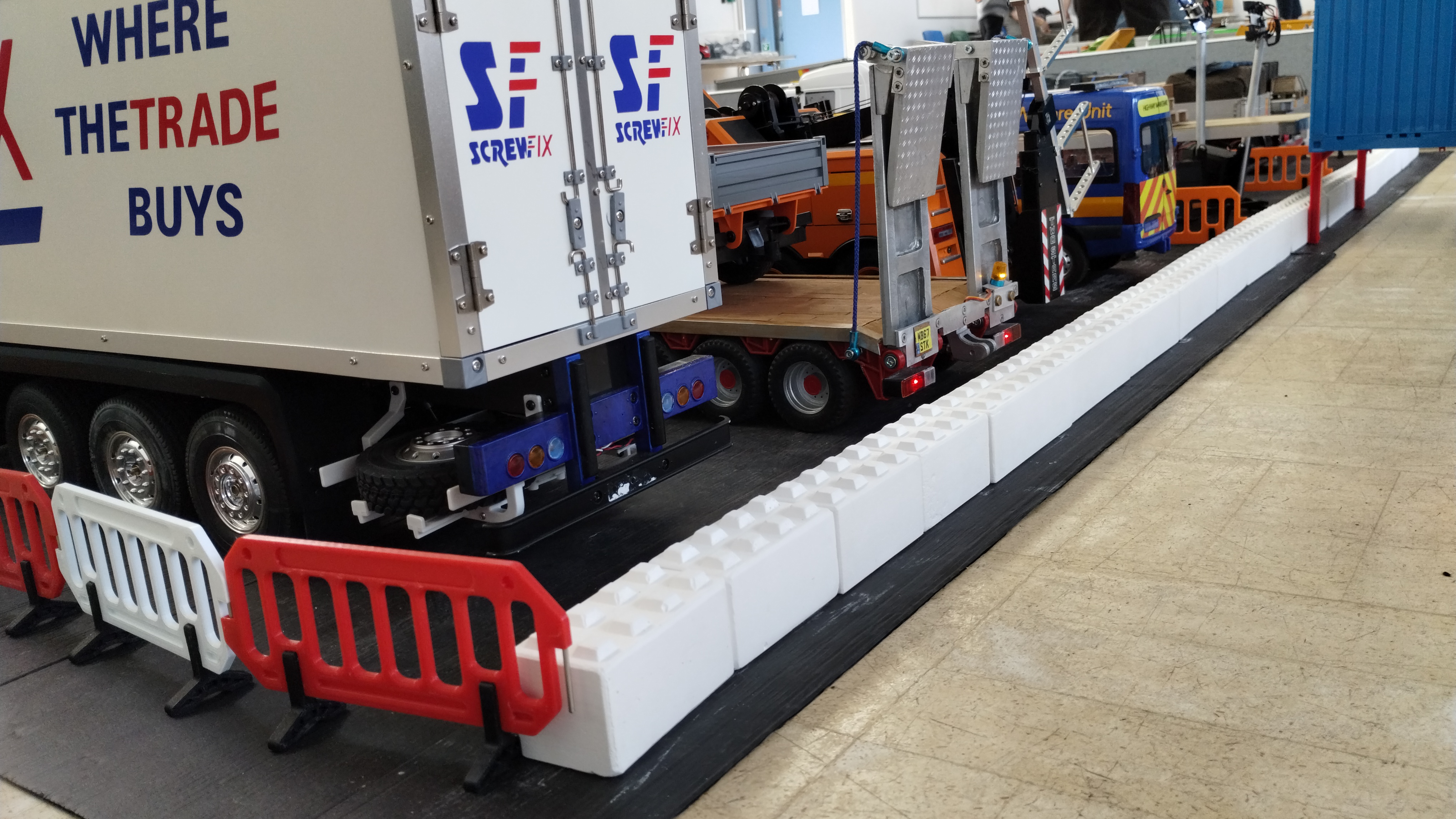 - An impressive lineup of parked vehicles, including a Screwfix box trailer, a Volvo heavy underlift wrecker, Scania low loader, Service van, and a couple of flatbed trucks.