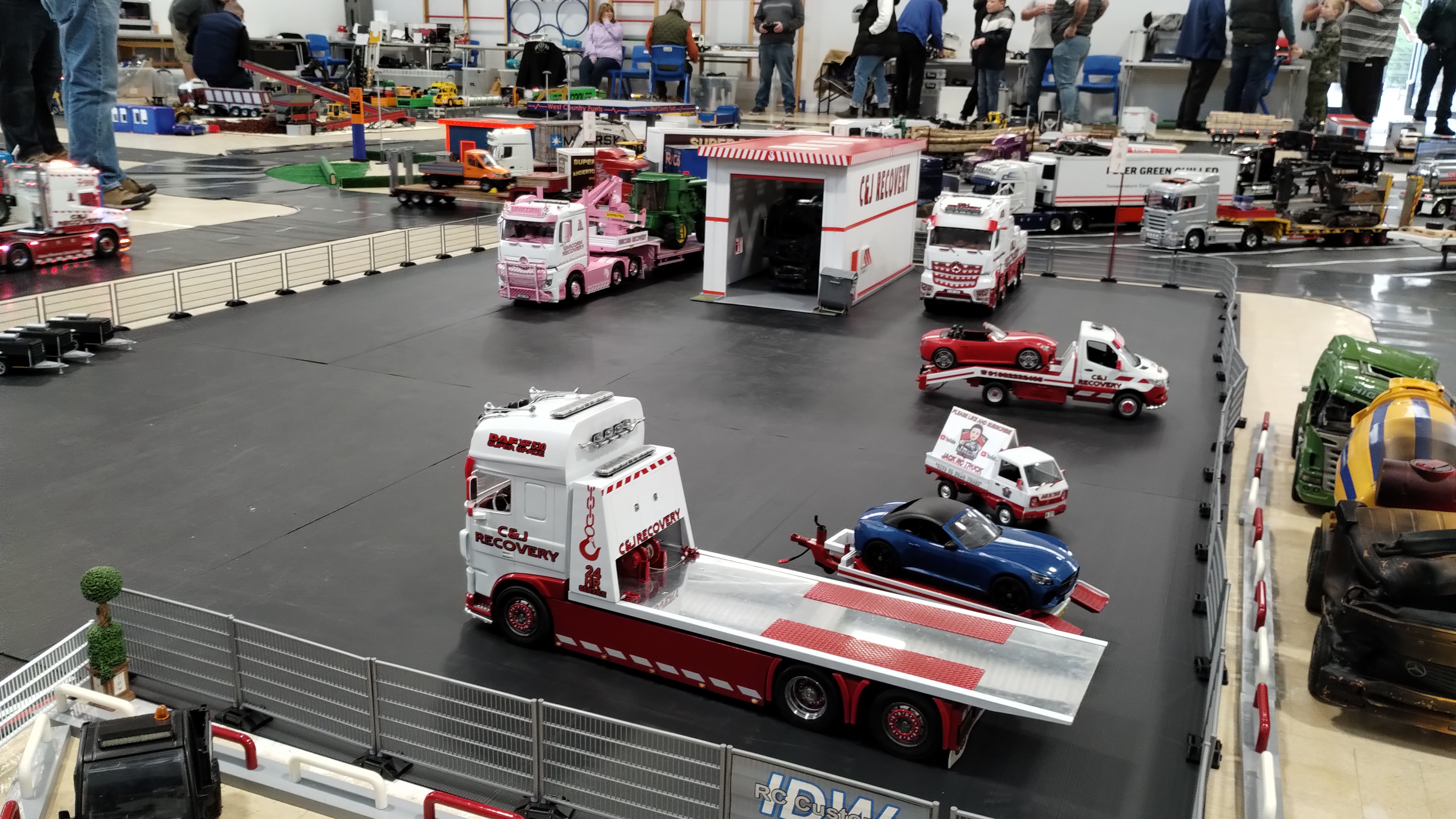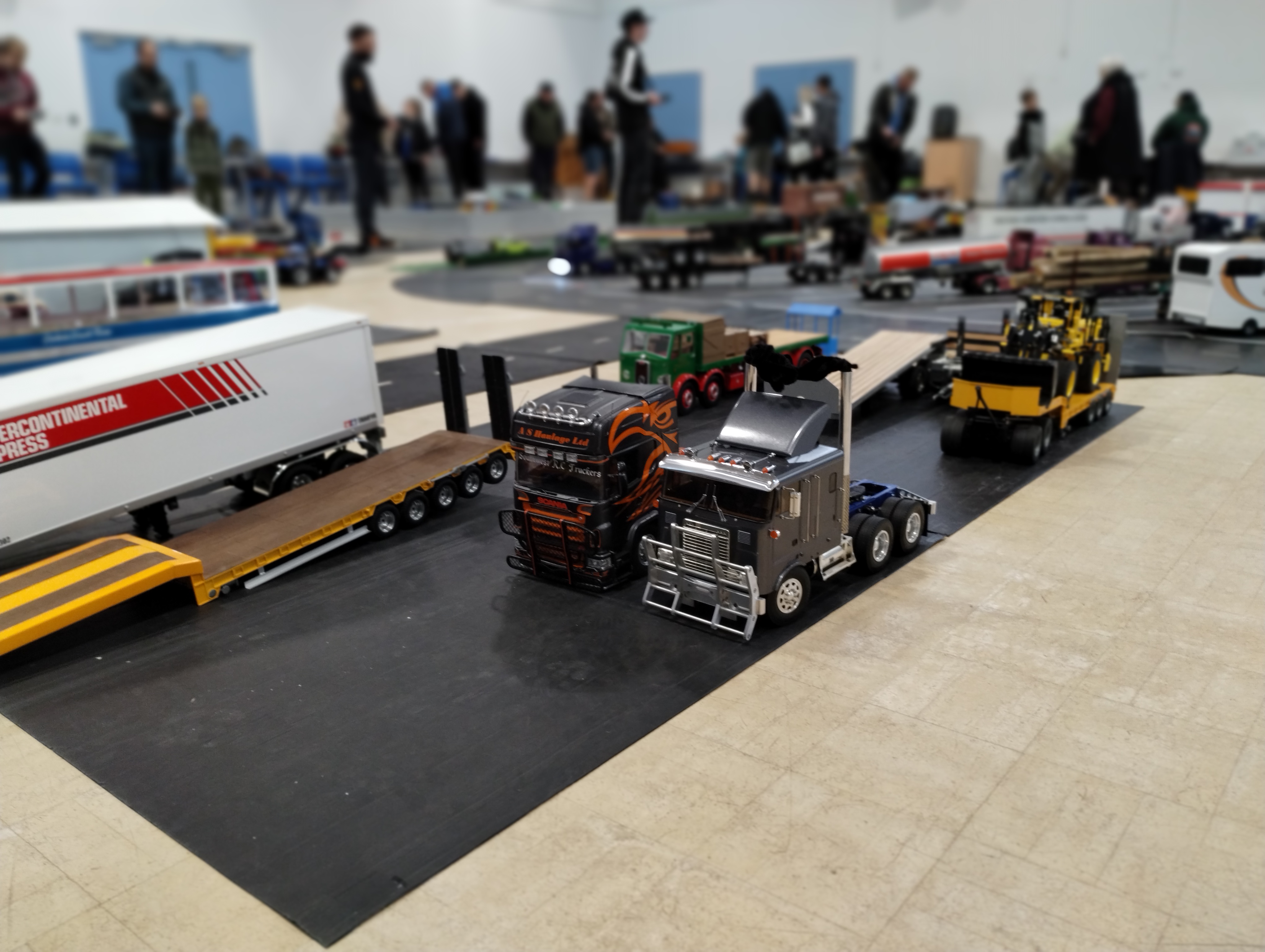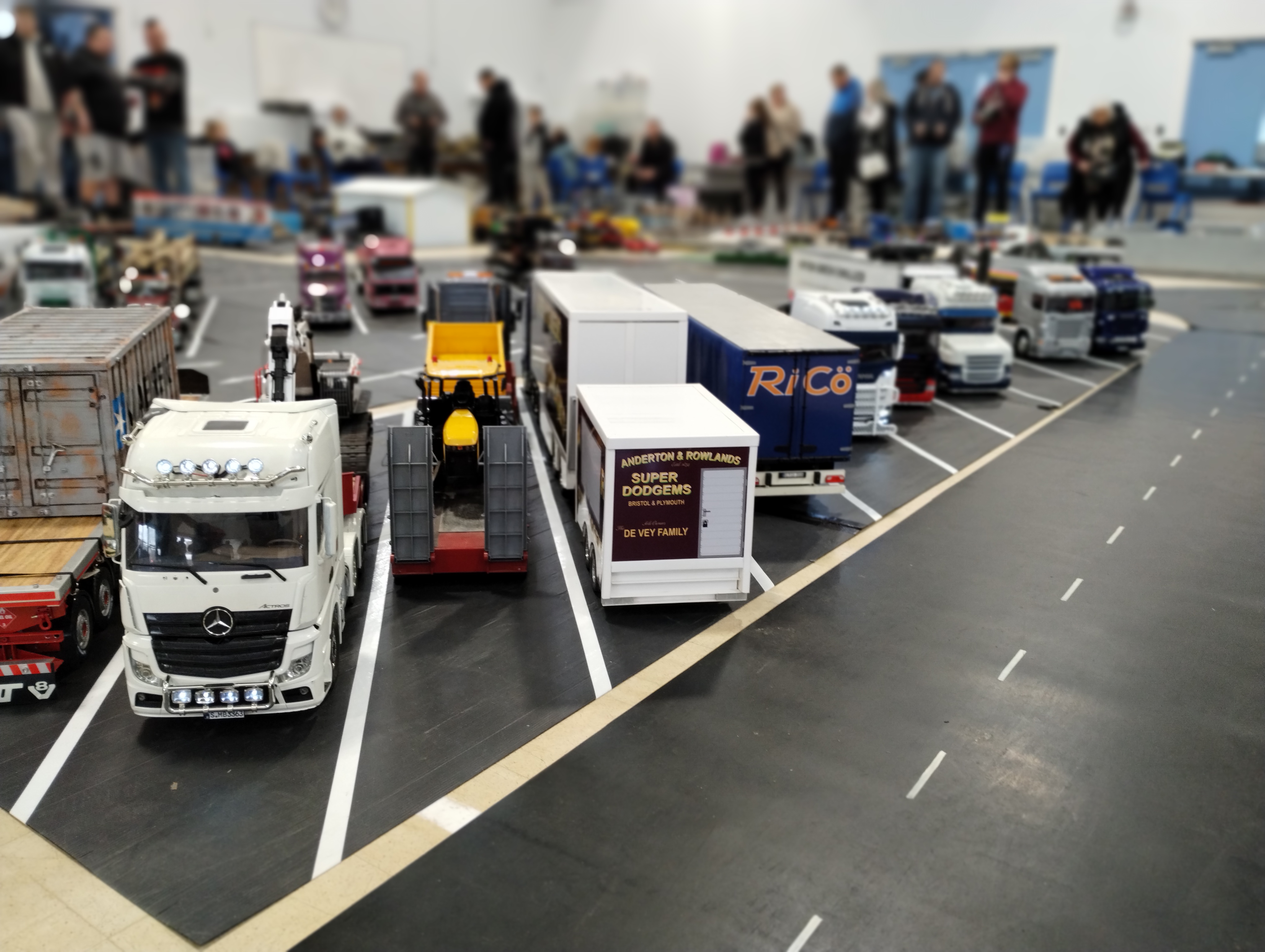 The Crew is always there early doors, ready to unload the trailer and all the other bits. First though we have to clear the hall of school bits. Then we can start with unloading the trailer, setting up tables and chairs in the hall and kitchen. Setting out the signage, getting the reception desk set up, starting the boiler and setting up the food area. In the hall the layout is going down plus around 20 sets of base sheets for the yards, Fuel station and shop, hedges, quarry area, and more. Then the yards build starts around 9:15. Will all the people turn up and how many. Well, shortly after that people started to arrive, bringing their trucks unloading cars, registering attendance and we see what we have achieved.