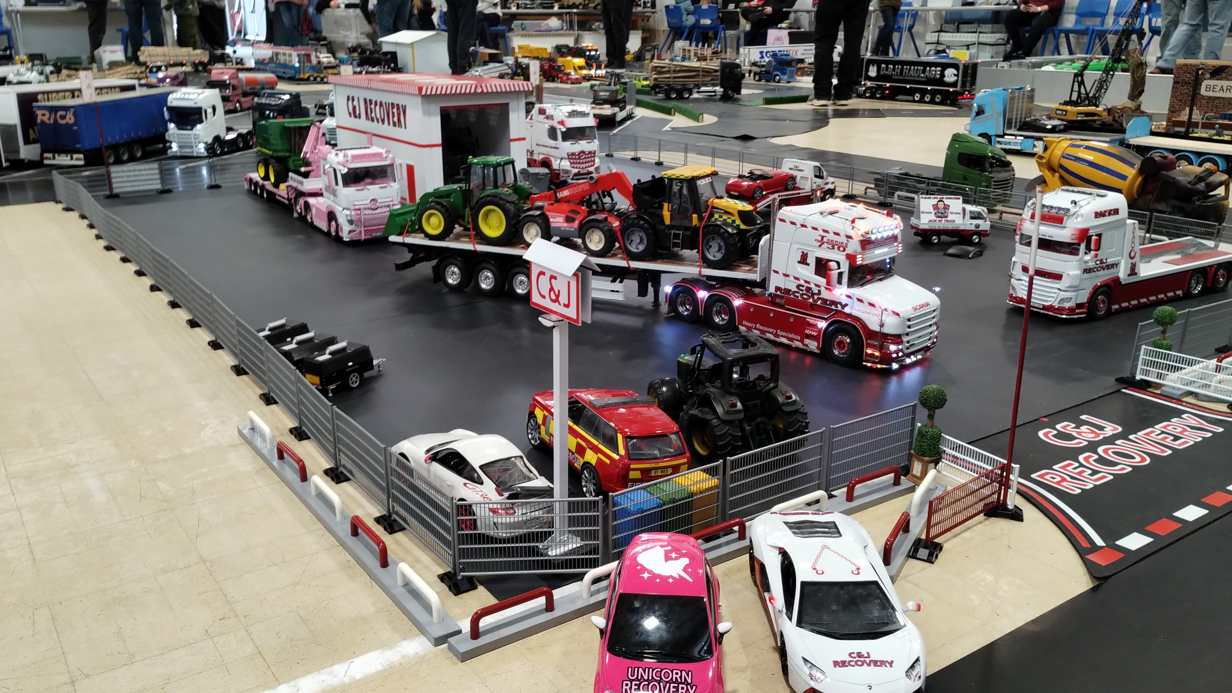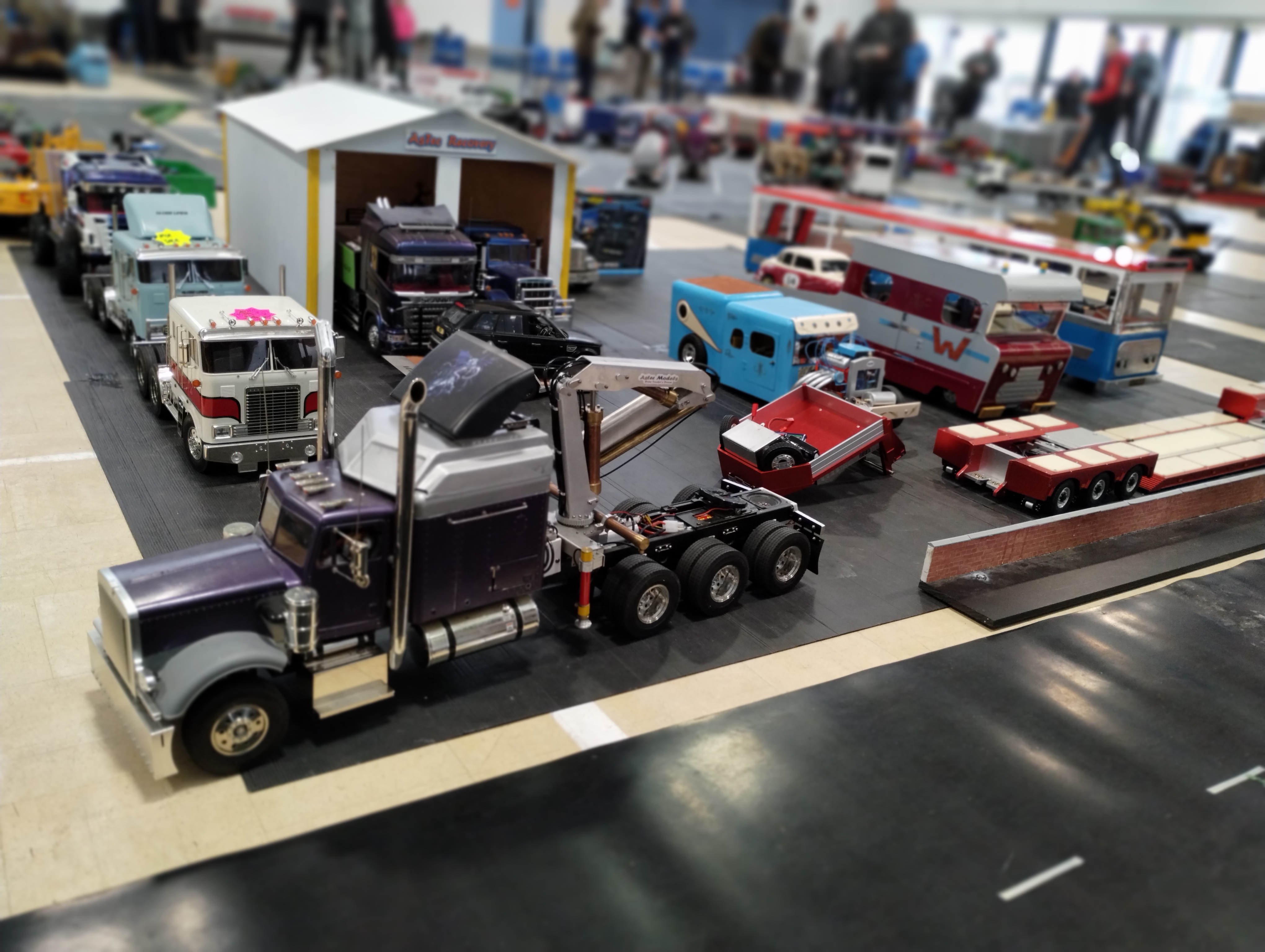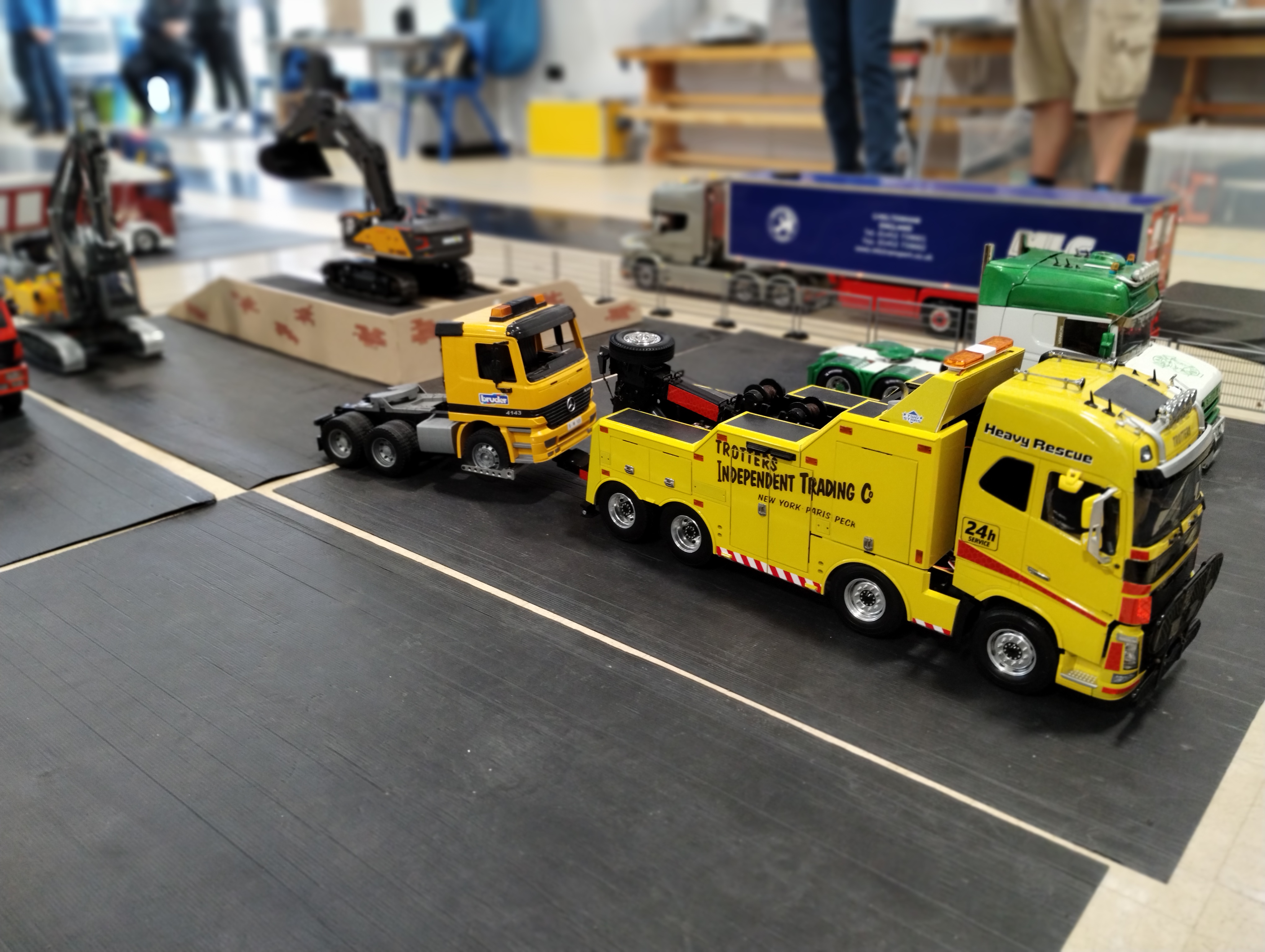 The Crew is always there early doors, ready to unload the trailer and all the other bits. First though we have to clear the hall of school bits. Then we can start with unloading the trailer, setting up tables and chairs in the hall and kitchen. Setting out the signage, getting the reception desk set up, starting the boiler and setting up the food area. In the hall the layout is going down plus around 20 sets of base sheets for the yards, Fuel station and shop, hedges, quarry area, and more. Then the yards build starts around 9:15. Will all the people turn up and how many. Well, shortly after that people started to arrive, bringing their trucks unloading cars, registering attendance and we see what we have achieved.